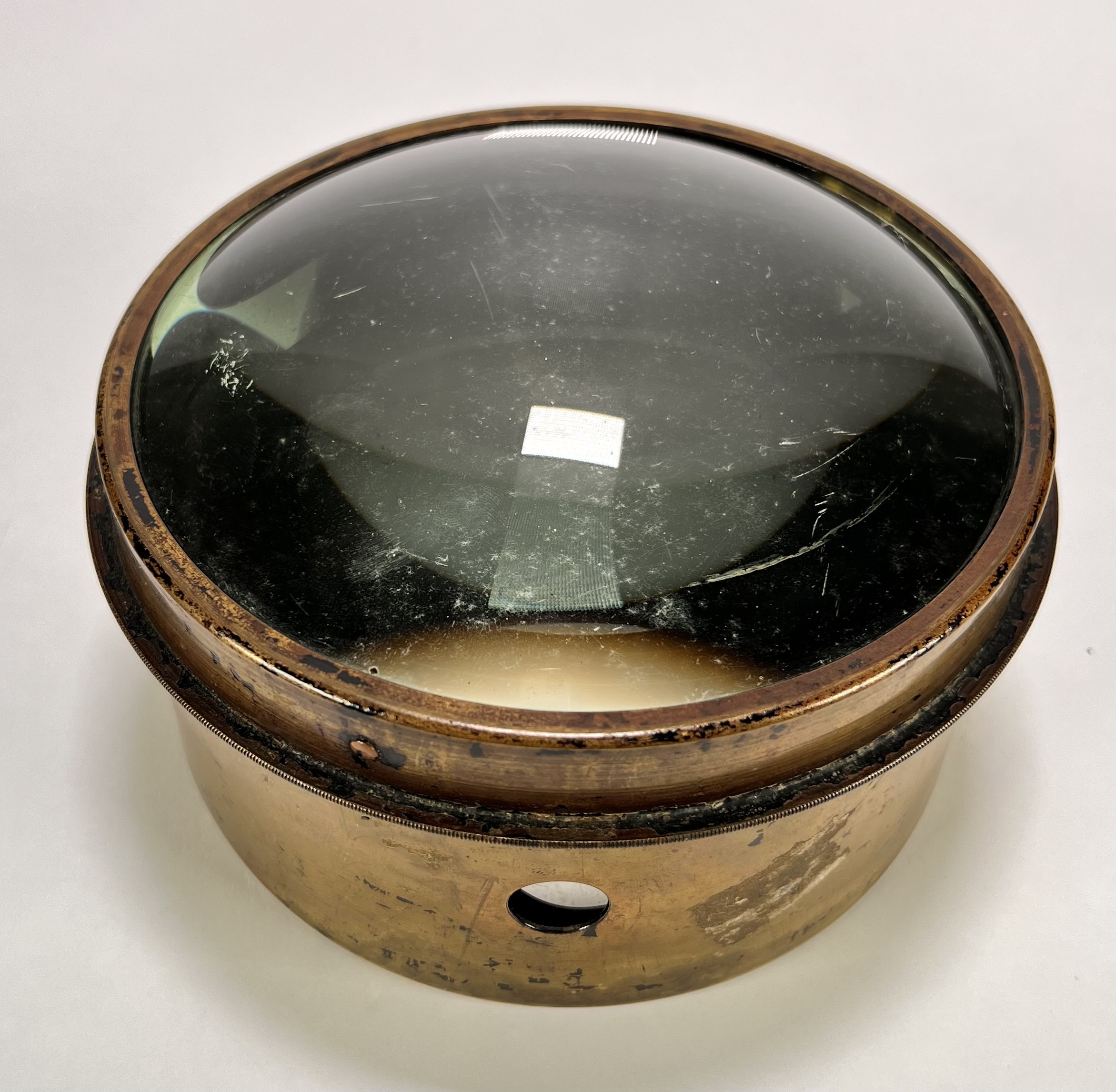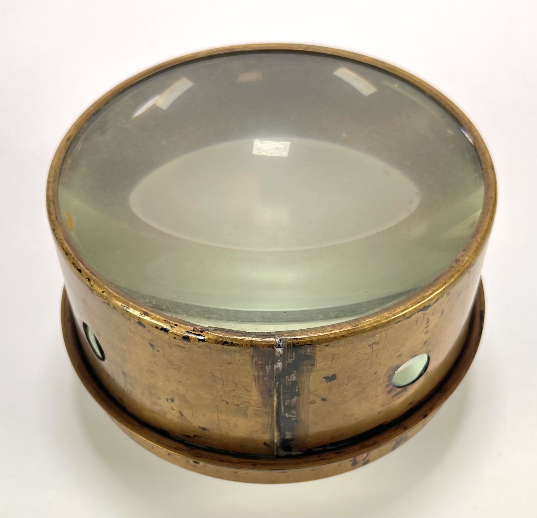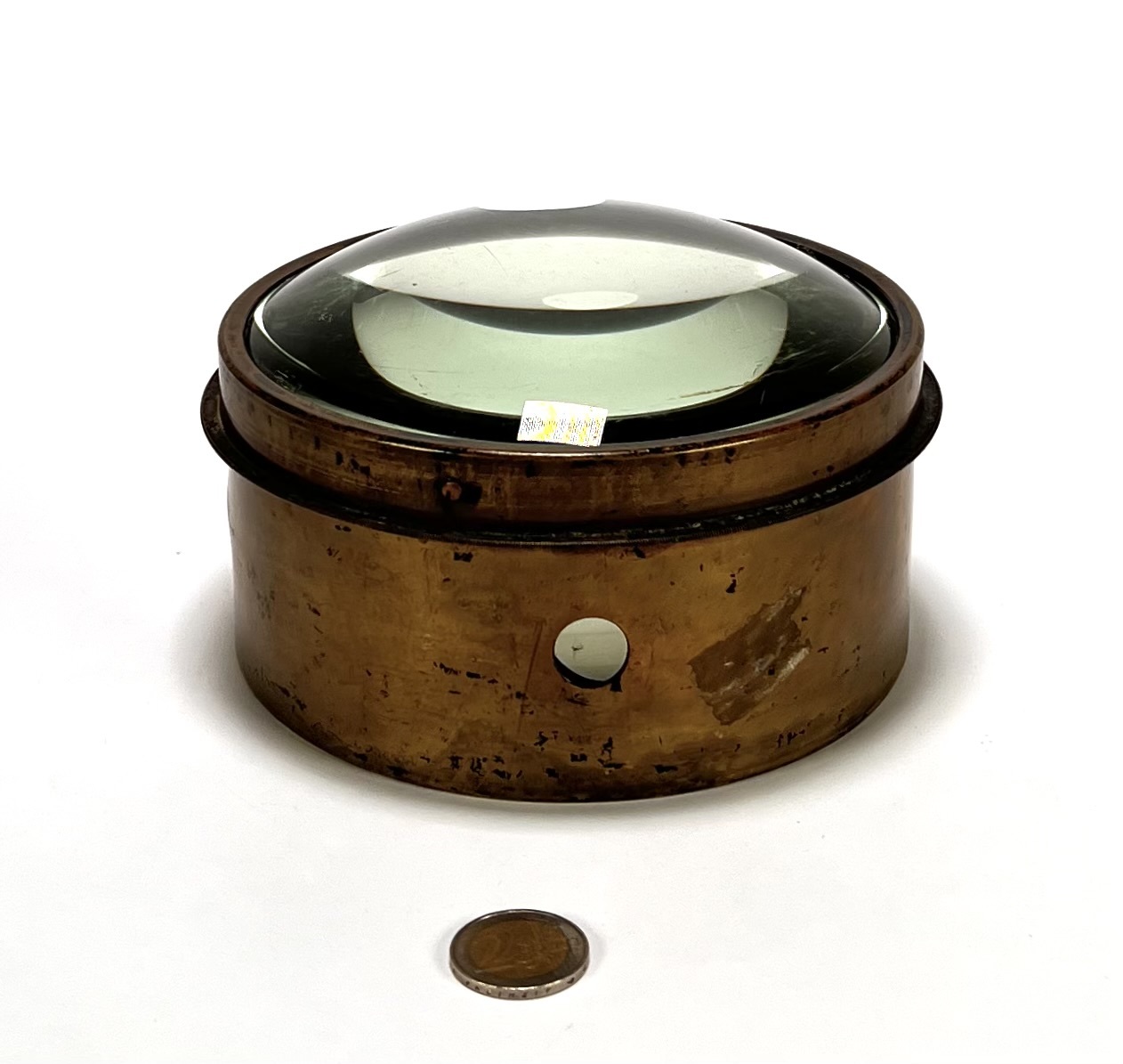 Loep in maritieme stijl, vervaardigd uit messing met een dikke geslepen glazen lens. De cilindrische voet is voorzien van ronde openingen voor lichtinval, de zware uitvoering zorgde voor stabiliteit tijdens het gebruik.De loep dateert uit de eerste helft van de 20e eeuw en heeft een Europese herkomst. Klaar om te bieden? Registreer je nu en doe mee aan de veiling! |