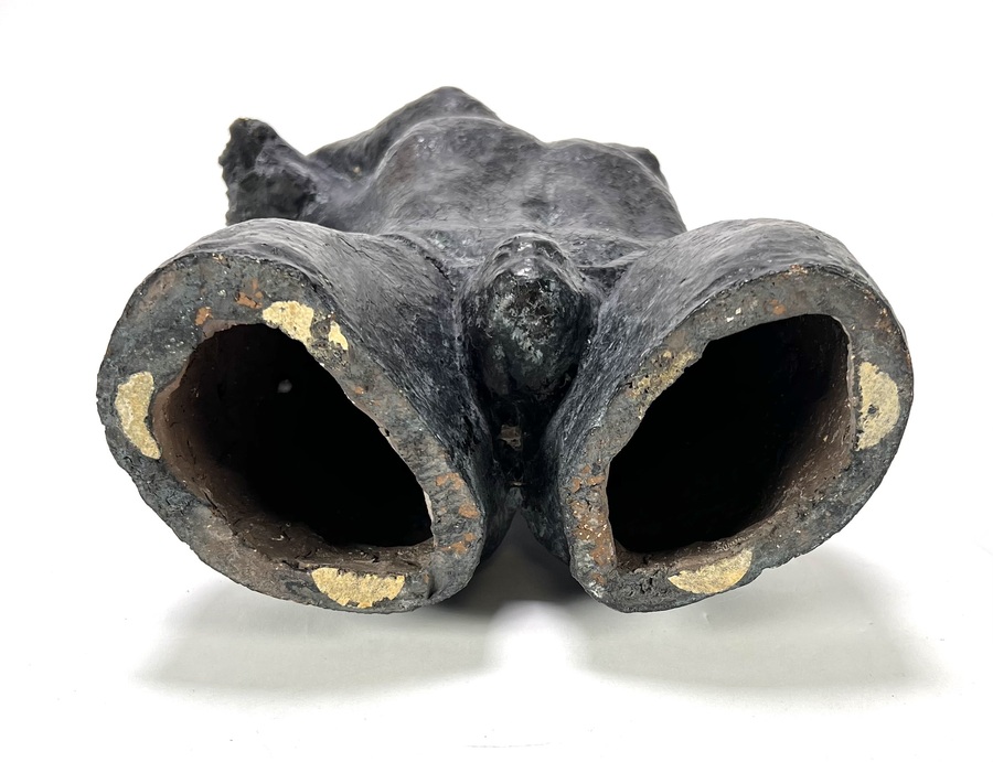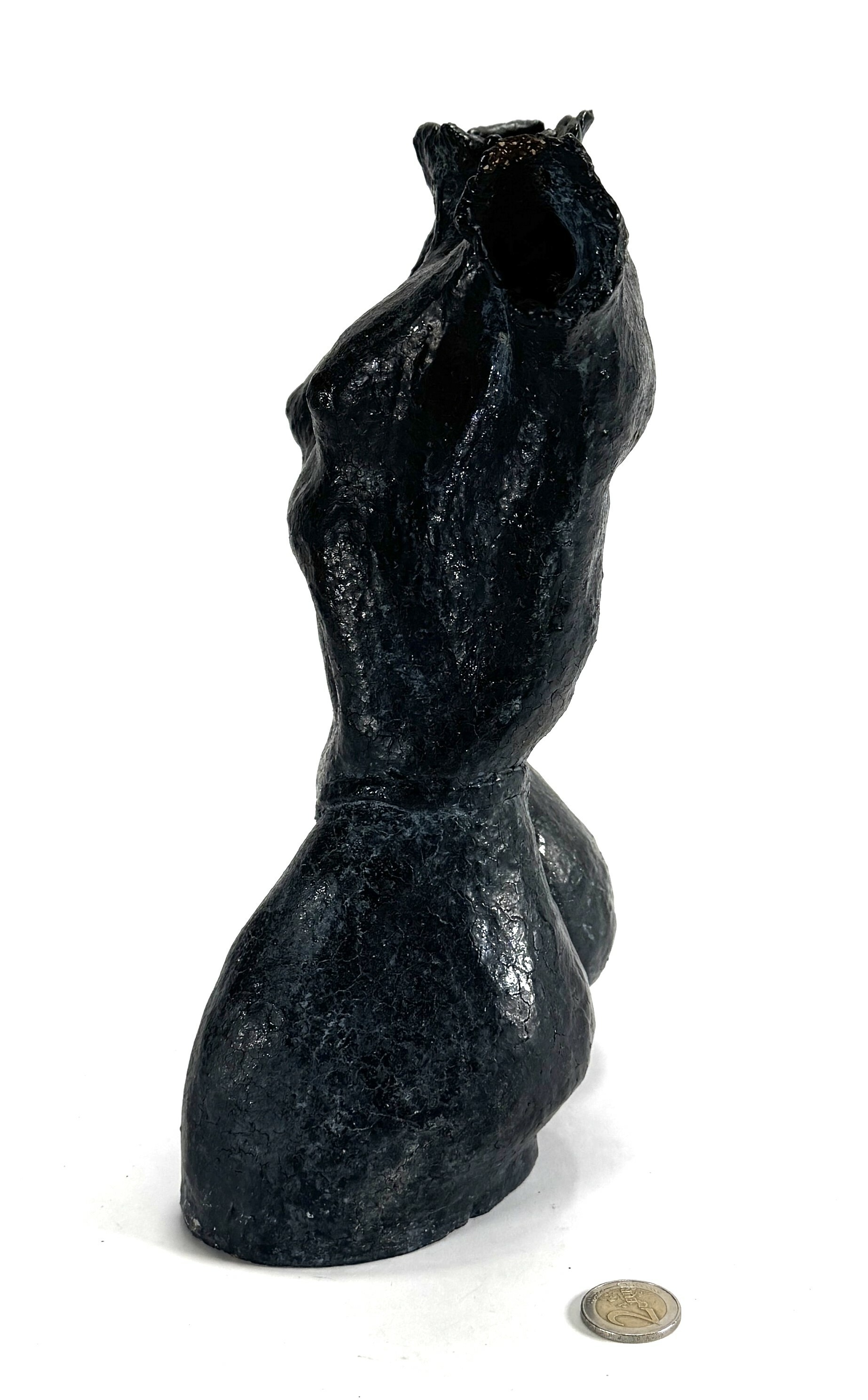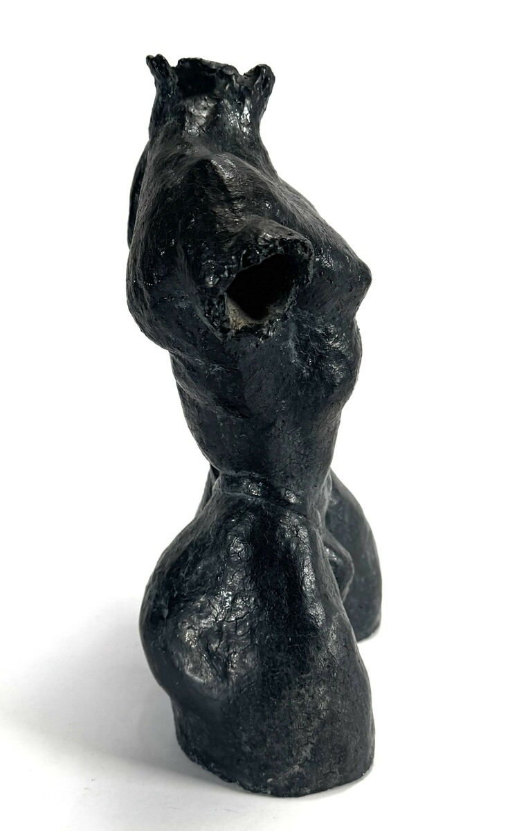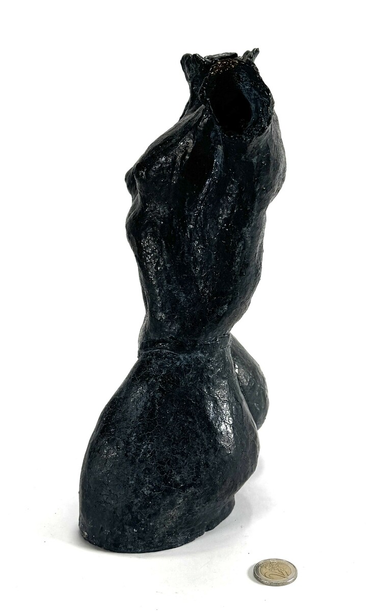 Beeld in modernistische stijl, vervaardigd uit keramiek met een donker antracietkleurige glazuurlaag. Het beeld toont een mannelijke torso met geaccentueerde anatomische details, met een ruwe oppervlaktestructuur en krachtige modellering. Het beeld dateert uit circa 1980 en heeft een Europese herkomst. Geïnteresseerd? Bezoek onze kijkdagen op 10, 11 en 12 april van 11:00 tot 17:00 uur! |
