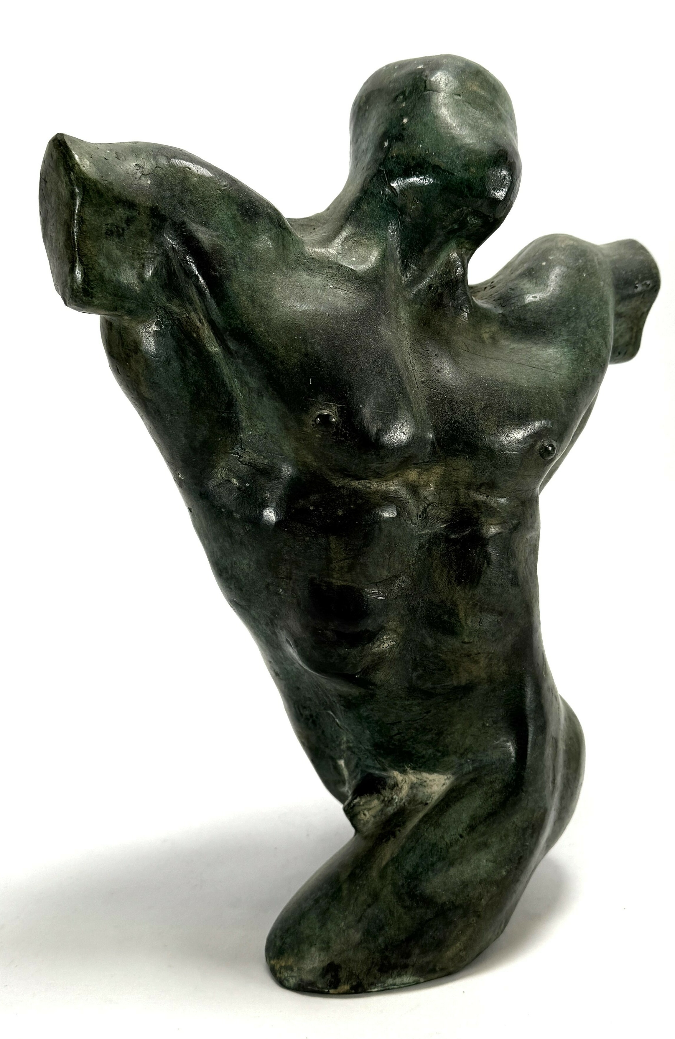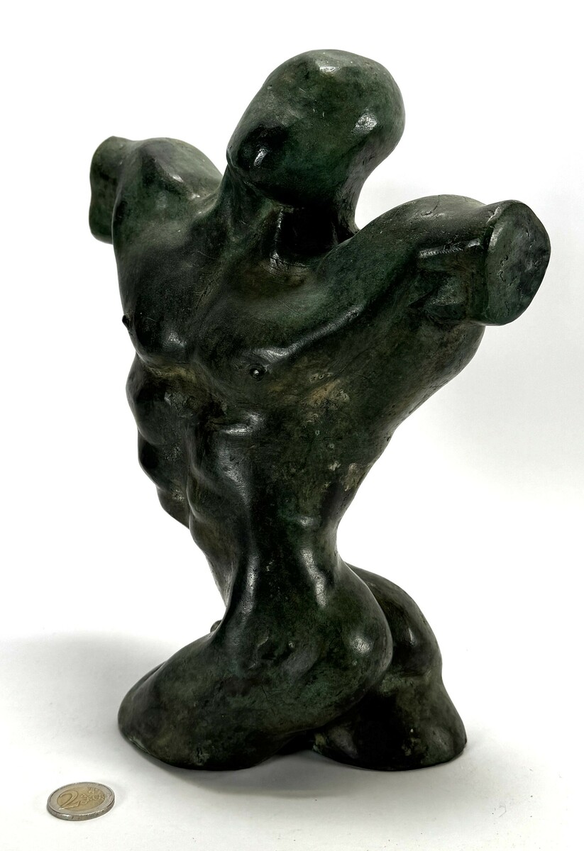 Torso in contemporaine stijl, vervaardigd uit messing met een diepgroene patina. Het beeld toont een gespierd mannelijk bovenlichaam in een dynamische, gedraaide houding met geabstraheerde ledematen. Het beeld dateert uit eind 20e eeuw en heeft een Europese herkomst. Registreer nu en bied eenvoudig online mee op het beeld! |