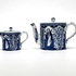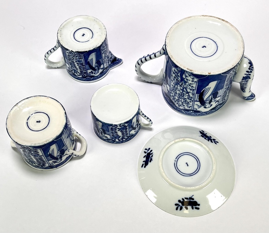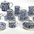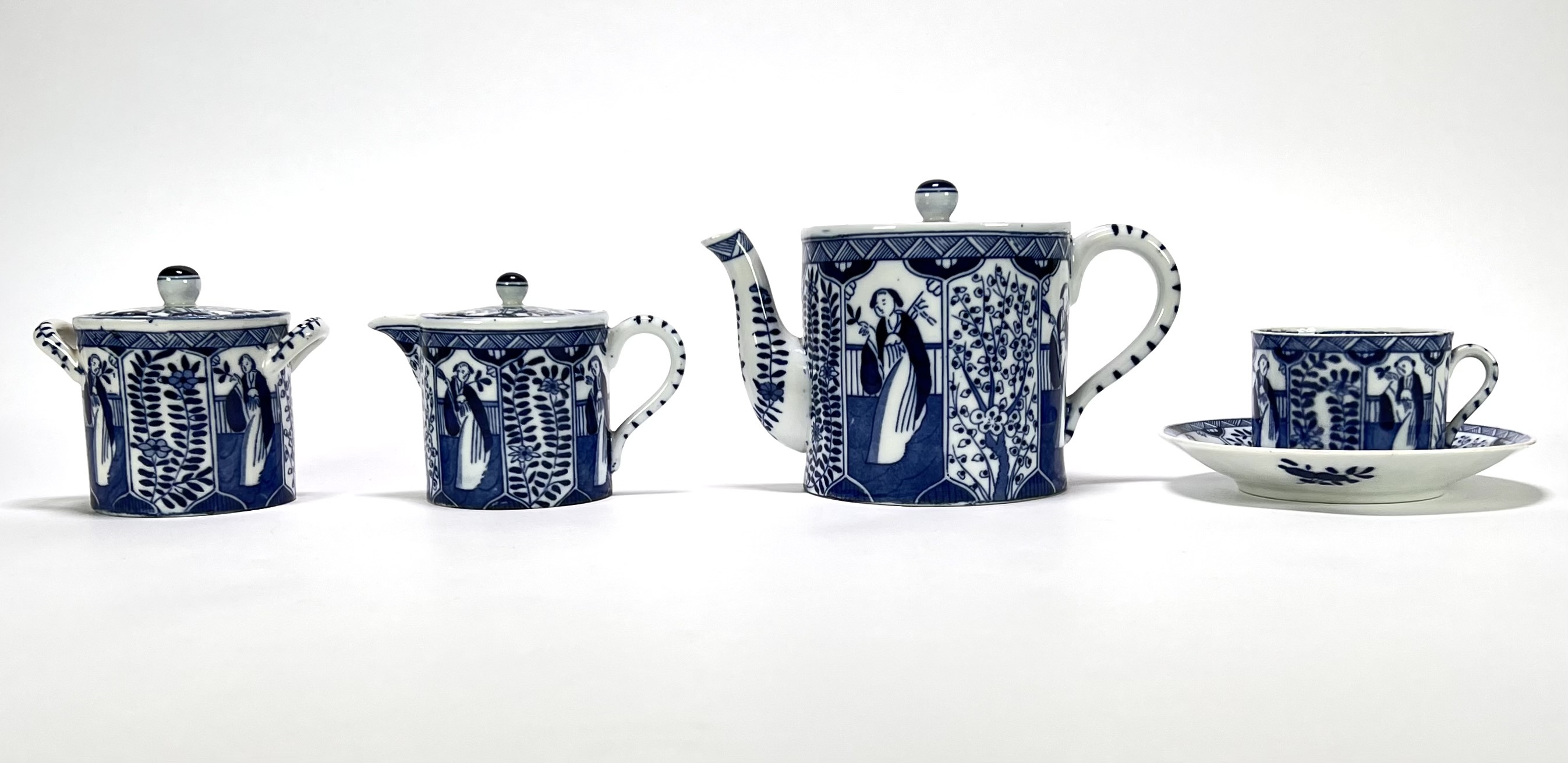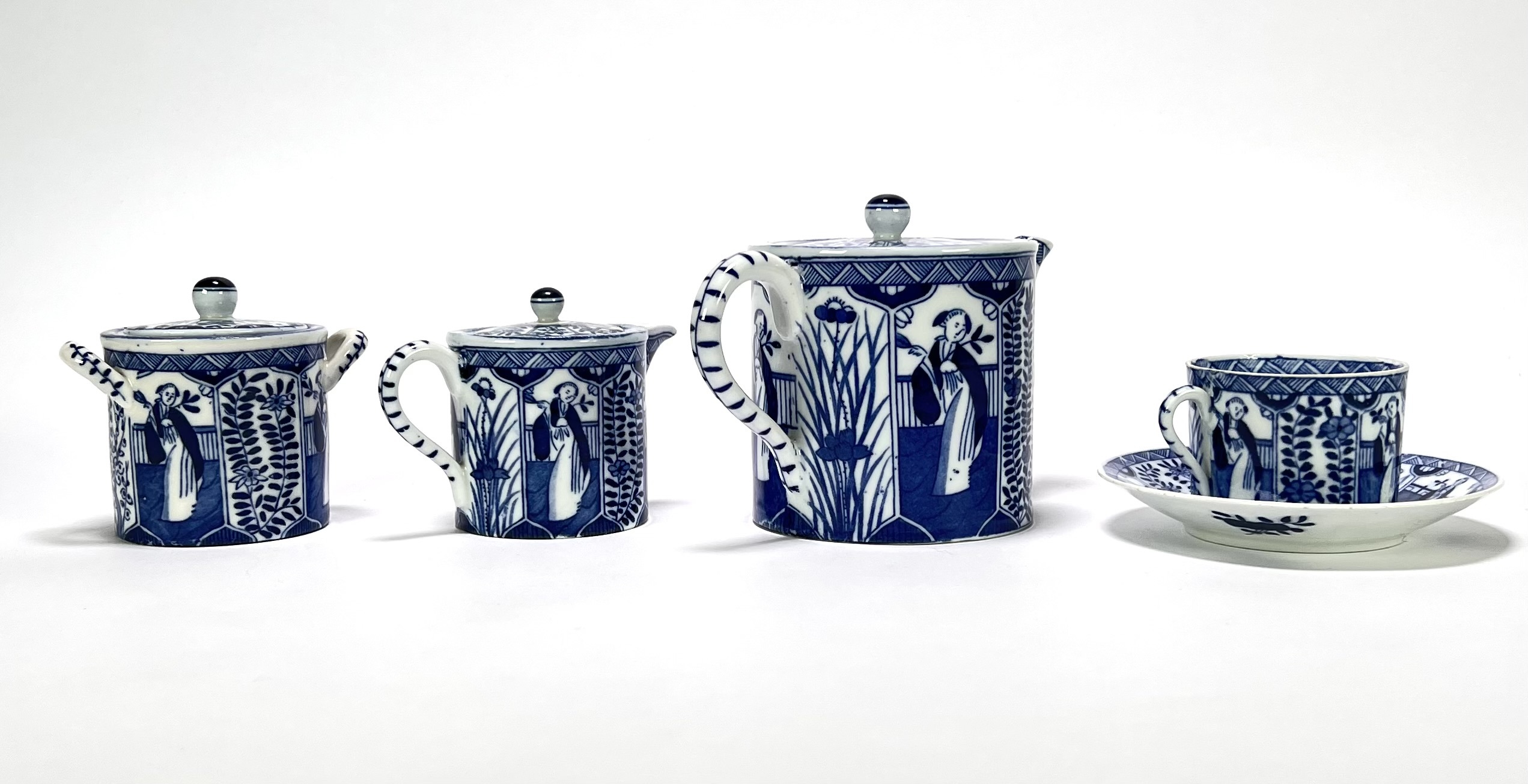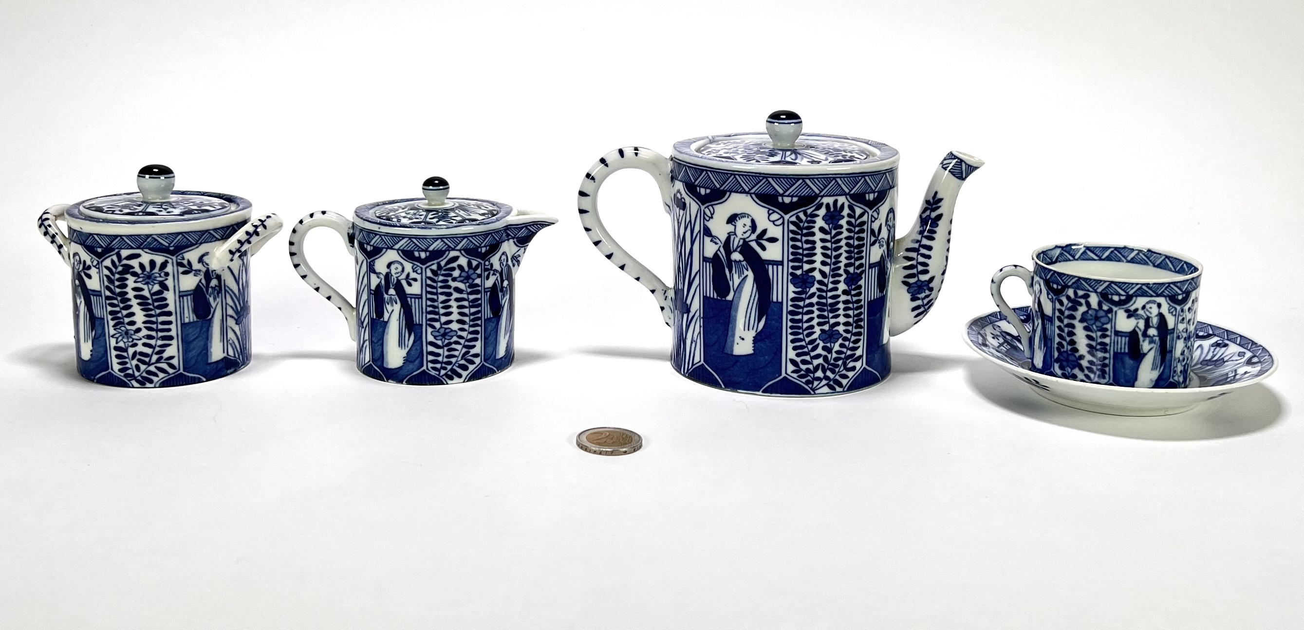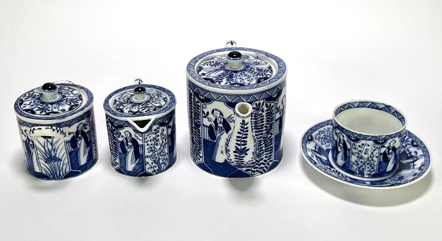 Servies van Mosa Maastricht, vervaardigd uit porselein met blauw-witte transferdruk in het decor Lange Lijs. Het servies bestaat uit een theepot, suikerpot, melkkan, kopjes en schotels, alle uitgevoerd met doorlopende panelen van staande Chinese vrouwen in een tuinsetting met bloeiende takken. Datering circa 1900 en heeft een Nederlandse herkomst. Het servies zelf beoordelen? Je bent welkom op onze kijkdagen! |