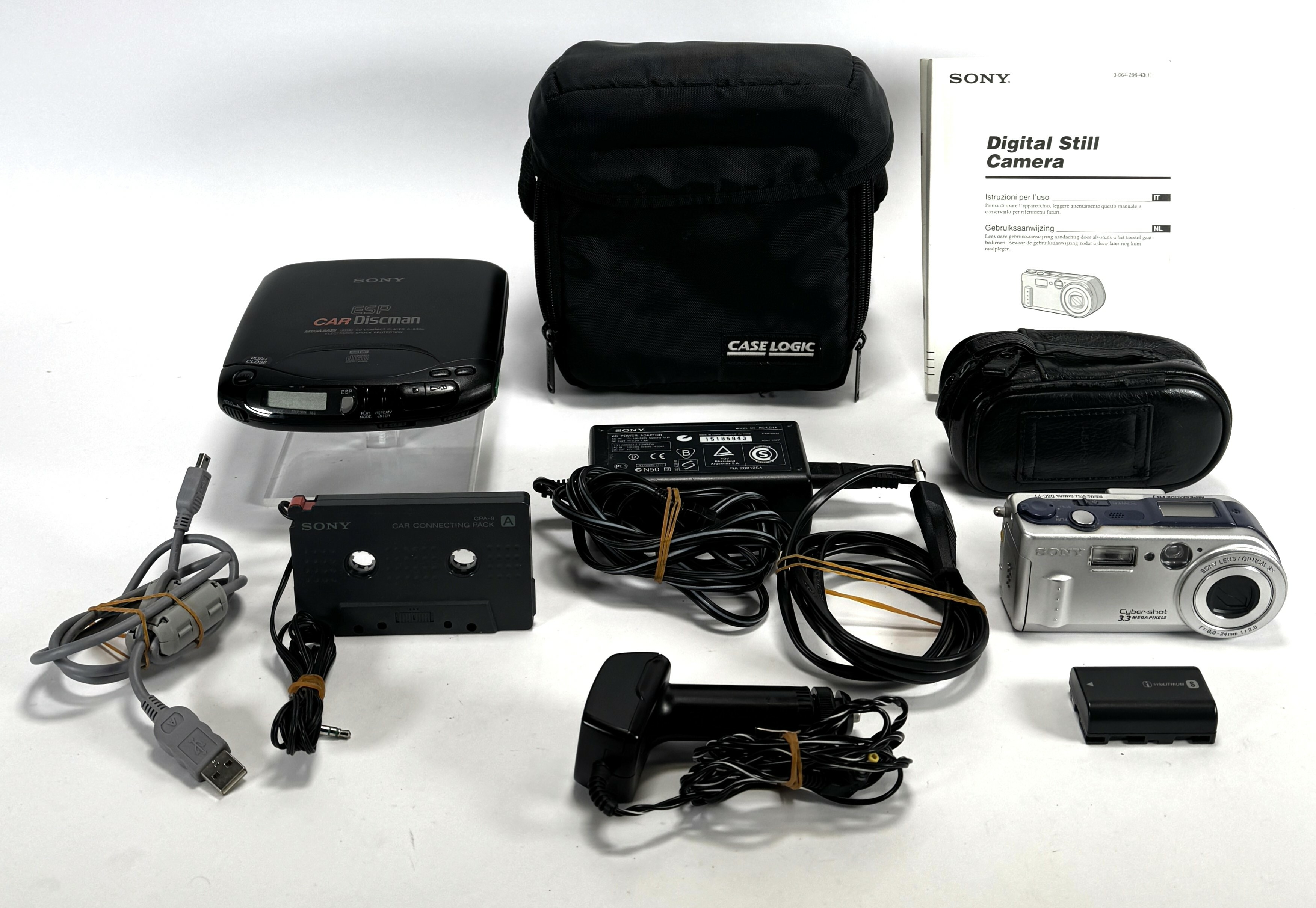 Lot bestaande uit een Sony Discman D-830K, een Cyber-shot DSC-P1 digitale camera en accessoires, uitgevoerd in antracietkleurige en zilverkleurige kunststof behuizingen. Alsook een cassette adapter voor radio's, diverse voedingskabels en een bijbehorende draagtas van Case Logic. Daterend uit de periode 1995–2002 en een Japanse herkomst. Registreer nu en bied eenvoudig online mee op dit kavel. |