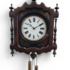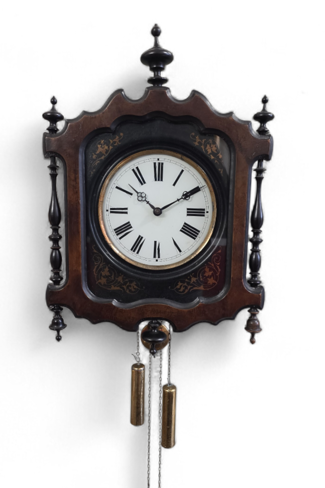 Regulateur in Duitse traditie uit de late negentiende eeuw, uitgevoerd in een met notenhout gefineerde kast voorzien van gedraaide pilasters en bekroond met een siervaas. Het uurwerk met ankergang slaat op een gong en wordt aangedreven door twee messing gewichten. De witte geschilderde glazen wijzerplaat toont Romeinse cijfers en geblauwde wijzers achter glas. |