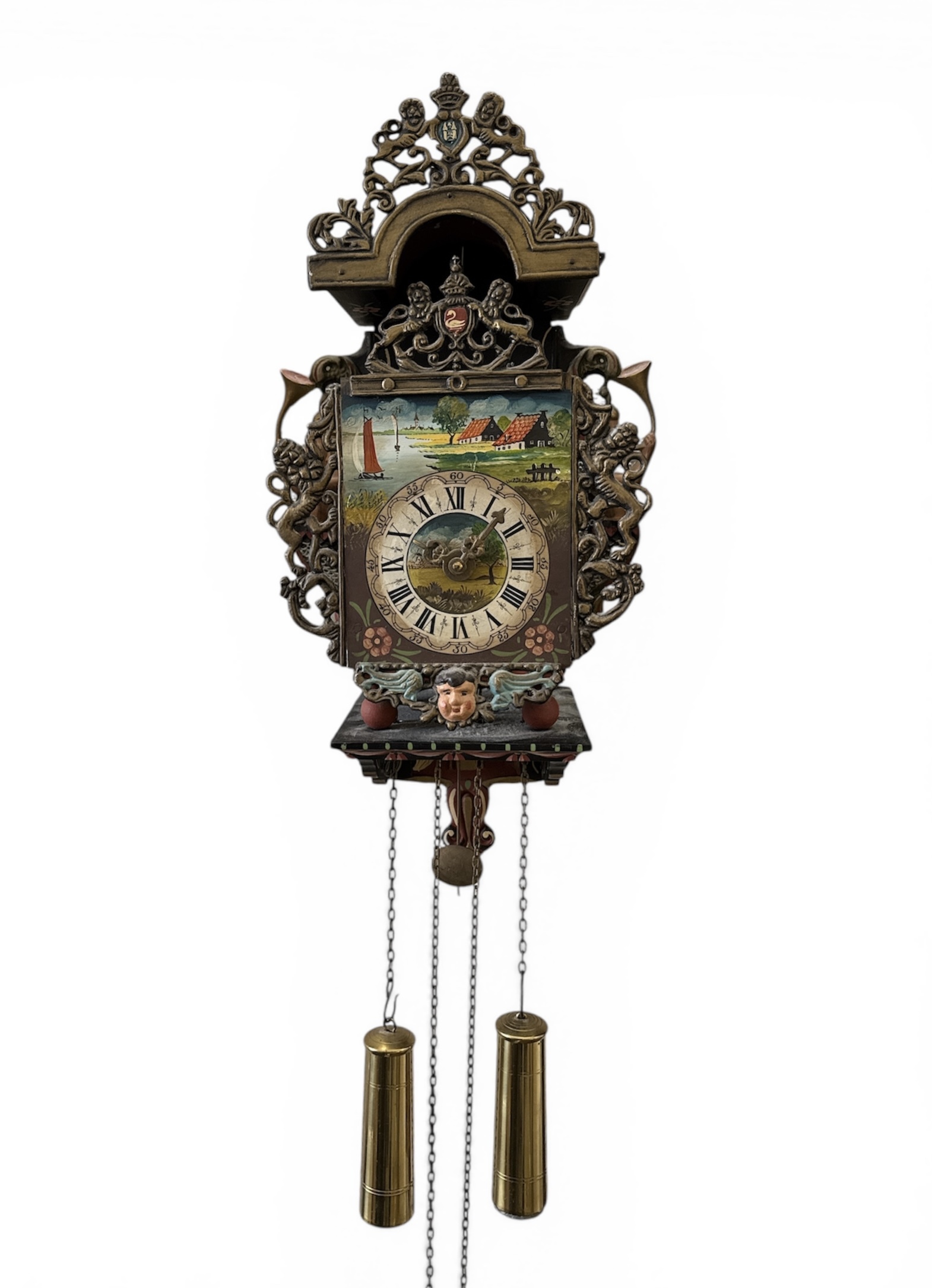 Stoelklok in Friese stijl toont een handbeschilderd tafereel met een Hollands waterlandschap en boerderijen, uitgevoerd in polychroom op metaal en hout. De kap is voorzien van gegoten loden ornamenten met zeemeerminnen en een wapenschild. De stoelklok heeft een maanfase en Romeinse cijfers op de wijzerplaat, daterend uit de tweede helft van de 20e eeuw. Geïnteresseerd? Bezoek onze kijkdagen op 10, 11 en 12 april van 11:00 tot 17:00 uur! |
