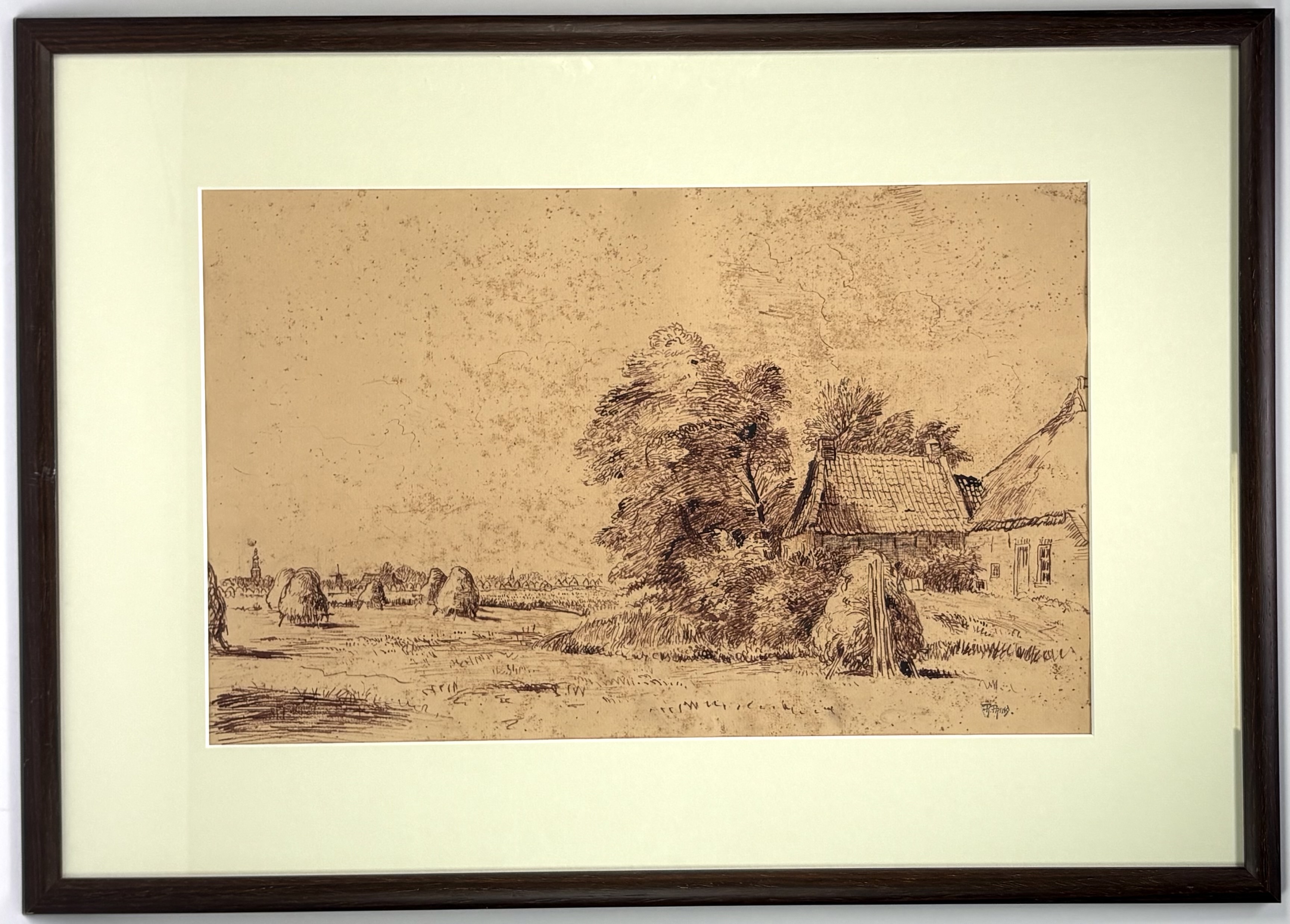 Tekening door Riekele Prins (1905–1954), pentekening op papier, toont een landschap met hooischelven en een riet gedekte boerderij. In de verte is een kerktoren en molen zichtbaar tegen de horizon. Gesigneerd rechtsonder. Deze tekening dateert uit het tweede kwart van de twintigste eeuw en heeft een Nederlandse herkomst. Eerst de tekening zien voordat je biedt? Bezoek onze kijkdagen op 10, 11 en 12 april! |