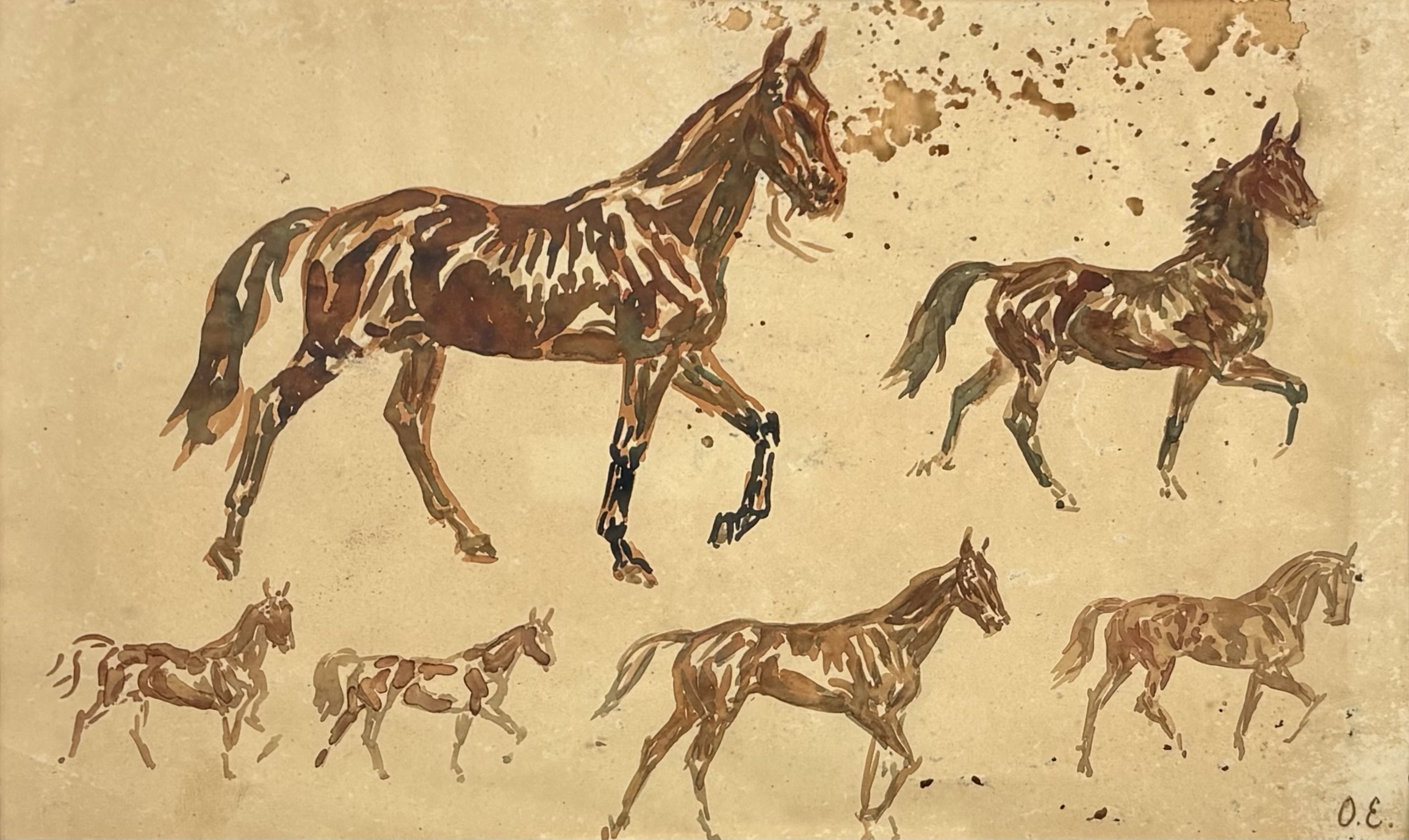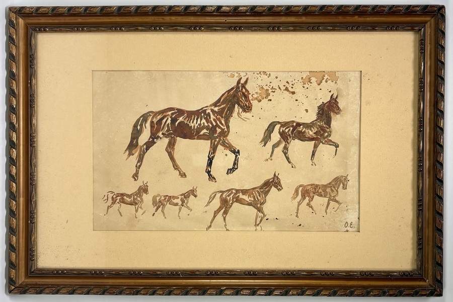 Tekening door Otto Eerelman (1839–1926), inkt en aquarel op papier, toont verschillende paardenstudies in dynamische houdingen. De tekening omvat zes paarden, in vergelijkbare poses, uitgevoerd in bruintinten. Gemonogrammeerd rechtsonder, Nederlandse herkomst en zit in een goudkleurige lijst met geprofileerde randversiering en parelranden. Klaar om te bieden? Registreer je nu en doe mee aan de veiling! |