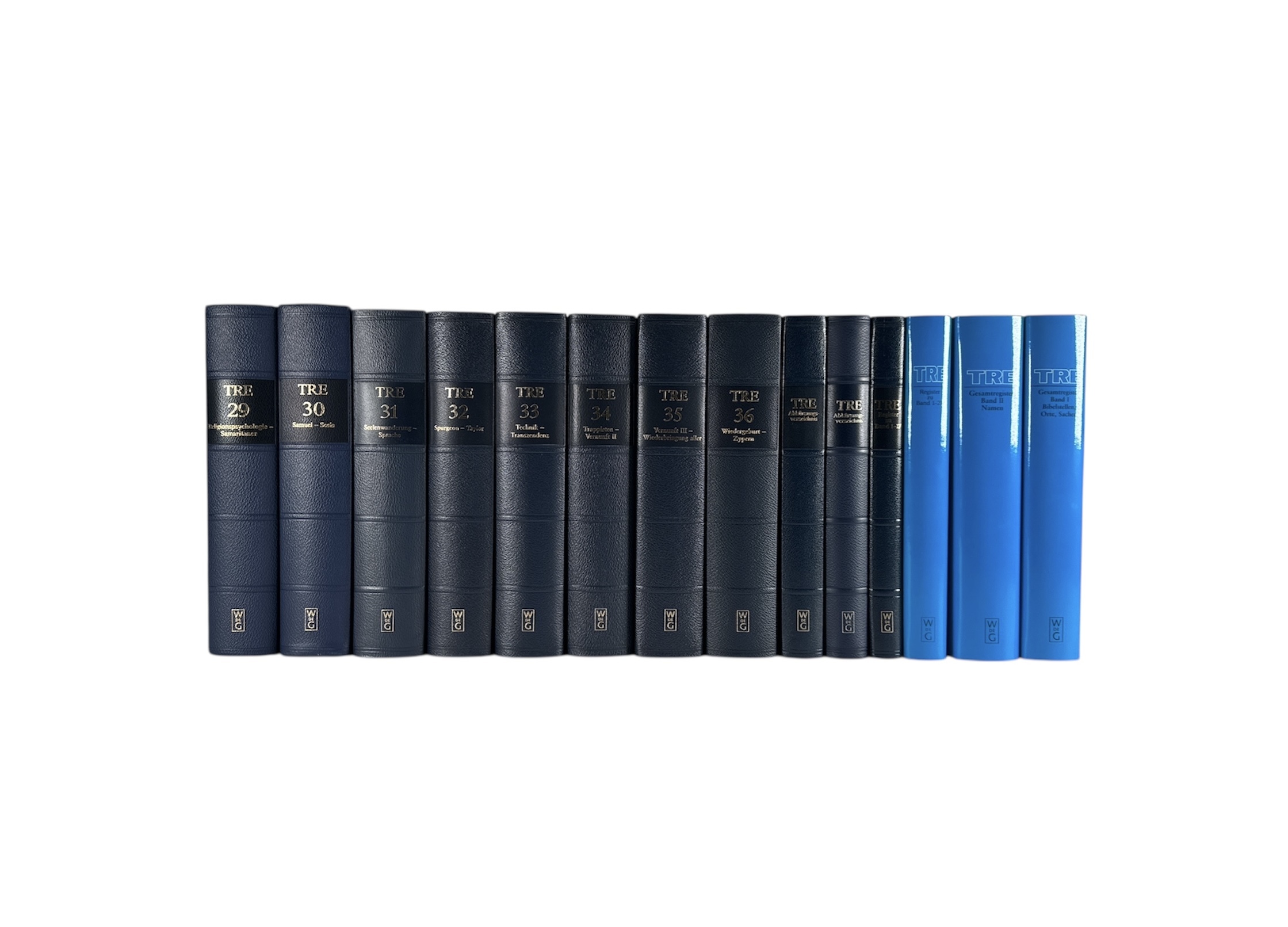 Boeken van uitgeverij Walter de Gruyter, omvattende de volledige Duitstalige reeks Theologische Realenzyklopädie in 36 delen. De wetenschappelijke editie is uitgevoerd in halflinnen banden en bevat naast de hoofdteksten diverse registers en samenvattingen. De encyclopedie geldt als een standaardwerk binnen de theologie en godsdienstwetenschappen. De reeks dateert uit de periode 1977–2004 en heeft een Duitse herkomst. Wil je deze boeken in het echt bekijken? Kom naar de kijkdagen! |