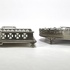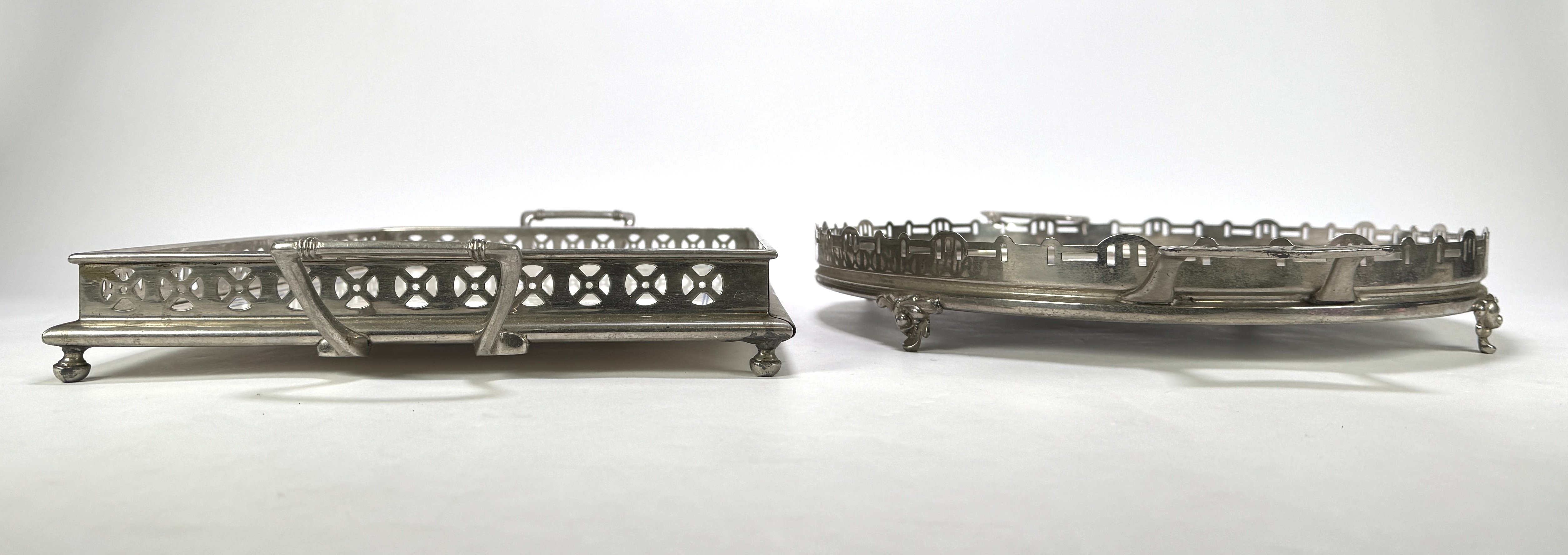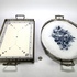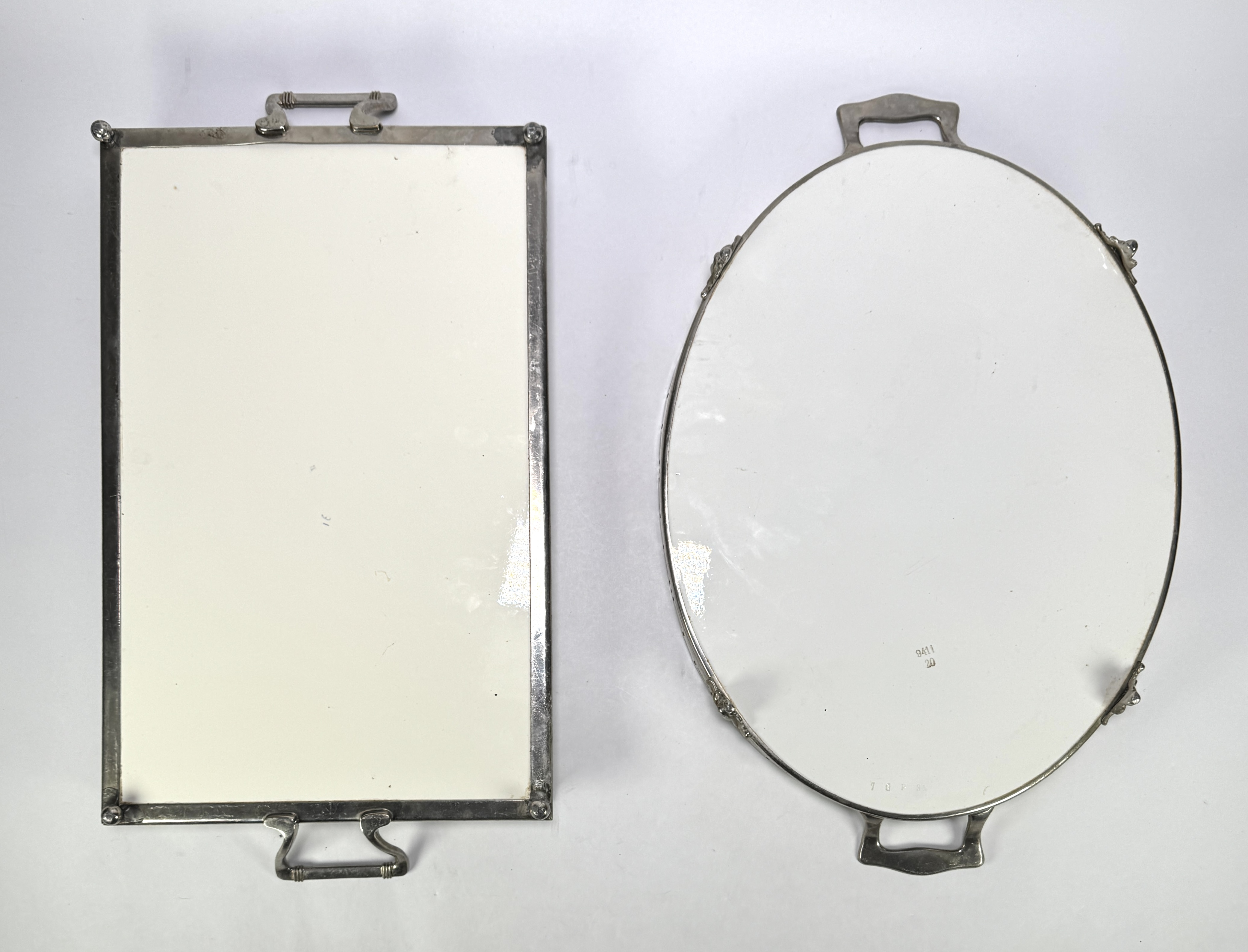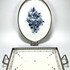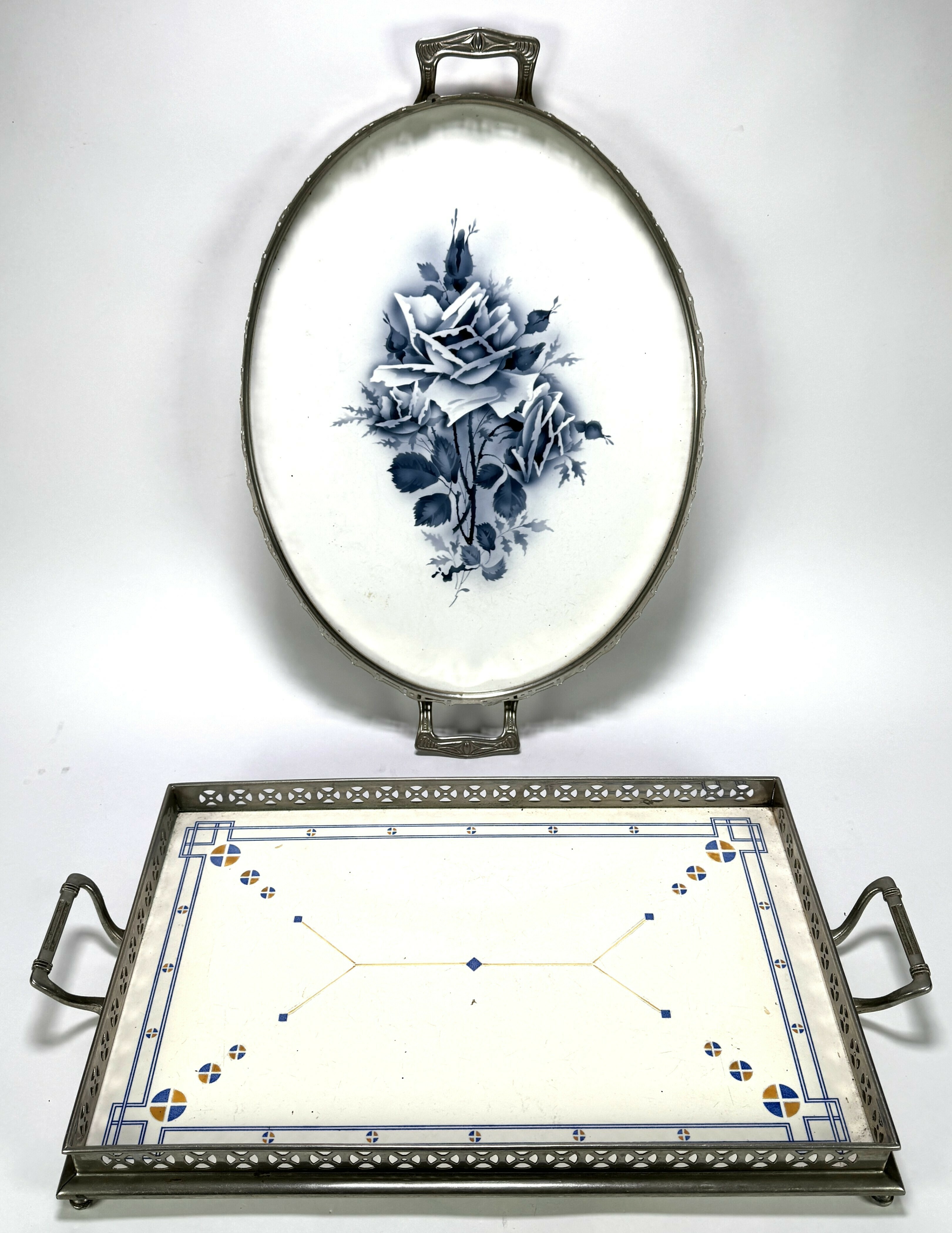 Art Deco dienbladen vervaardigd uit porselein met witmetalen monturen. Het rechthoekige blad toont een lineair blauw-geel hoekdecor, terwijl het ovale blad is voorzien van een blauwgrijze rozencompositie. Met opengewerkte randen, opstaande grepen en kleine pootjes. De dienbladen dateren uit het eerste kwart 20e eeuw. Wil je direct deelnemen? Plaats vanaf 3 april alvast een schriftelijk bod via onze website! |