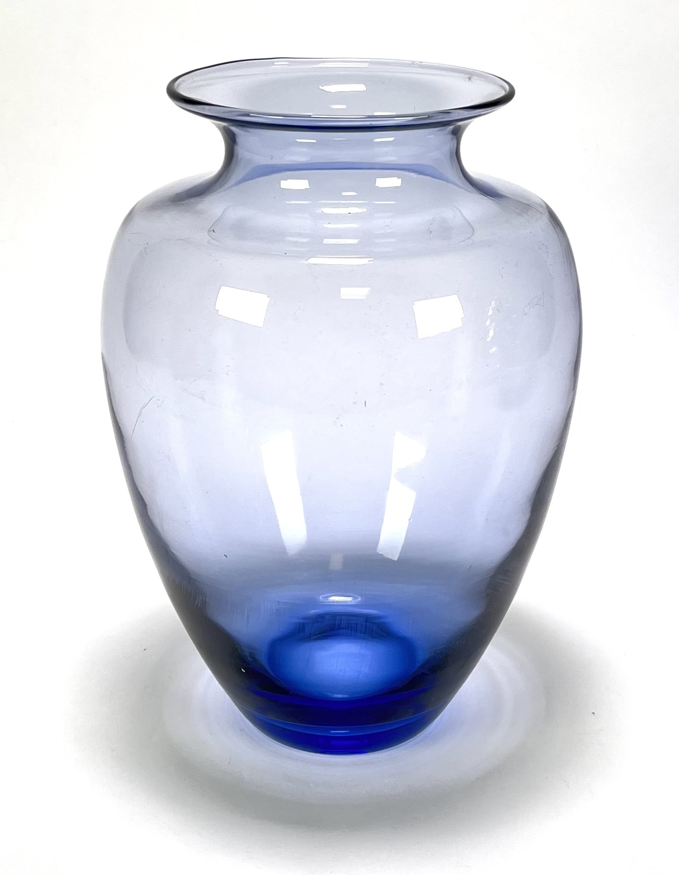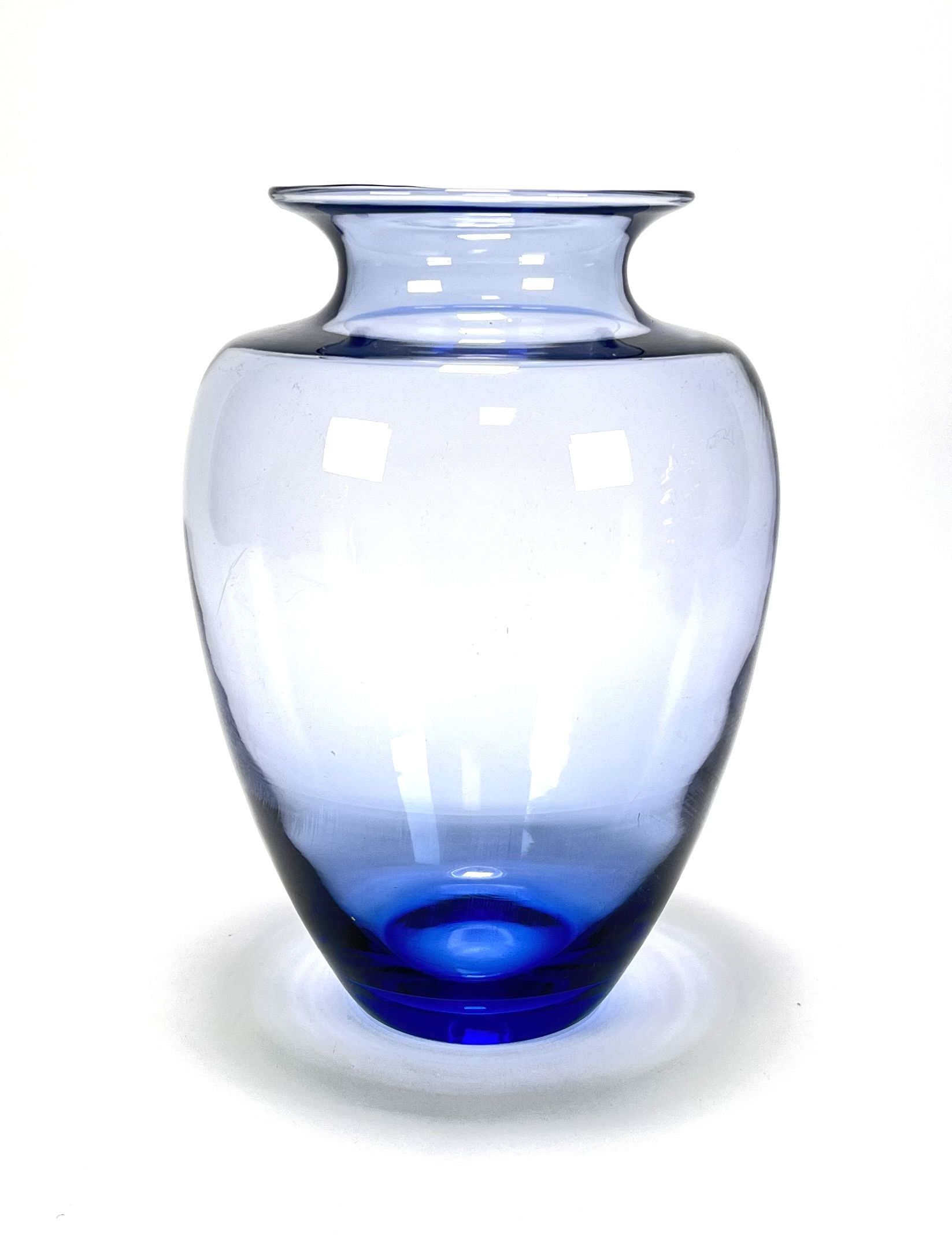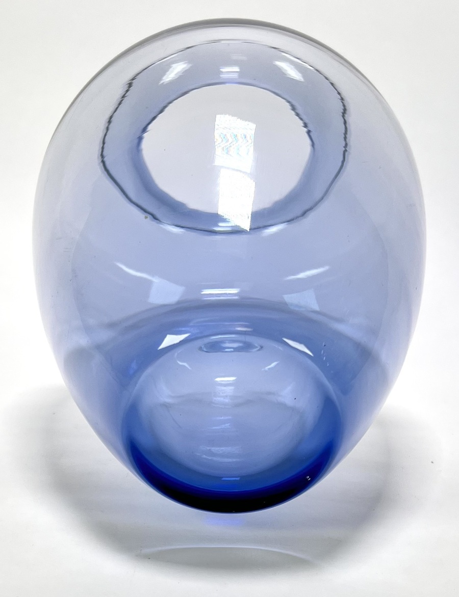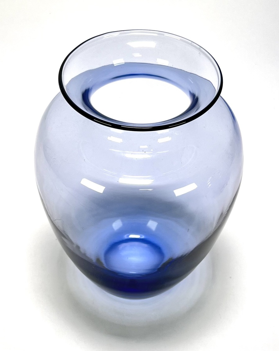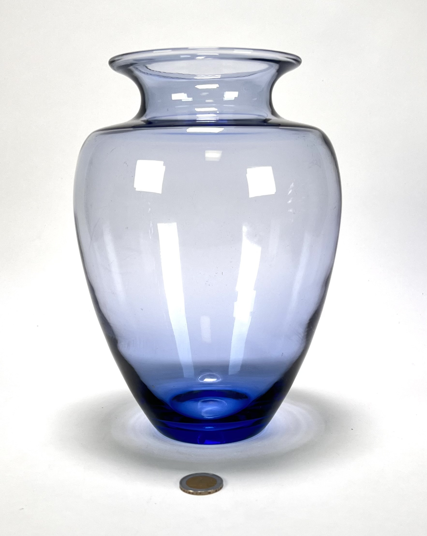 Balustervorm vaas vervaardigd uit dikwandig helder glas met een blauwe kleurkern in het onderste gedeelte, met brede schouders en een uitlopende rand. De vaas dateert uit de jaren '50 en heeft een herkomst in Nederland. Klaar om te bieden? Registreer je nu en doe mee aan de veiling! |