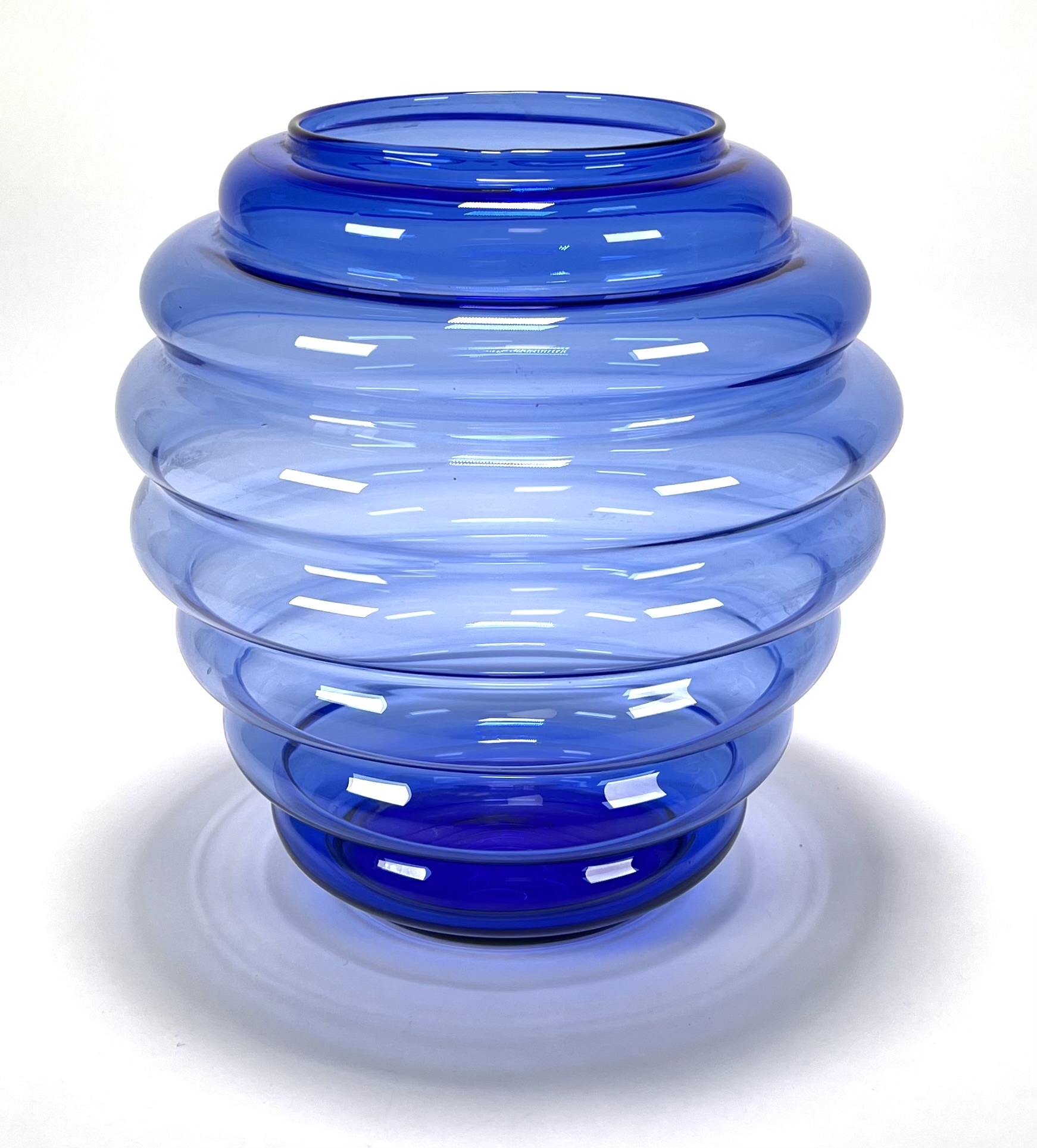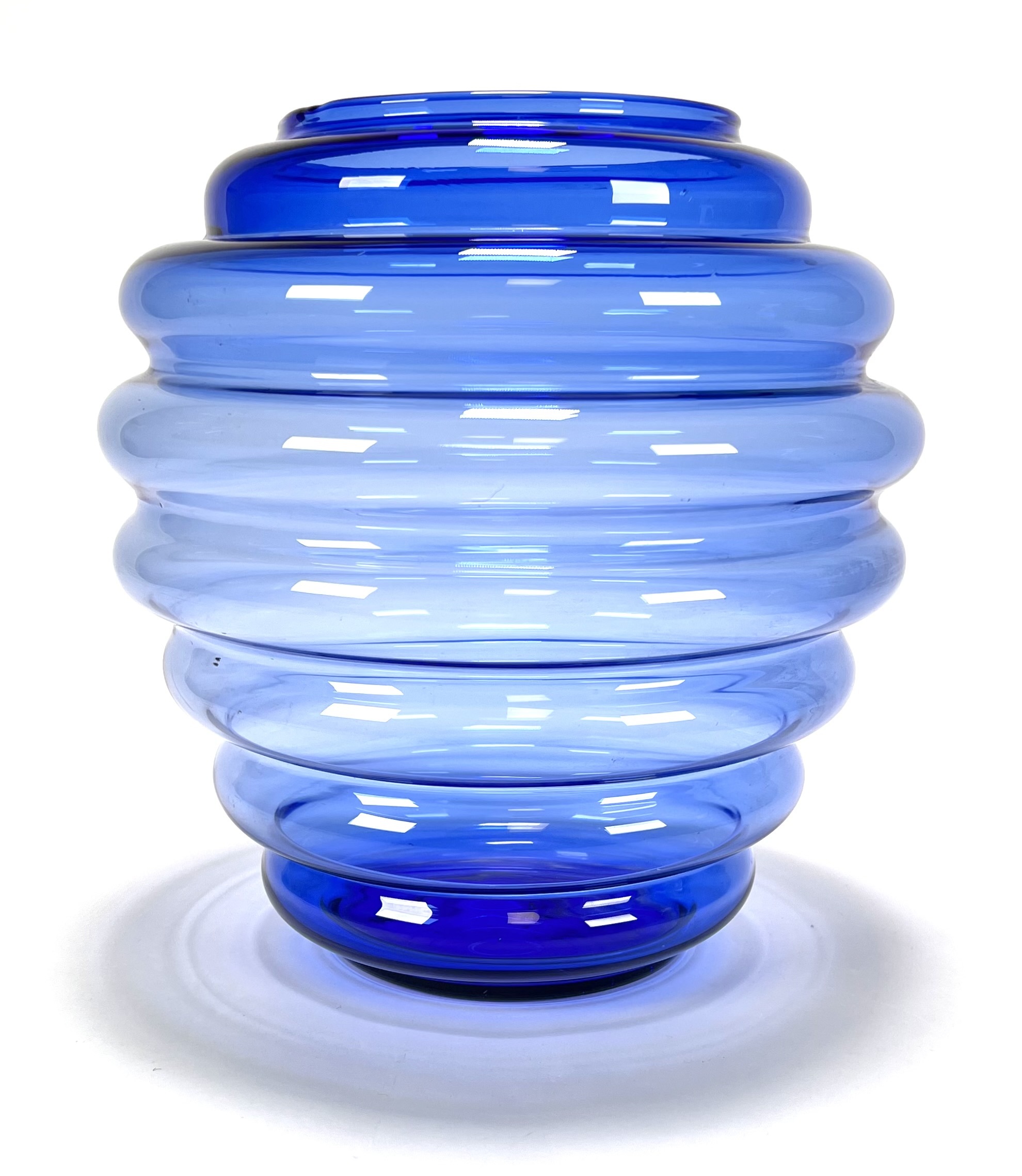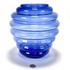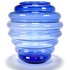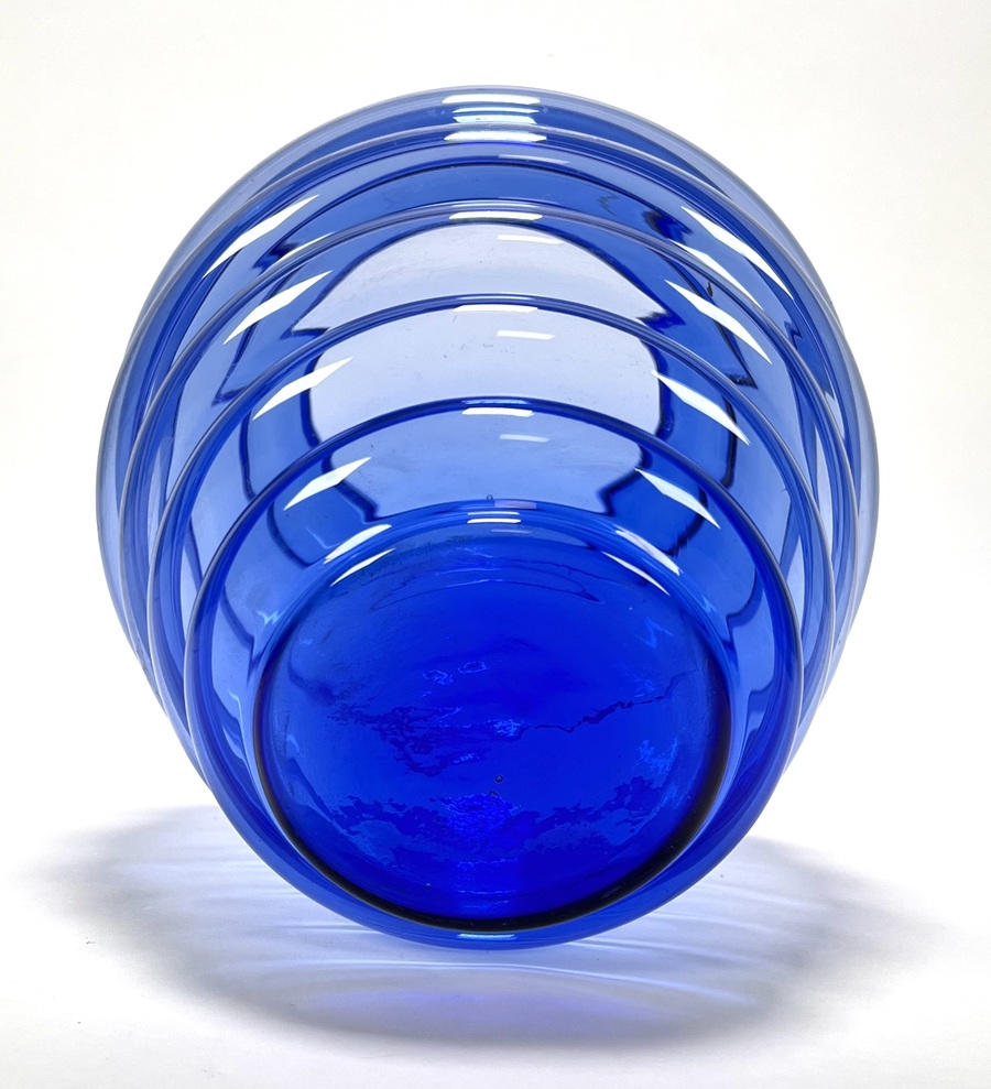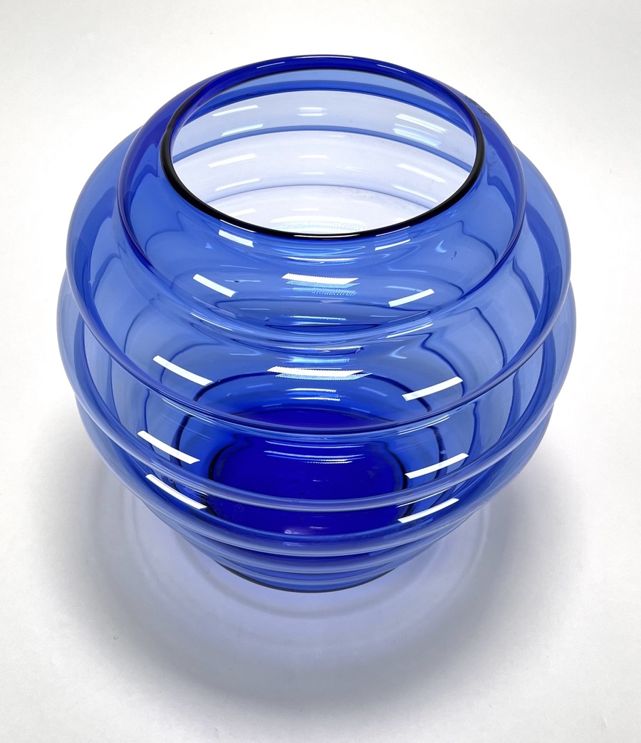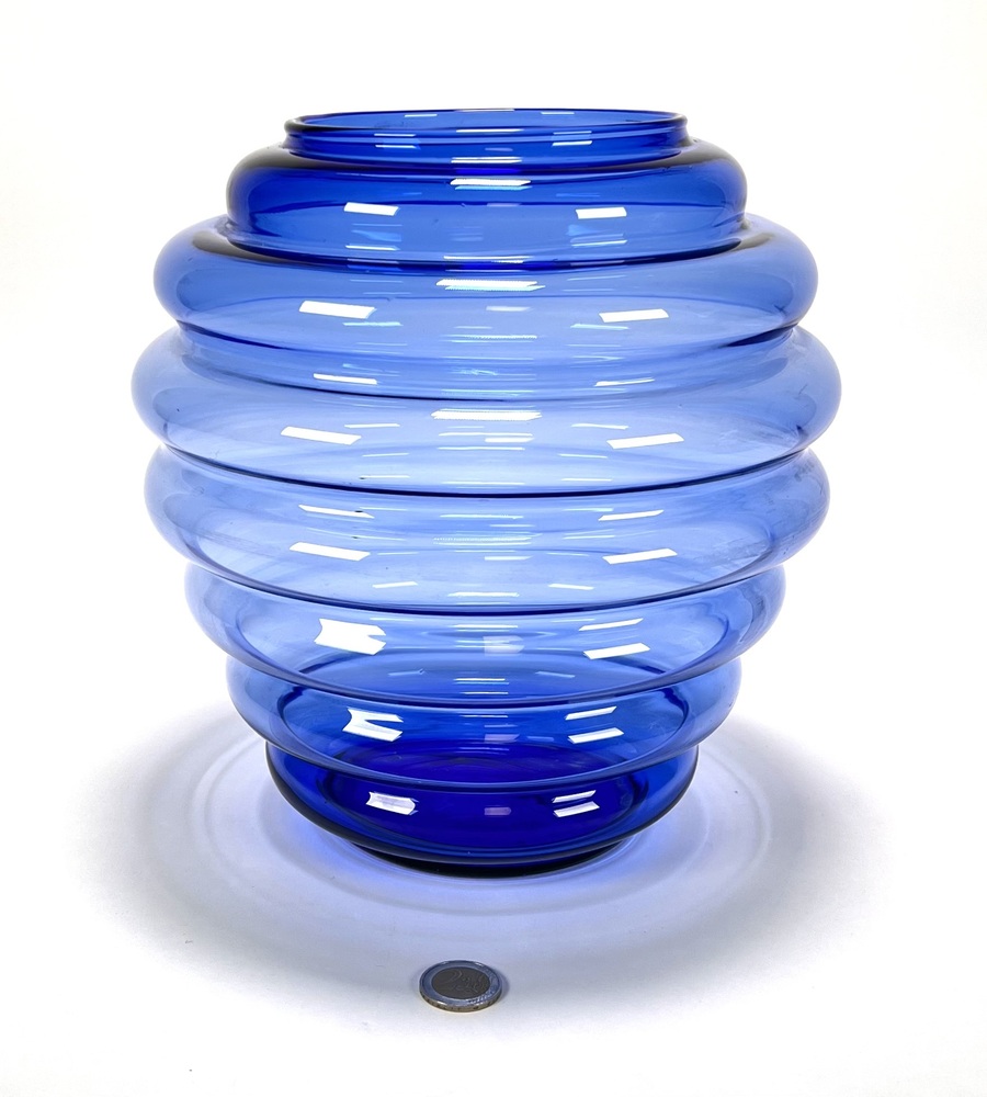 Vaas in postmoderne stijl, vervaardigd uit blauw glas met geblazen optische ribben. De bolronde wand is opgebouwd uit brede horizontale geledingen, oplopend naar een korte cilindrische hals met afgeslepen rand en een zwaar ingetrokken bodempartij. Datering eind 20e eeuw. Kom langs tijdens de kijkdagen (10 t/m 12 april) en ontdek de vaas zelf! |