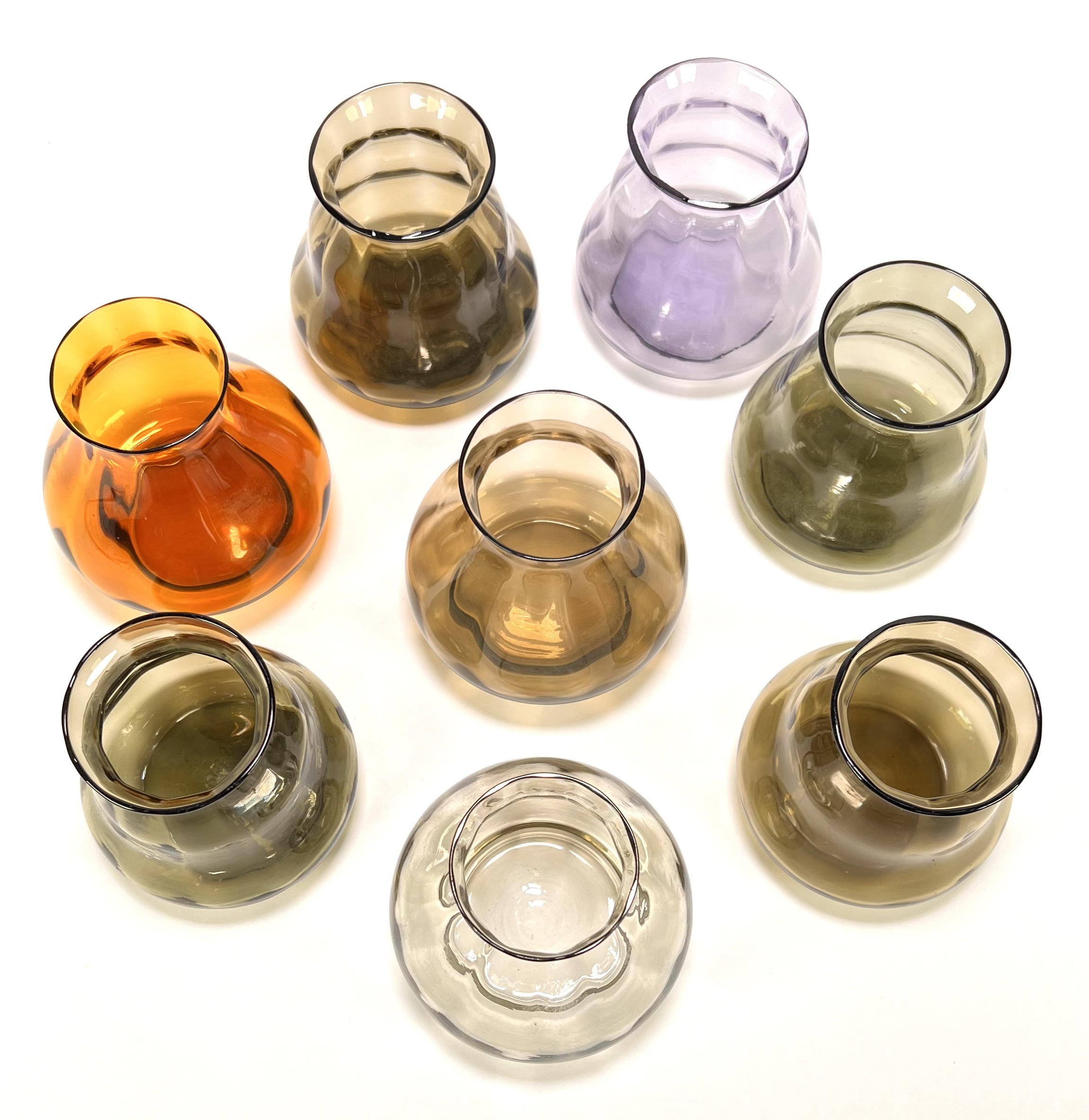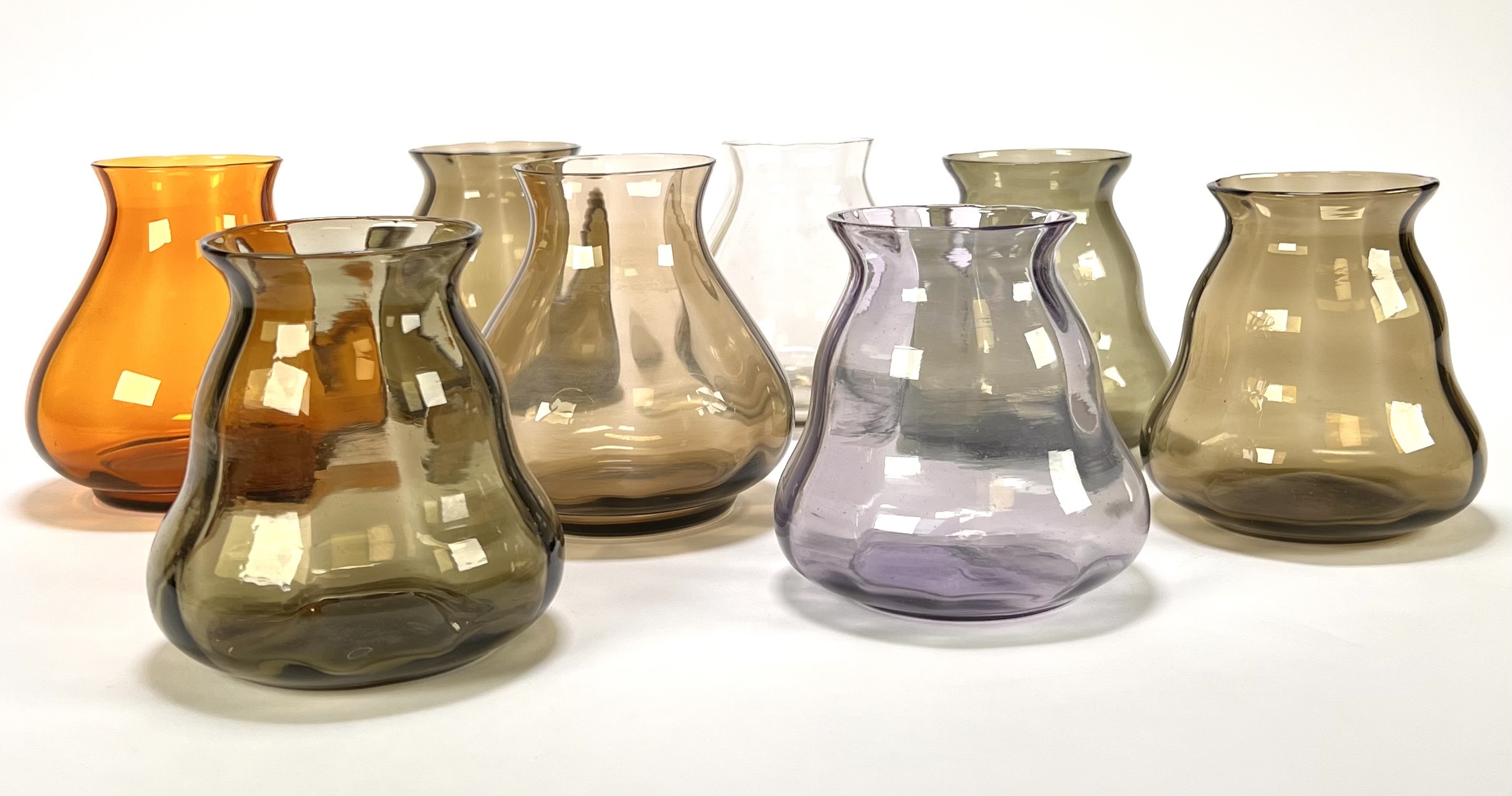 Vaasjes vervaardigd uit mondgeblazen glas in diverse kleurnuances. De verzameling toont een variëteit aan organische vormen, waaronder taps toelopende en buikige modellen in amberkleurig, paars en grijs rookglas. De vaasjes dateren uit circa 1970 en hebben een Europese herkomst. Eerst deze vaasjes zien voordat je biedt? Bezoek onze kijkdagen op 10, 11 en 12 april! |