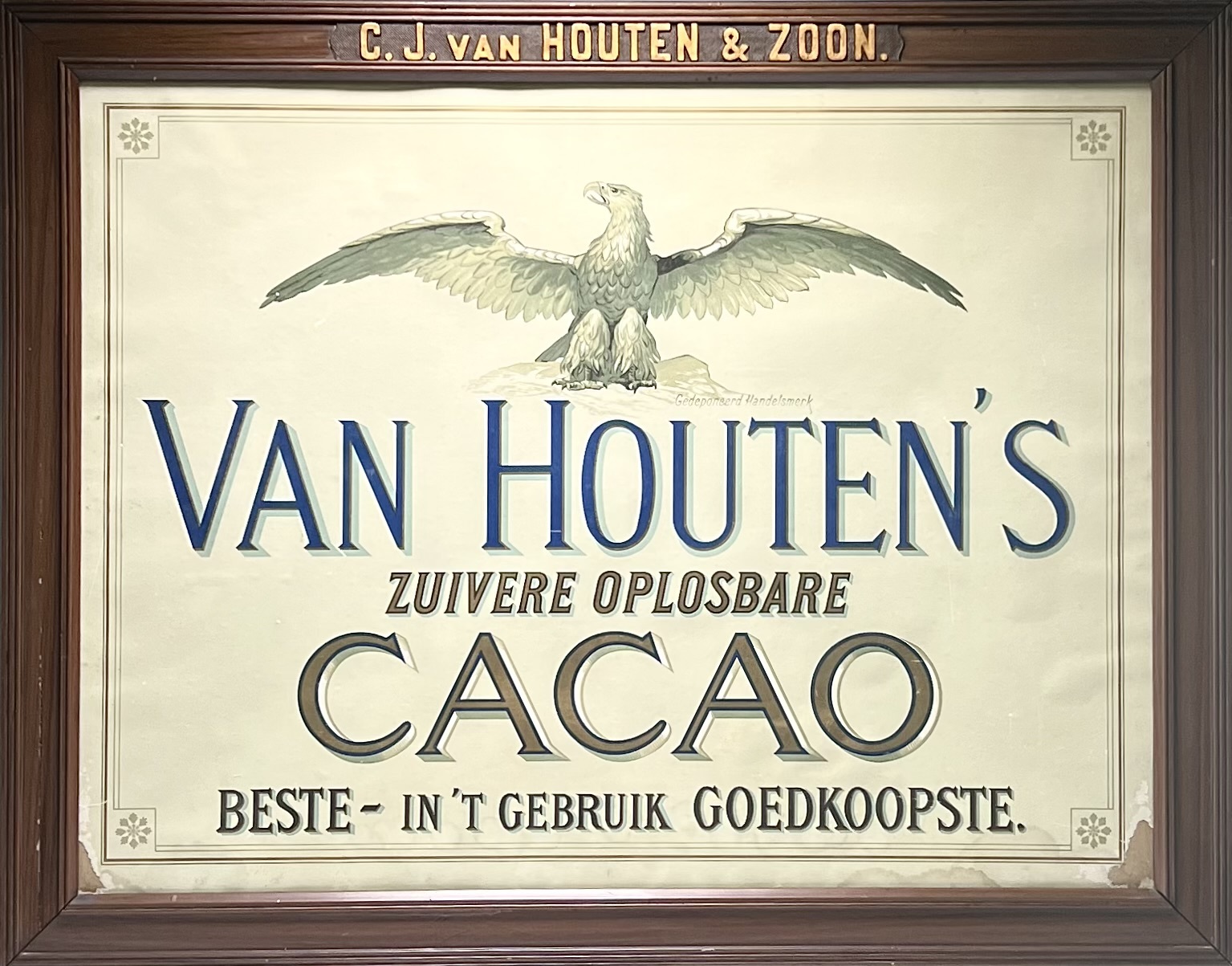 Litho van C.J. van Houten & Zoon, uitgevoerd in meerkleurige lithografie op papier, toont reclame voor zuivere oplosbare cacao in Art Nouveau stijl. De voorstelling wordt gedomineerd door een adelaar met gespreide vleugels boven typografie. De litho dateert uit begin 20e eeuw en is gevat in een houten lijst met goudkleurige titelbalk, Nederlandse herkomst. Zeker zijn van deelname? Plaats vanaf 3 april een schriftelijk bod online! |