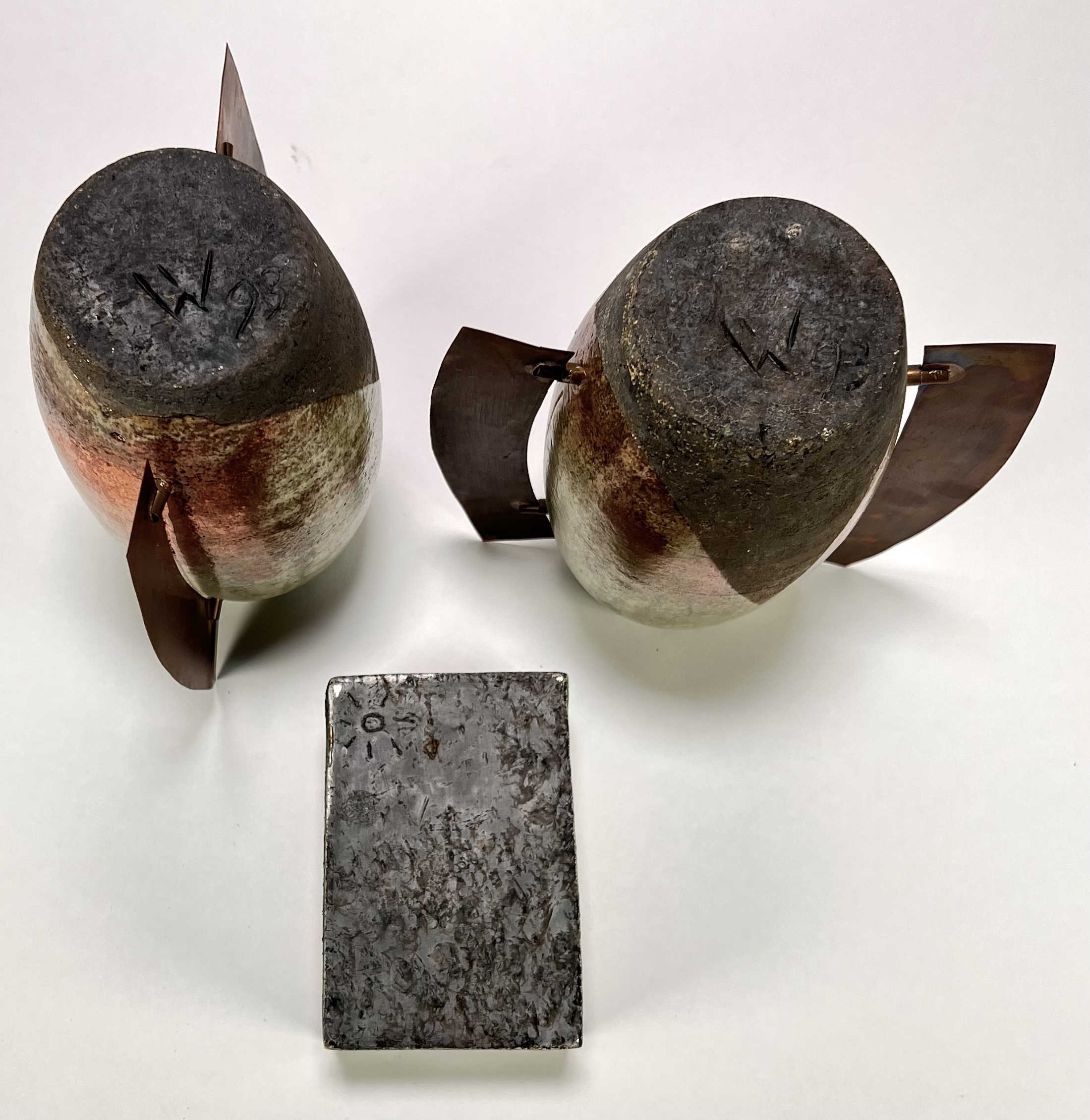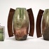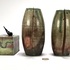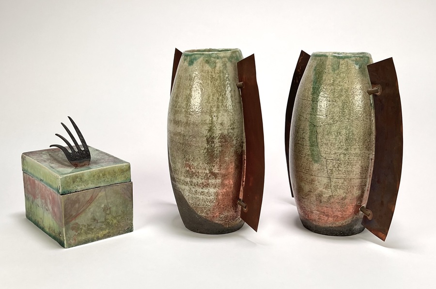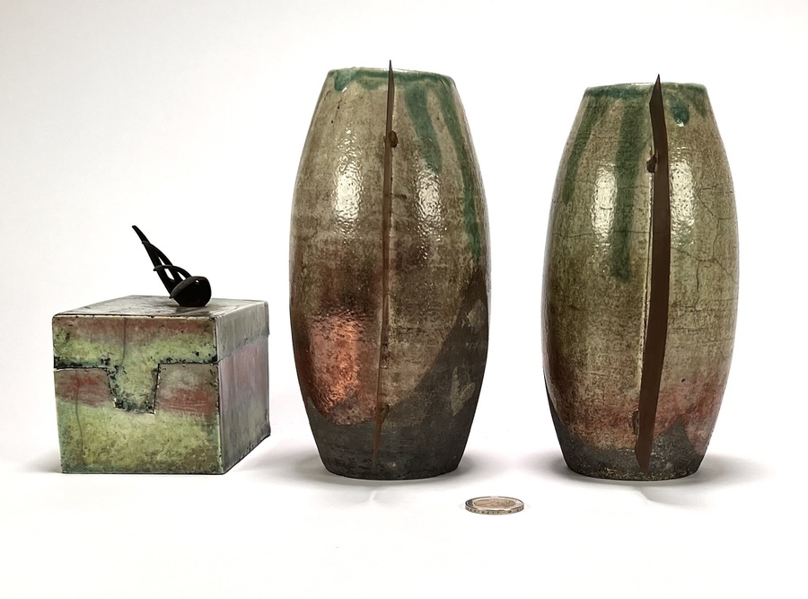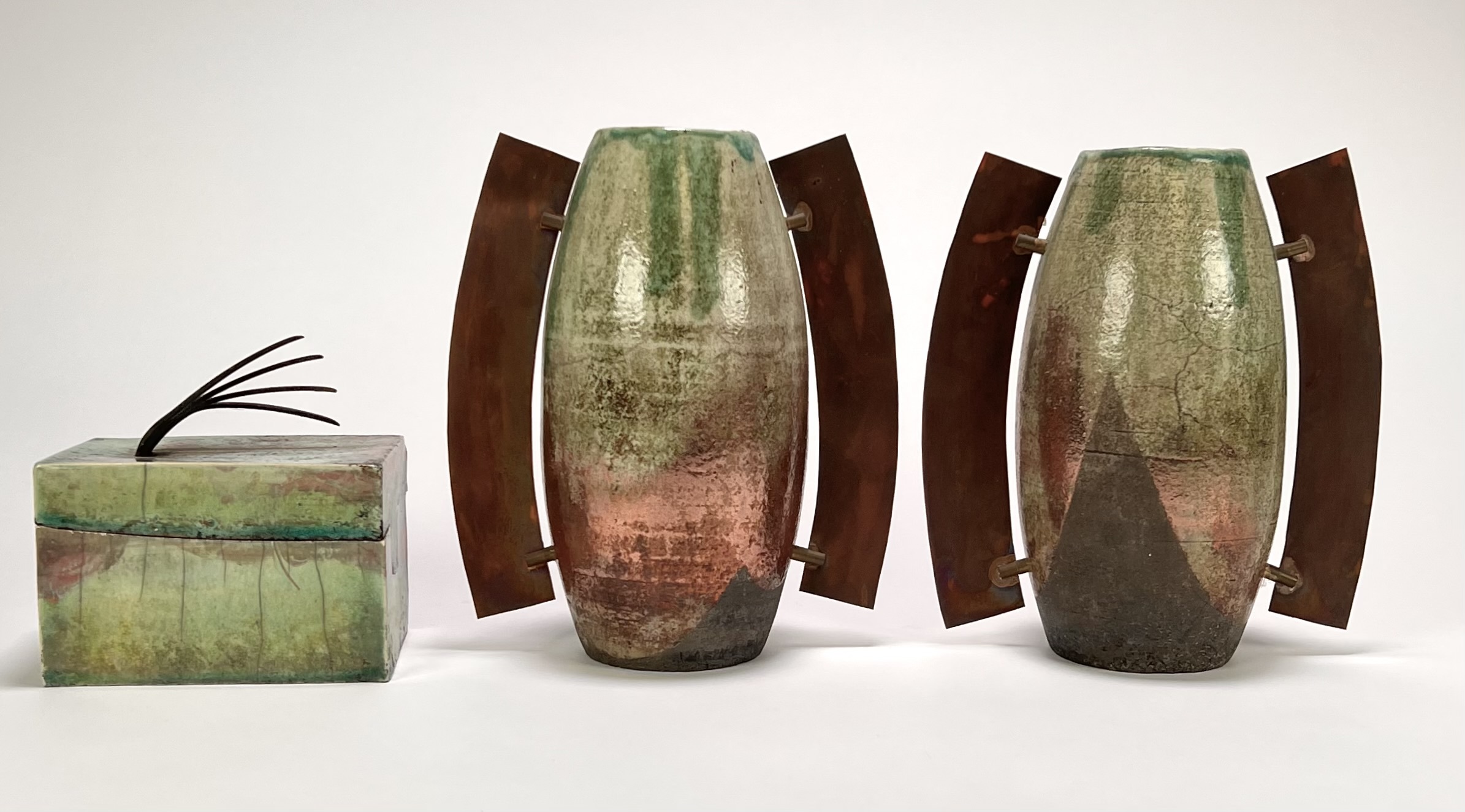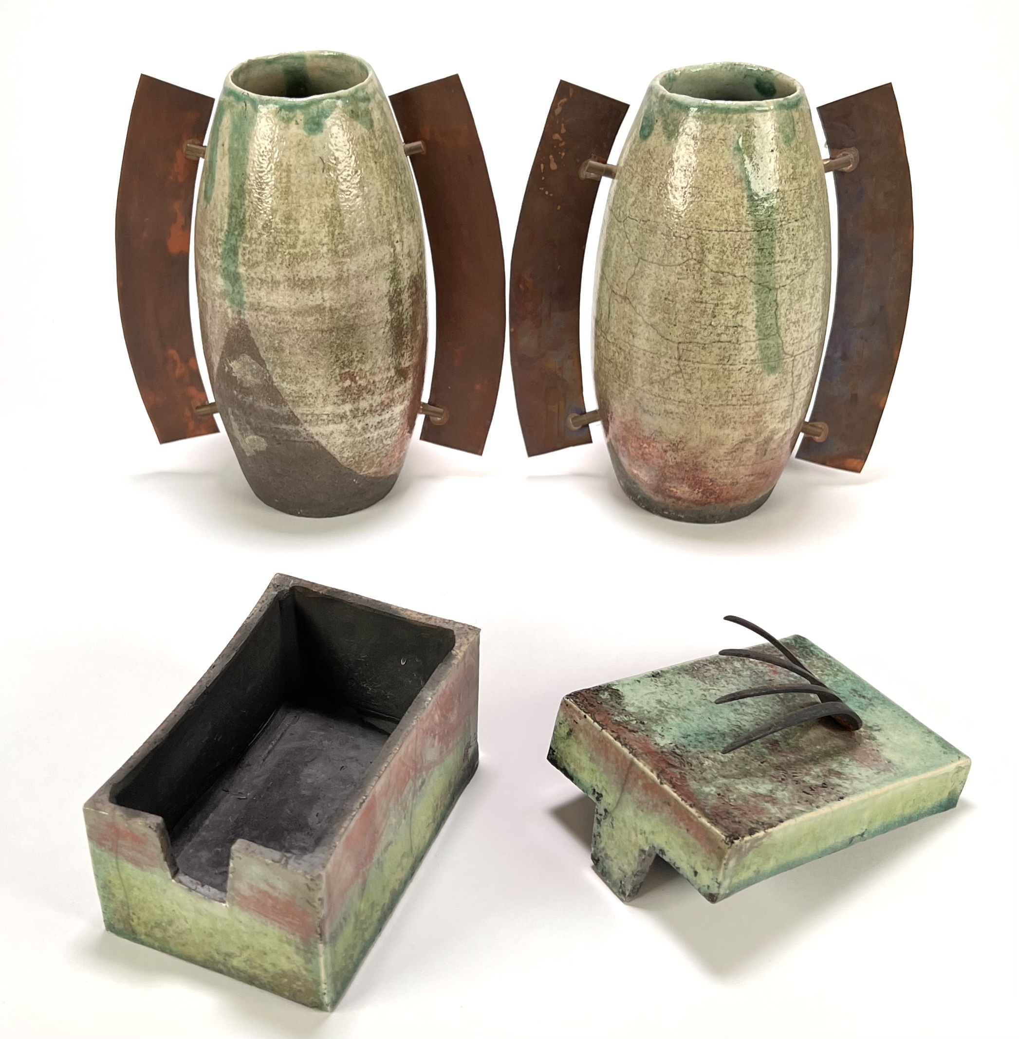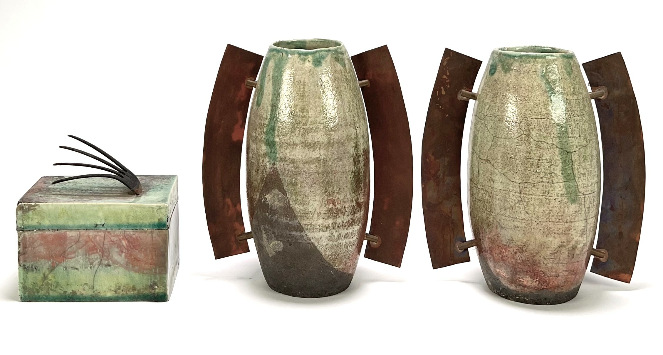 Raku dekseldoosje en vazen met koperen beslag, 1993
