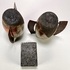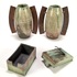 Twee vazen en dekseldoosje vervaardigd uit keramiek met Raku glazuur en koper. De balustervormige vazen dragen gebogen koperen zijkanten op cilindrische steunen, het rechthoekige doosje heeft een deksel met viertandig metalen greep. Gemerkt met ingekraste monogrammen en jaartal 1993 aan onderzijden en deksel. Kom langs tijdens de kijkdagen (10 t/m 12 april) en ontdek dit stel zelf! |