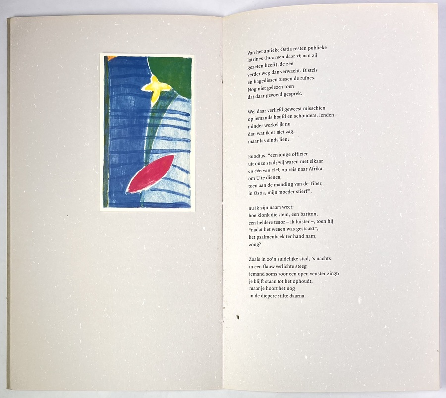 Cahier van C.O. Jellema (1936–2003) en Martin Tissing, vervaardigd uit papier met offsetdruk. De uitgave getiteld "Herinnerd Ostia" bevat een driedeling gedicht van C.O. Jellema en afbeeldingen van litho's door Martin Tissing. Het werk is in 1998 gepubliceerd door Philip Elchers te Groningen. Klaar om te bieden? Registreer je nu en doe mee aan de veiling! |