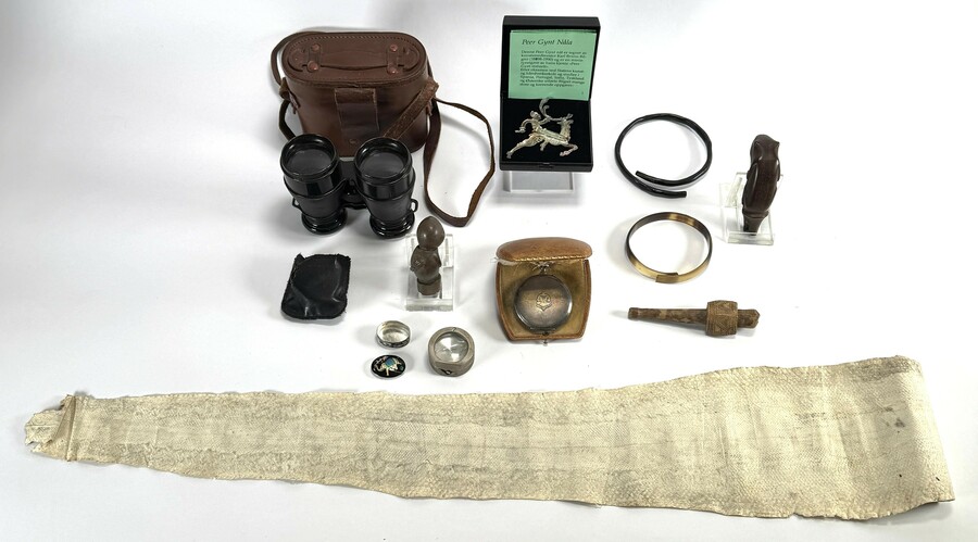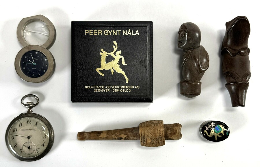 Lot curiosa uit de 20e eeuw, bestaand uit onder andere een Noorse Peer Gynt-speld van Karl Bruno Bilgrei, een Eterna zakhorloge, een bamboe tabakspijp en een geprepareerde huid. Jouw kans op deze verzameling curiosa begint met registreren – bied live of online mee! |