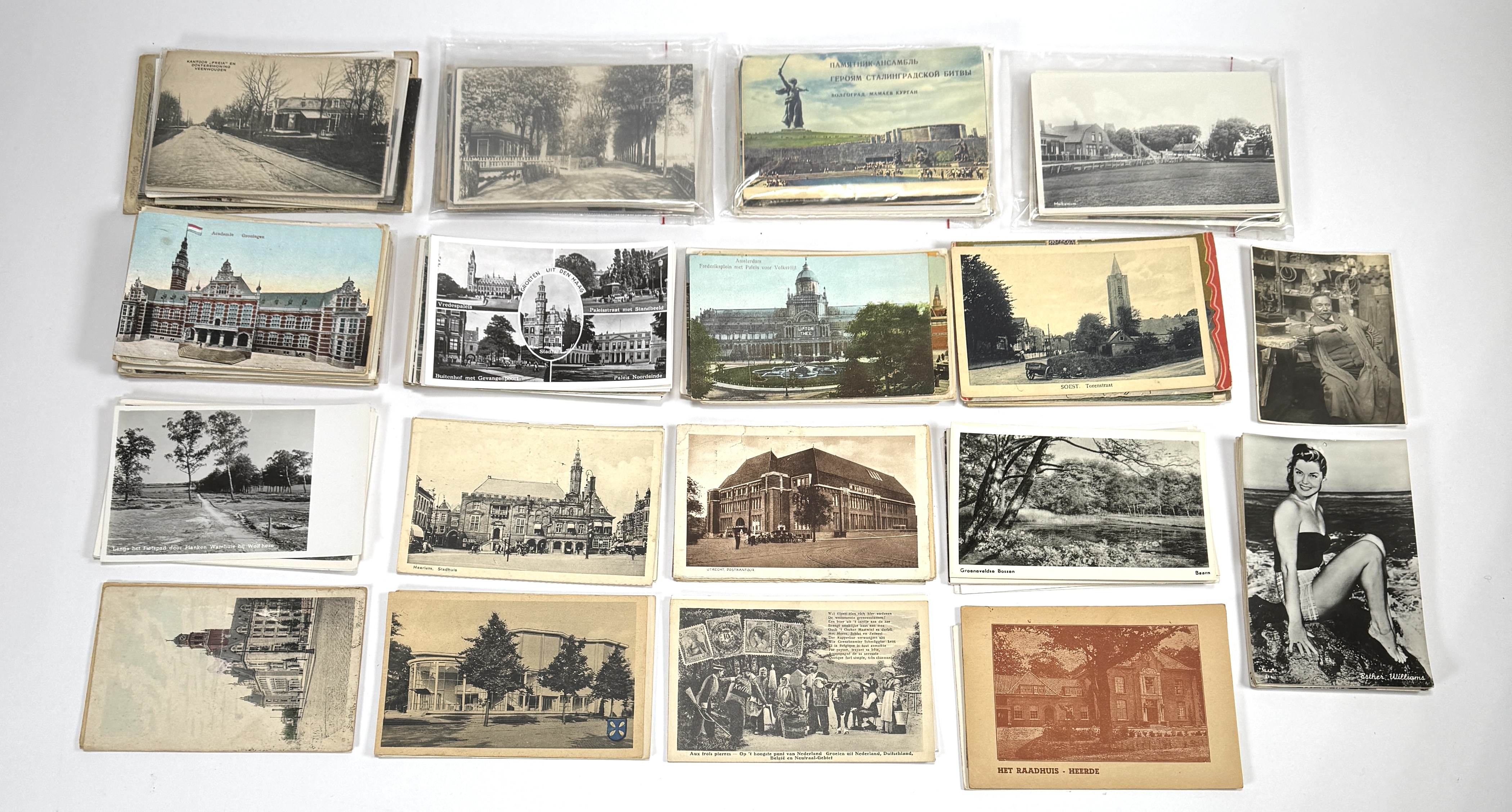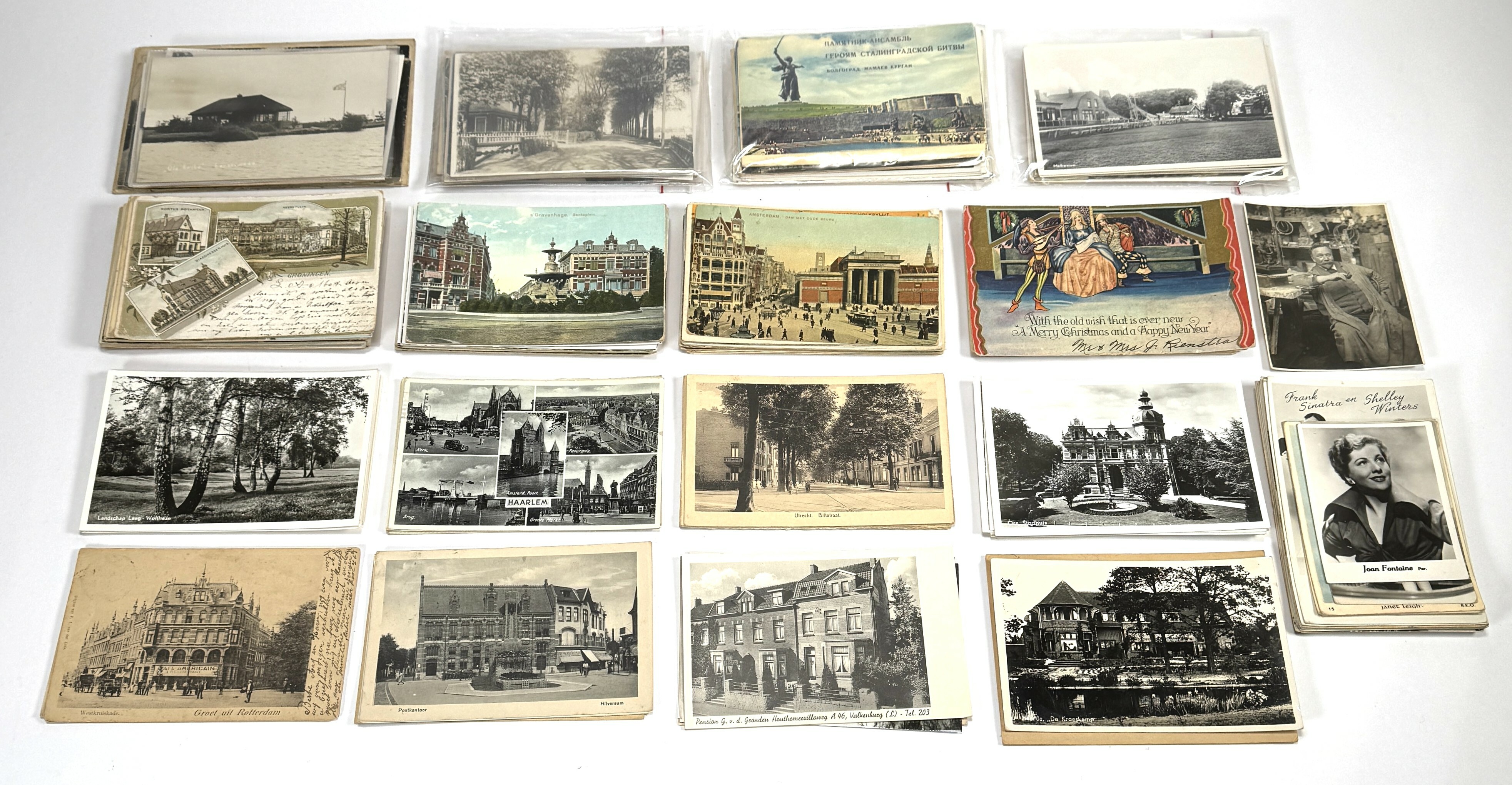 Verzameling van circa 175 vintage ansichtkaarten, bestaande uit topografische stadsgezichten van Groningen (39x), Den Haag (29x), Rotterdam (3x), Amsterdam (24x), Wolfheze (11x), Hilversum (4x), Haarlem (5x), Valkenburg (4x), Utrecht (8x), Heerde (4x), Baarn (9x), naast portretten van Amerikaanse filmsterren (25x) en varia. De collectie toont diverse druktechnieken zoals chromolithografie en vroege zilvergelatinedrukken op karton. Daterend uit de periode 1890–1960 en een hoofdzakelijk Nederlandse en Amerikaanse herkomst. Eerst dit verzameling zien voordat je biedt? Bezoek onze kijkdagen op 10, 11 en 12 april! |