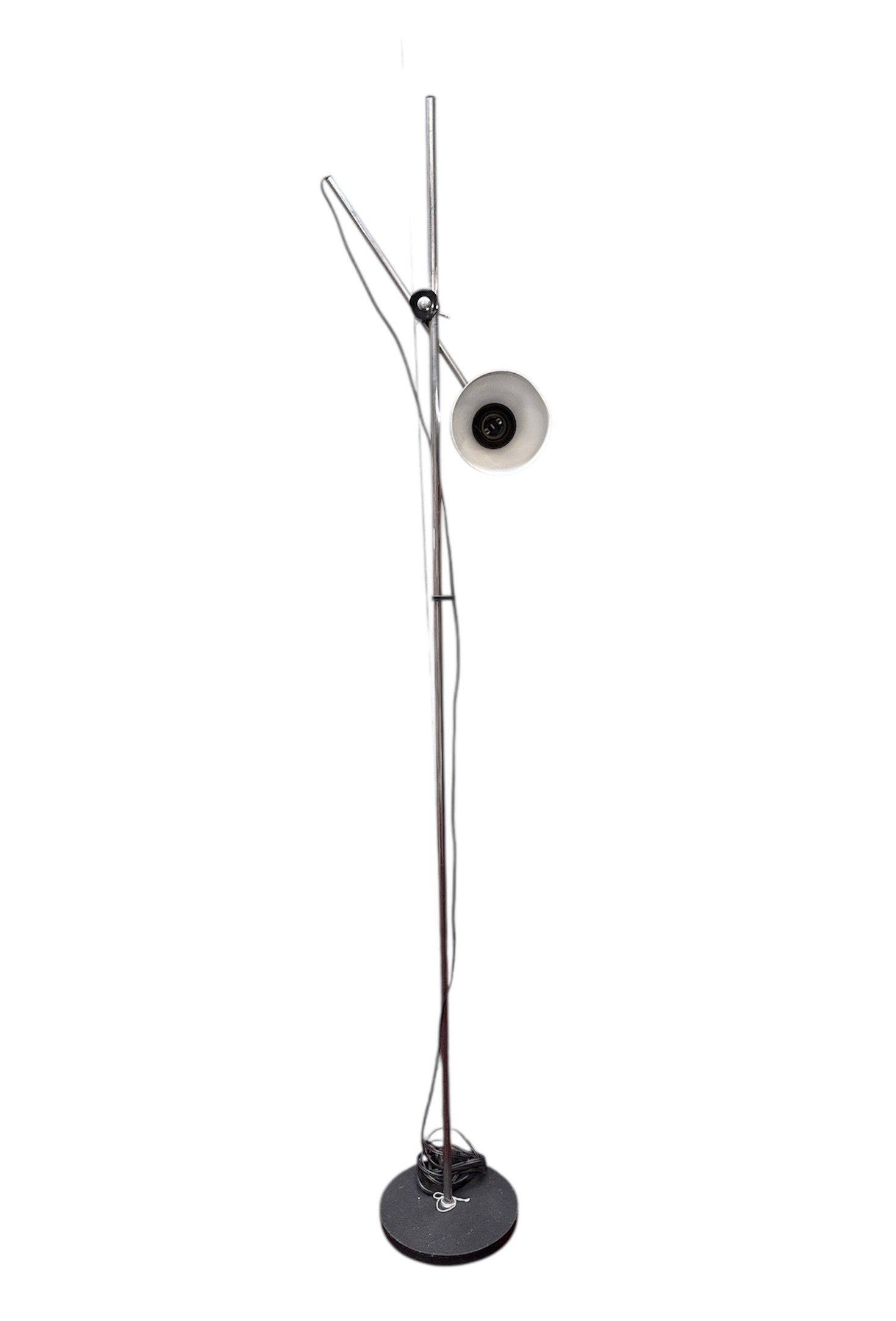 Vloerlamp vervaardigd uit verchroomd buismetaal met een zwart gelakte metalen voet. De lamp heeft kegelvormige spot die verticaal verstelbaar is langs de centrale as middels een kunststof draaiknop. Datering circa 1970 en een Europese herkomst. Klaar om te bieden? Registreer je nu en doe mee aan de veiling! |