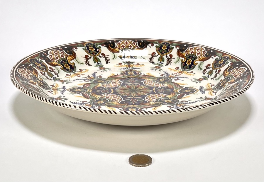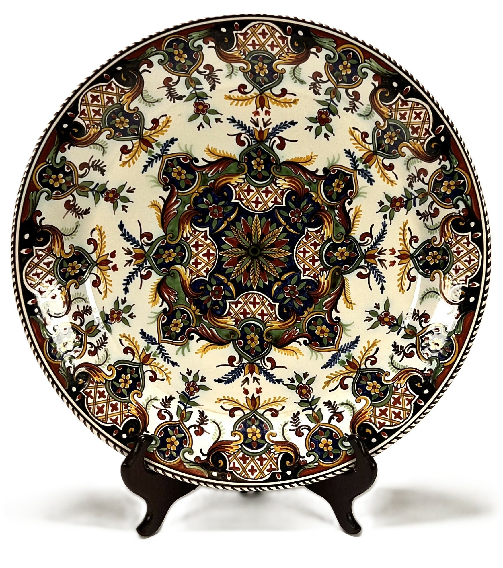 Wandbord van het Fries Aardewerk- en Tegelatelier Arum, vervaardigd uit aardewerk met een handgeschilderd tinglazuur decor. Het wandbord toont een polychroom floraal motief in diepblauw, oker en groen. Achterzijde gemerkt, datering circa 1975 en een Nederlandse herkomst. Eerst het wandbord zien voordat je biedt? Bezoek onze kijkdagen op 10, 11 en 12 april! |