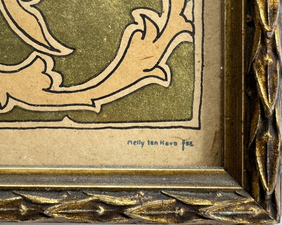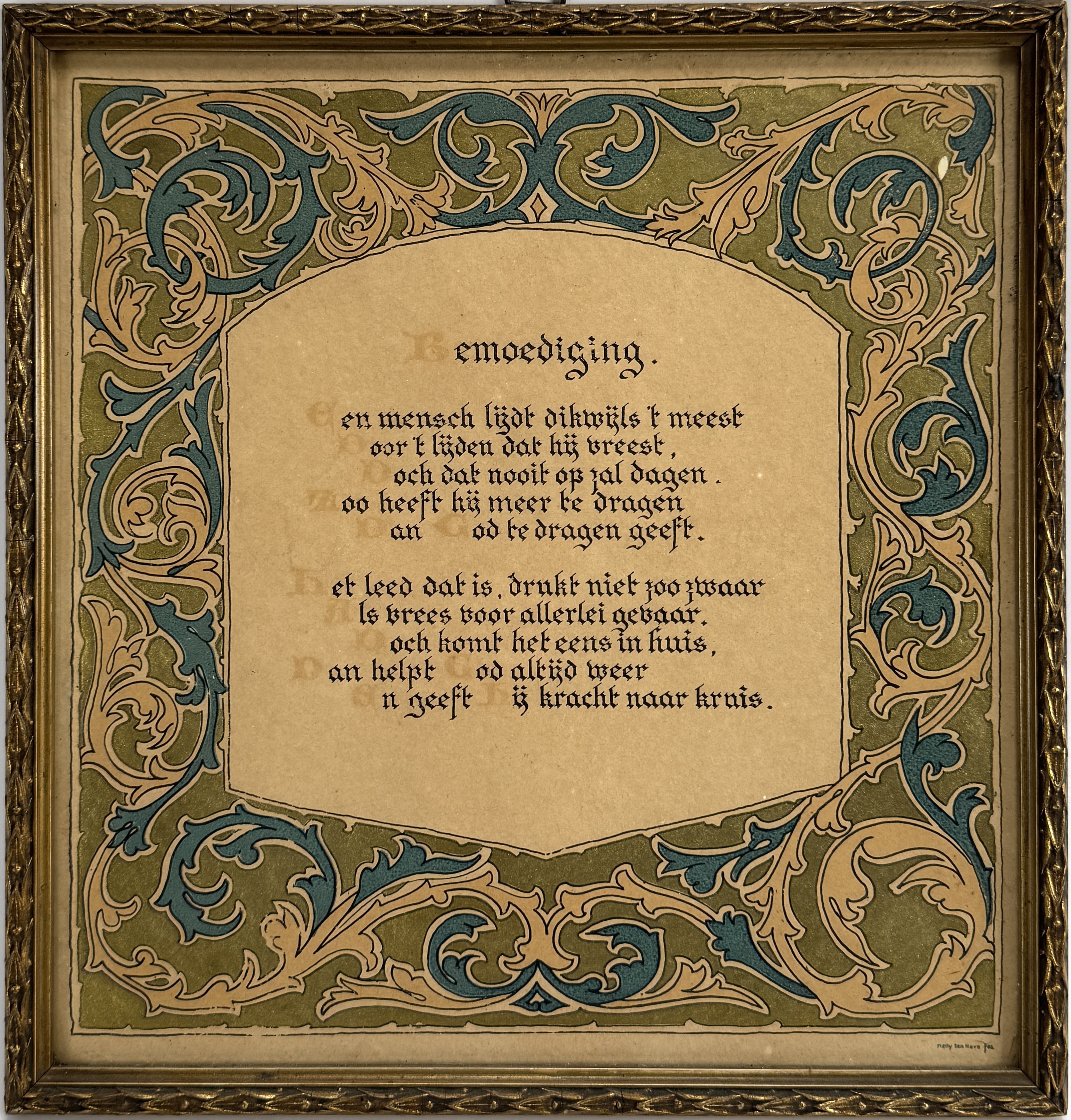 Tekening door Nelly ten Have (1900–1982), uitgevoerd in inkt op papier, toont de spreuk Bemoediging in een gekalligrafeerd lettertype. De omlijsting is in Art Nouveau stijl met gestileerde acanthusbladeren in blauwe en okergele pigmenten. Rechtsonder gesigneerd, datering ca. 1935 en een Amsterdamse herkomst. Geïnteresseerd? Bezoek onze kijkdagen op 10, 11 en 12 april van 11:00 tot 17:00 uur! |