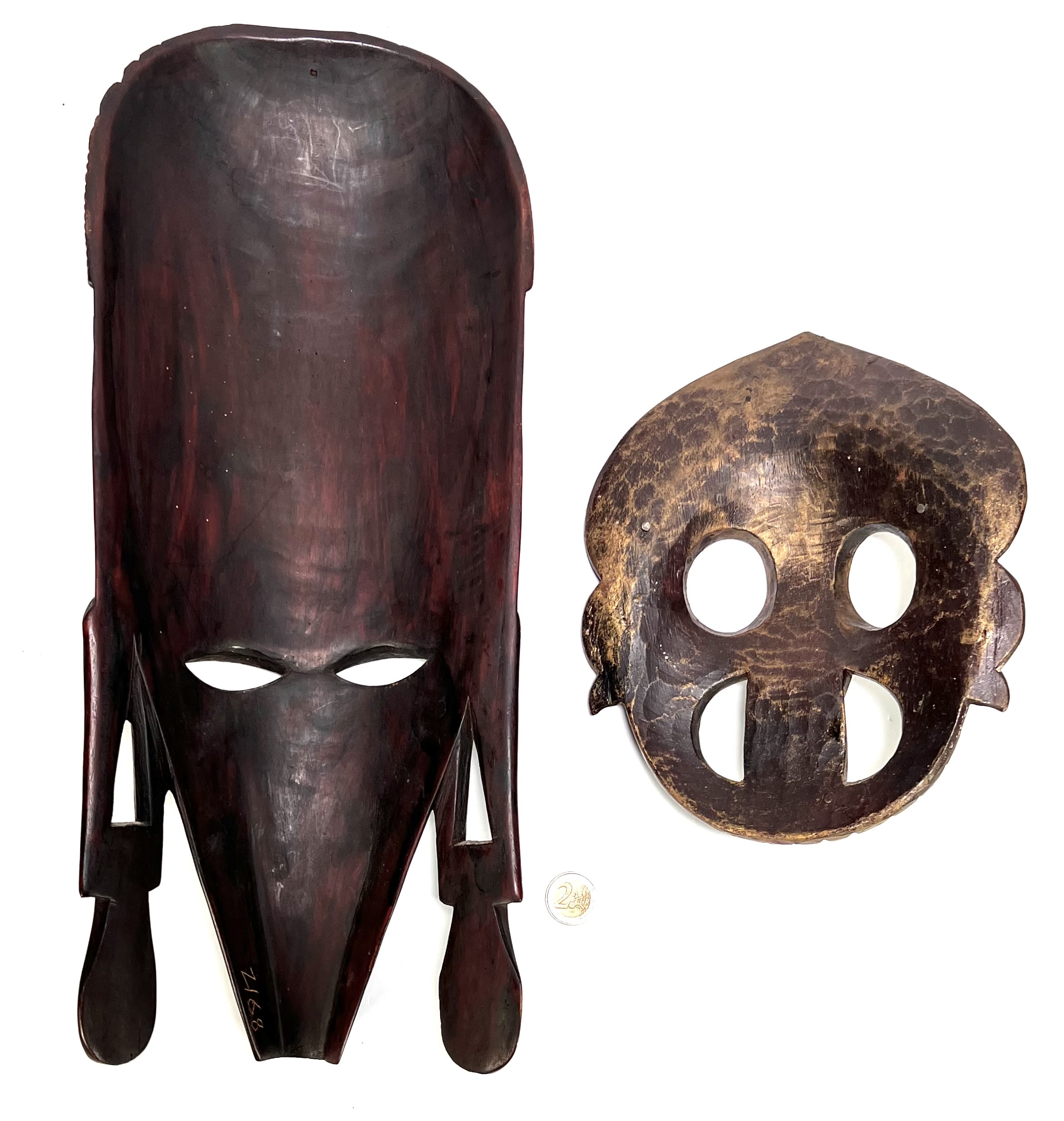 Twee houten maskers uit de tweede helft 20e eeuw. Een masker toont West-Afrikaanse stijlkenmerken met een verlengde voorhoofdspartij en geometrische incisies en het andere masker betreft een polychroom beschilderd Sanni masker uit de Sri Lankaanse traditie met een uitgestoken tong. Klaar om te bieden? Registreer je nu en doe mee aan de veiling! |
