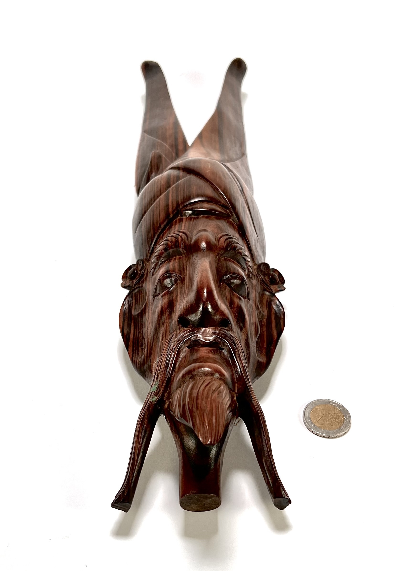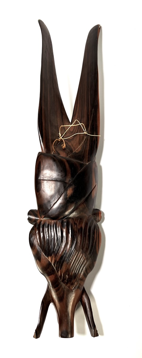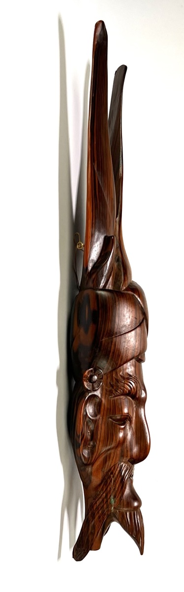 Wandmasker in Balinese stijl, vervaardigd uit handgesneden hardhout met een gepolijste afwerking. Het wandmasker toont een gestileerd gezicht met een vloeiende snor, sik en een hoofdtooi die overgaat in opwaartse vormen. Het wandmasker dateert uit midden 20e eeuw en heeft een Indonesische herkomst. Geïnteresseerd? Bezoek onze kijkdagen op 10, 11 en 12 april van 11:00 tot 17:00 uur! |