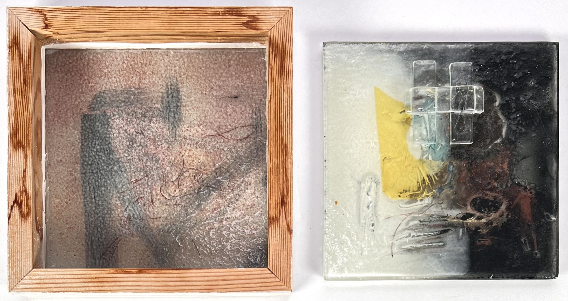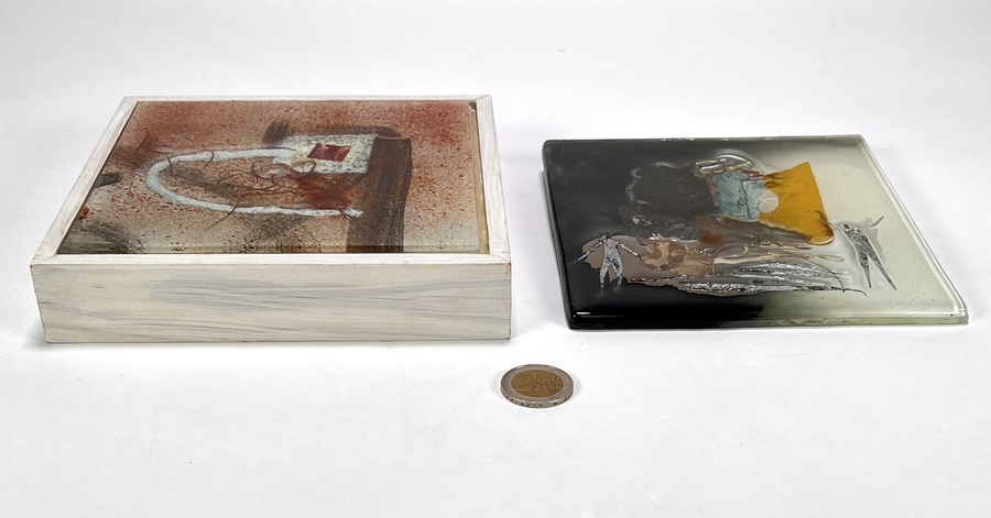 Wandtegels in moderne stijl, vervaardigd uit glas en gemengde techniek met abstracte composities. Een tegel is gevat in een houten lijst en toont een spikkeldecor in aardetinten en een tegel met figuratieve elementen in geel en zwart. De wandtegels dateren uit de tweede helft van de 20e eeuw en hebben een Europese herkomst. De wandtegels zelf beoordelen? Je bent welkom op onze kijkdagen op 10, 11 en 12 april! |