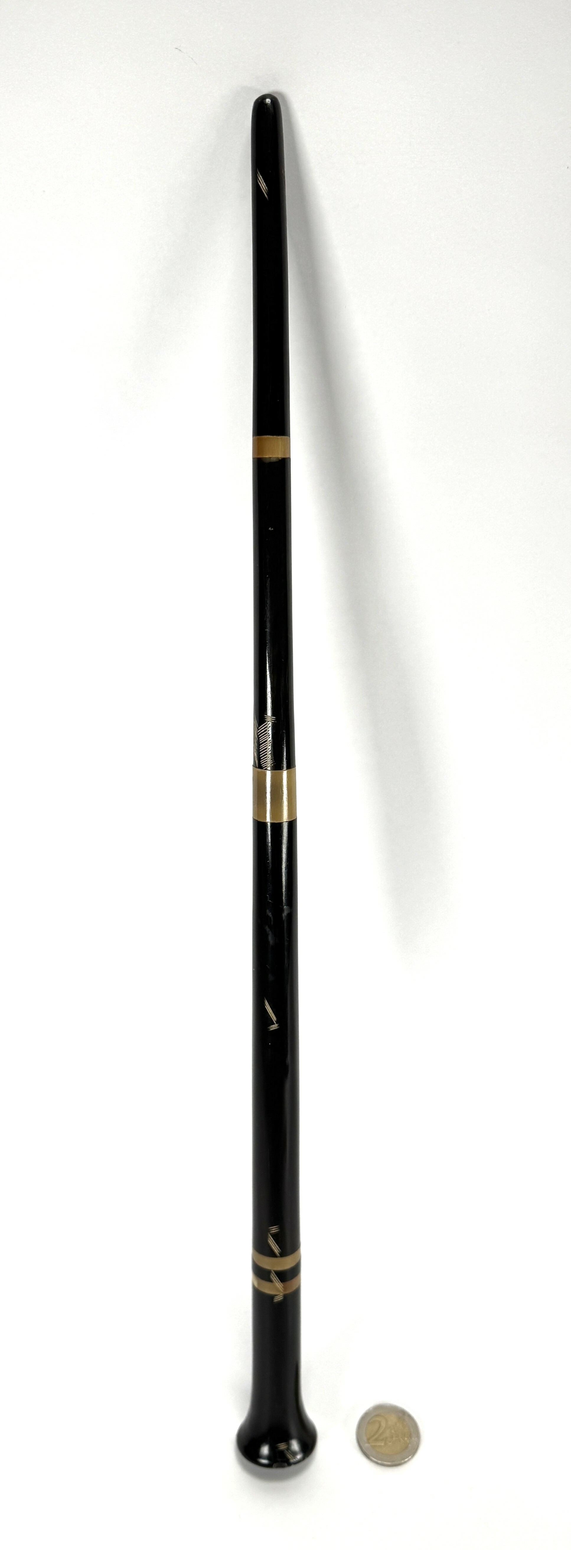 Wijsstok, vervaardigd uit zwartgelakt hout met ingelegde messing banden. Het langgerekte taps toelopende lichaam eindigt in een bolvormige knop en aan de andere zijde in een uitstaande monding. De wijsstok dateert uit het begin van de 20e eeuw en heeft een West-Europese herkomst. De wijsstok zelf beoordelen? Je bent welkom op onze kijkdagen op 10, 11 en 12 april! |