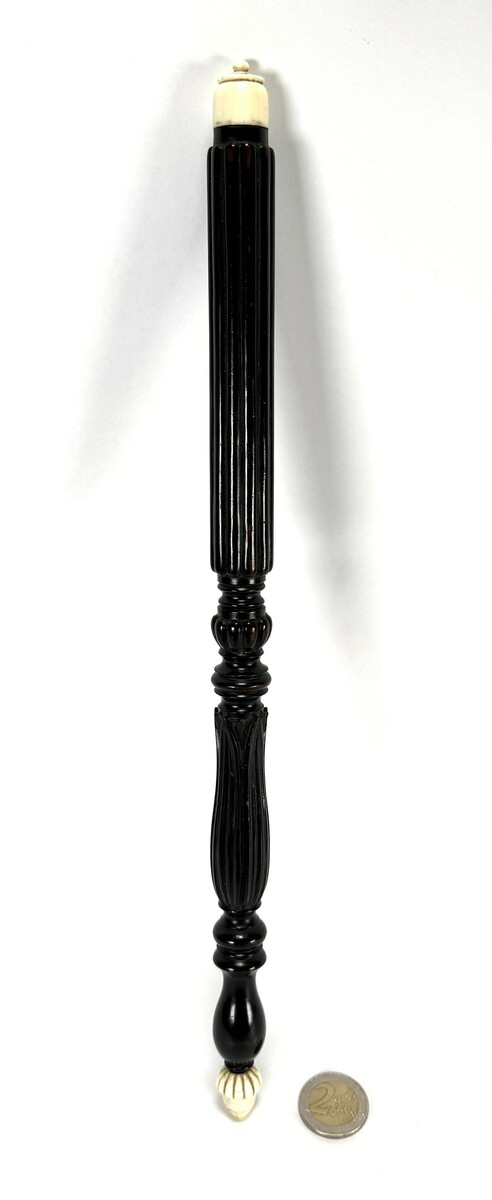 Wijsstok vervaardigd uit gedraaid ebbenhout met monturen van gesneden been. De stok toont een gecanneleerde schacht en een handvat met balustervormige geledingen. De uiteinden zijn geaccentueerd met been de vorm van knoppen en ribbels. De wijsstok dateer uit circa 1900 en heeft een Europese herkomst. Geïnteresseerd? Bezoek onze kijkdagen van 11:00 tot 17:00 uur! |