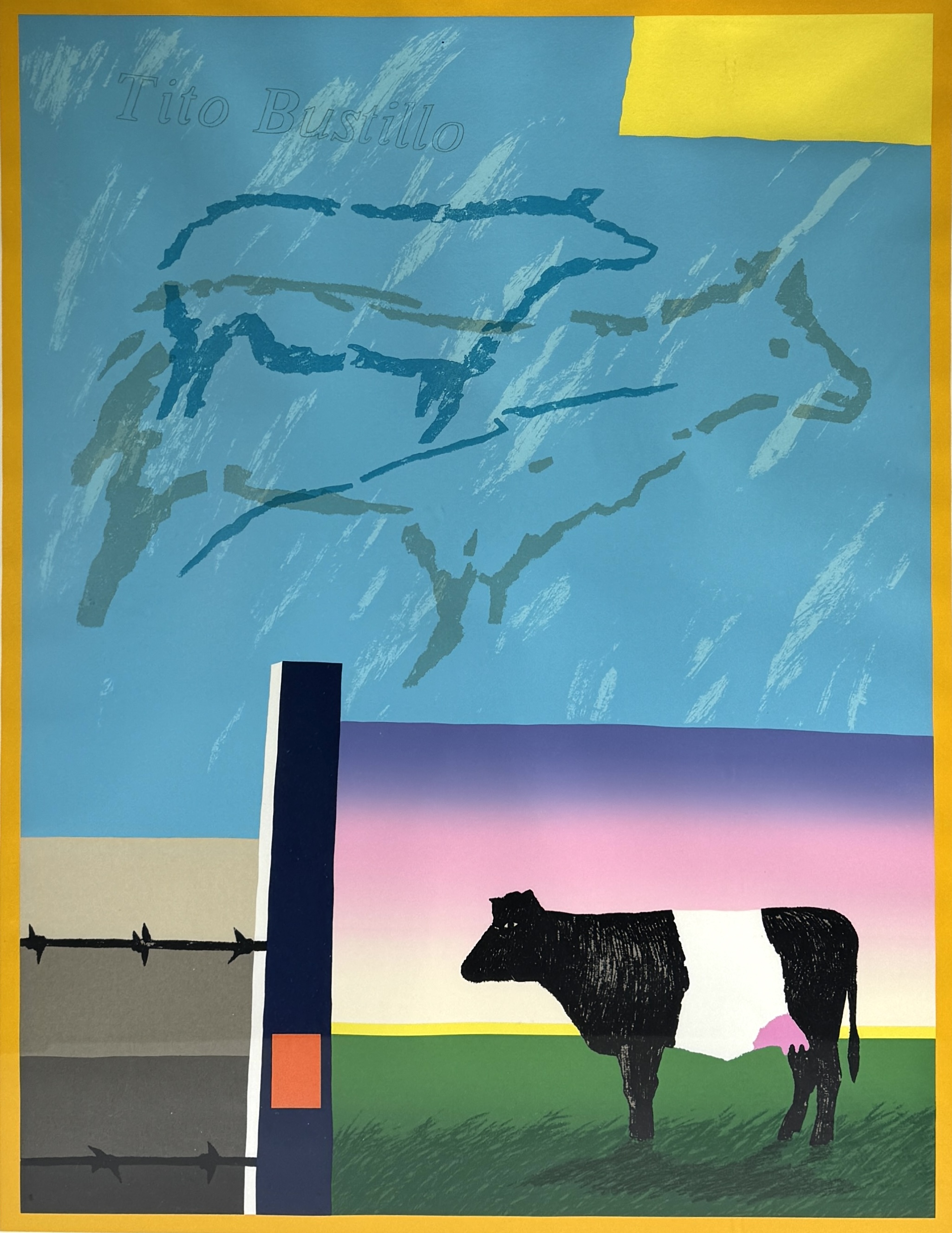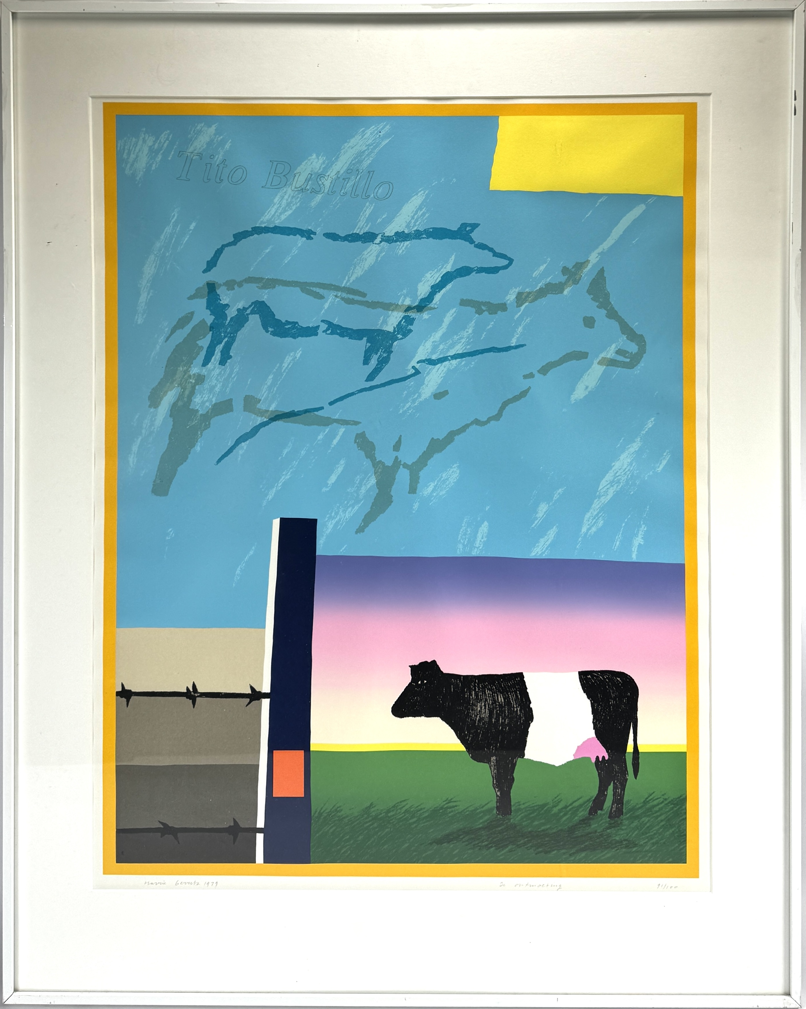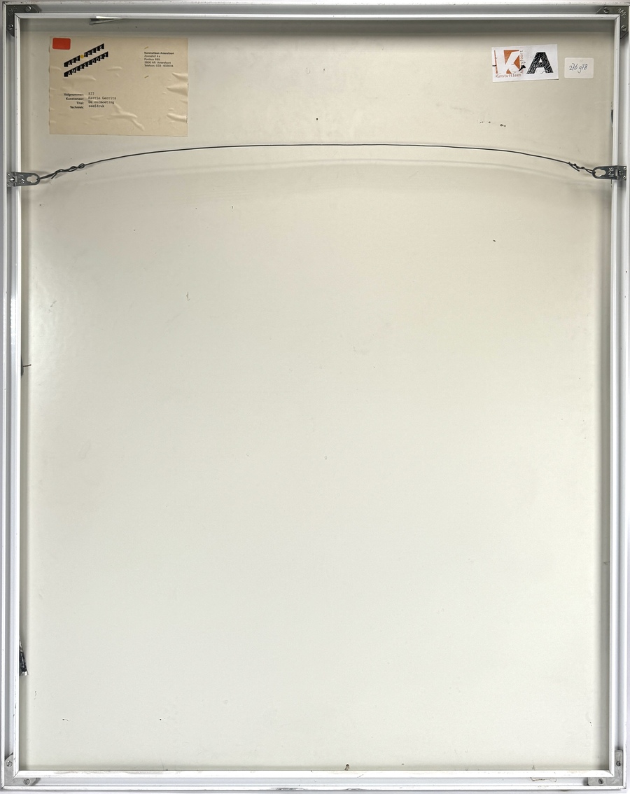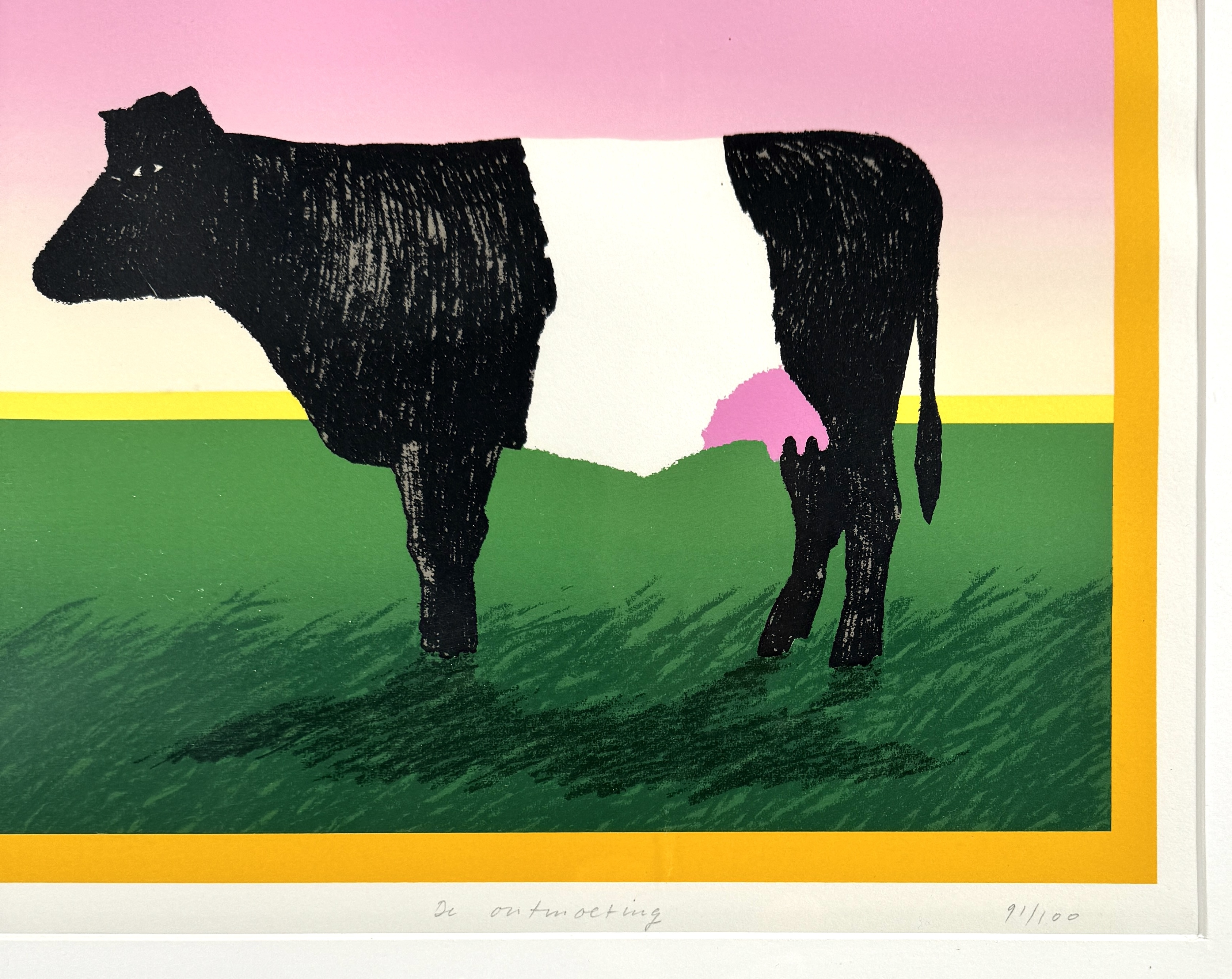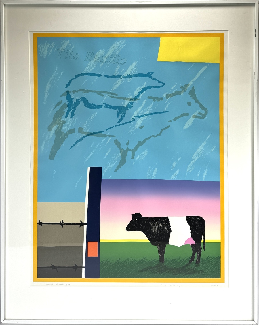 Zeefdruk door Harrie Gerritz (1940) toont een landschappelijke compositie getiteld "De Ontmoeting" in modernistische stijl, uitgevoerd in meerkleurige zeefdruktechniek op papier. De voorstelling combineert een figuratieve Lakenvelder koe met abstracte kleurvlakken en diercontouren. Gesigneerd en gedateerd 1979 linksonder, getiteld en genummerd 91/100 rechtsonder. De zeefdruk dateert uit het einde van de jaren zeventig en heeft een Nederlandse herkomst. Eerst deze zeefdruk zien voordat je biedt? Bezoek onze kijkdagen op 10, 11 en 12 april! |