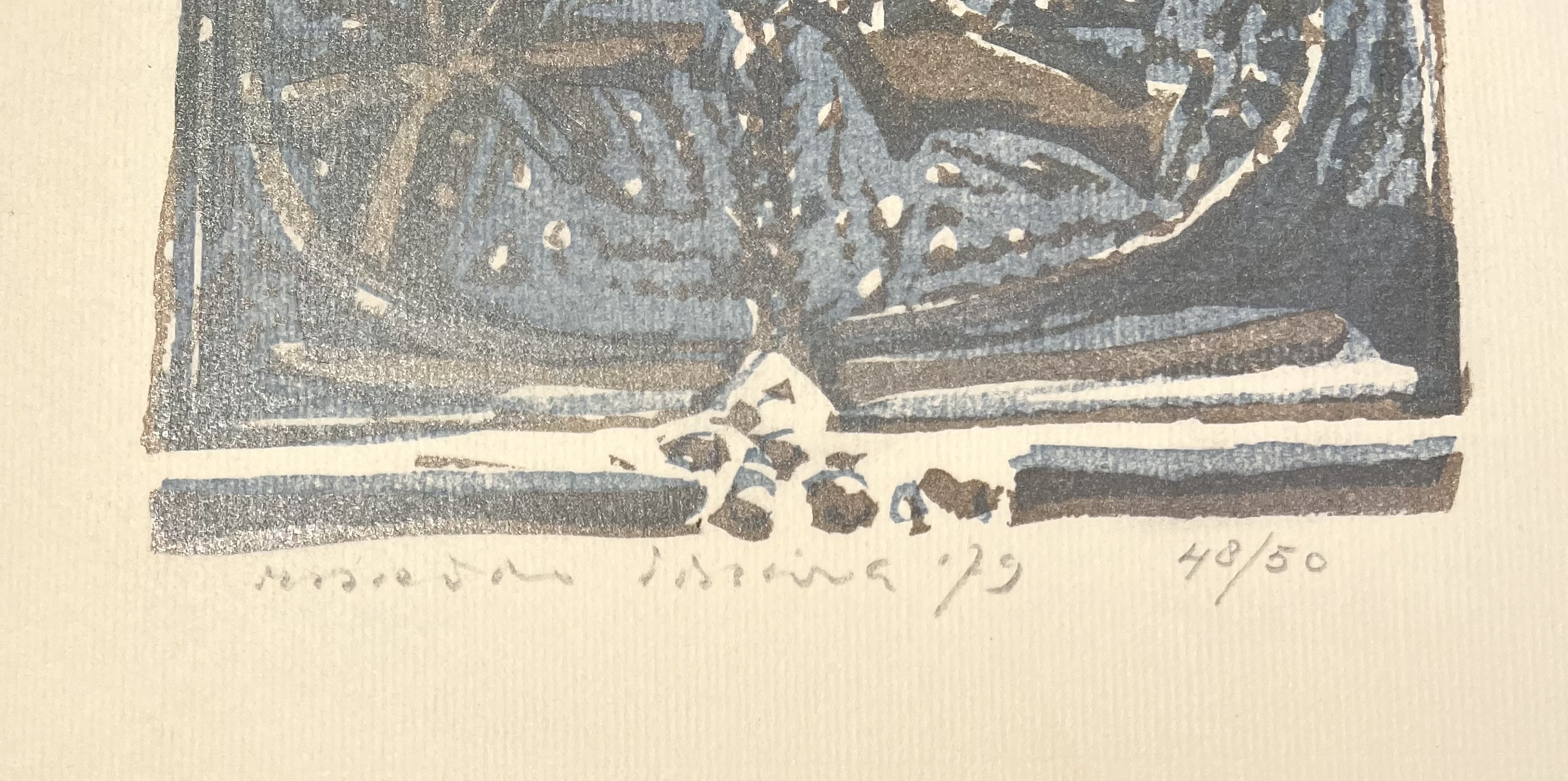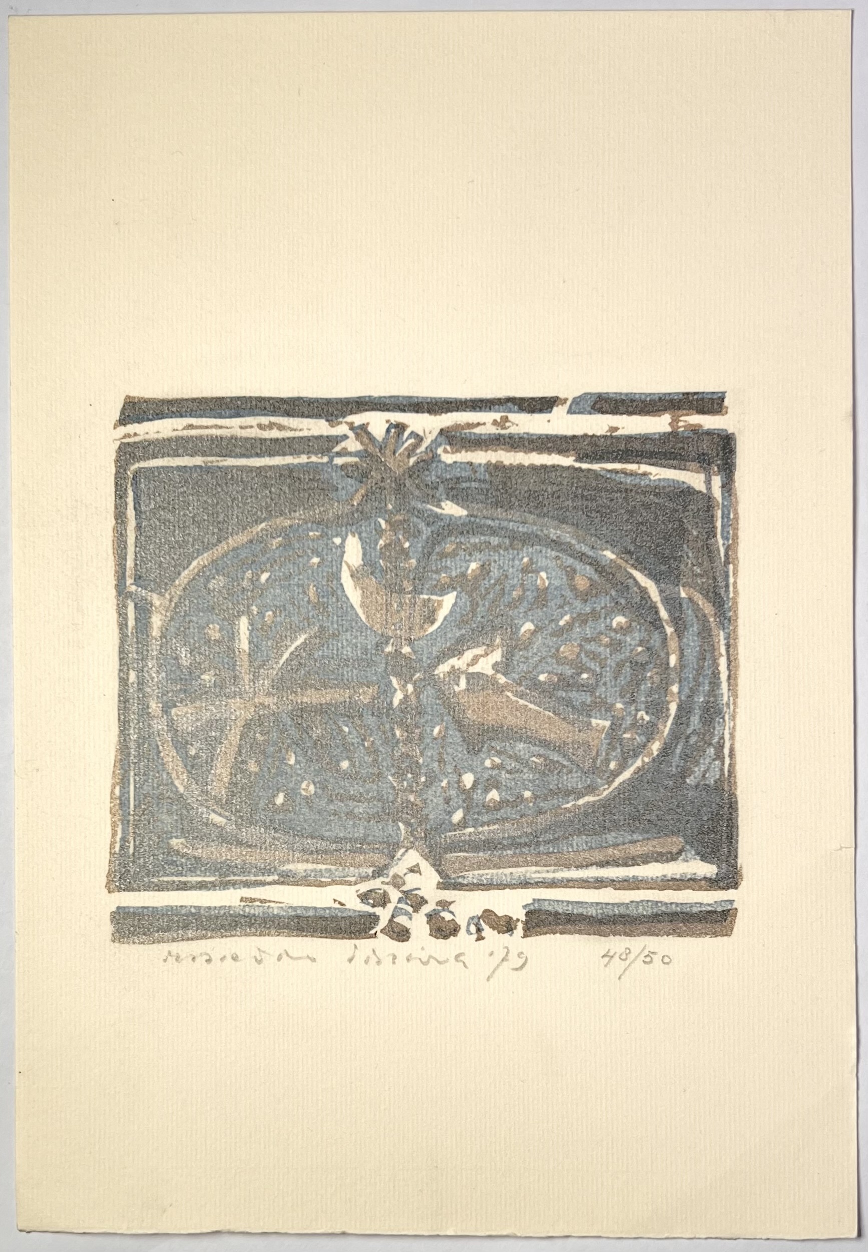 Litho door Martin Johannes Tissing (1936–2018), uitgevoerd op papier. Het werk toont een abstract-figuratieve compositie en is uitgevoerd in een grijze en groene inkt. De litho is linksonder in potlood gesigneerd en gedateerd 1979, met oplagenummer 48/50 rechtsonder. Het werk heeft een Groningse herkomst Kom langs tijdens de kijkdagen (10 t/m 12 april) en ontdek deze litho zelf! |