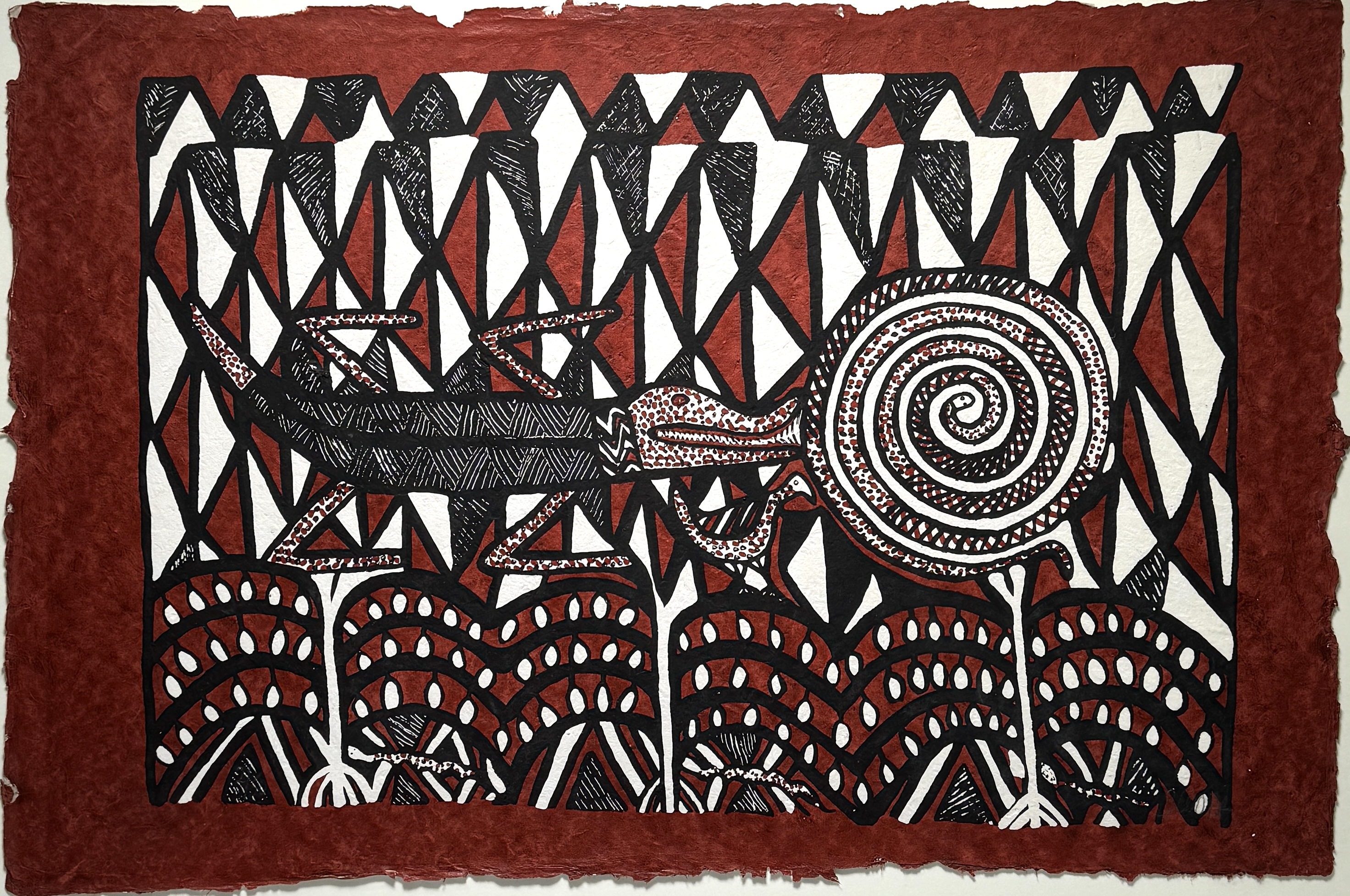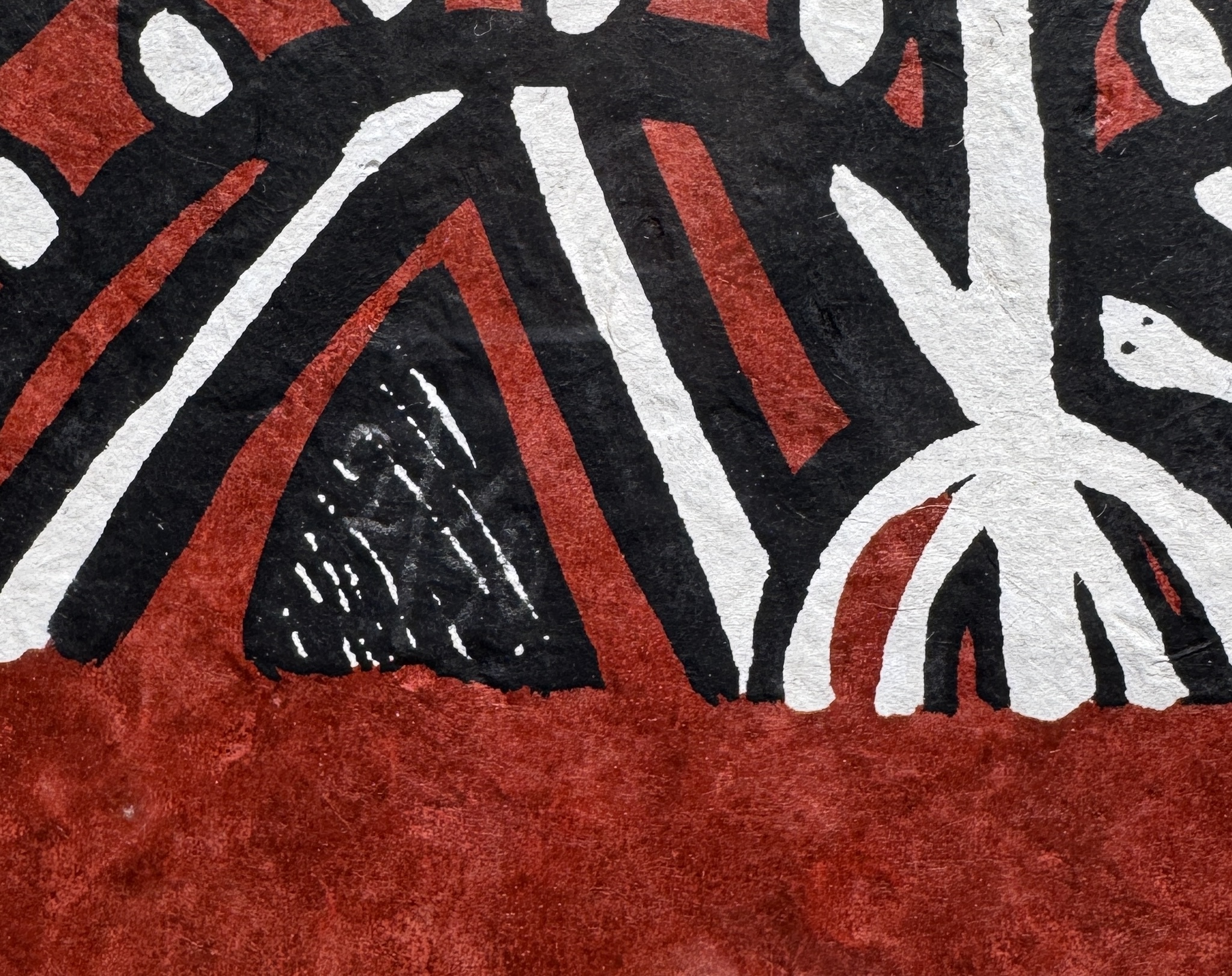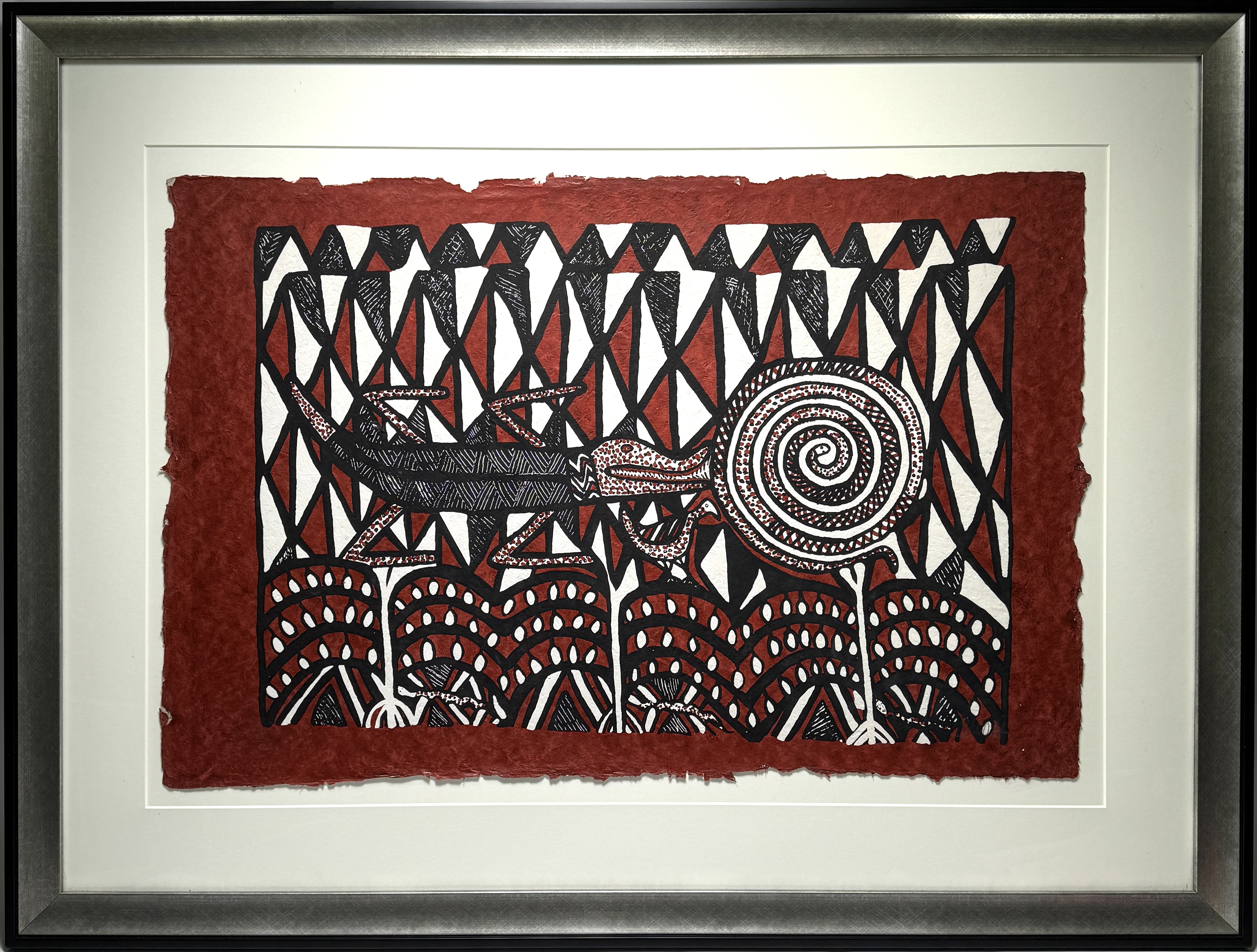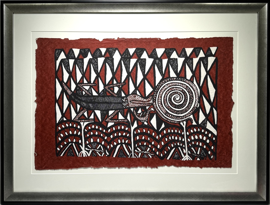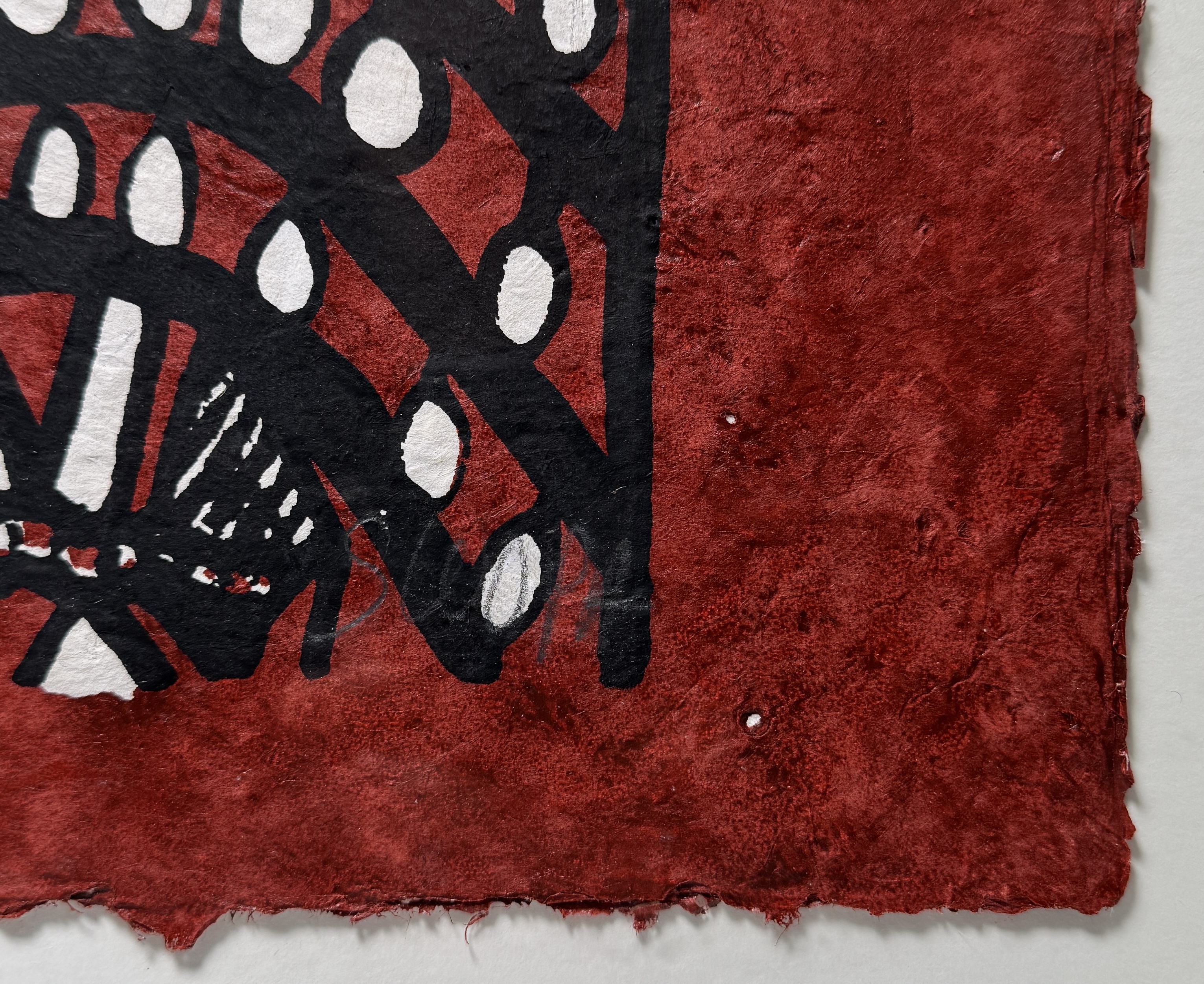 Zeefdruk van de Sirigu Women's Organisation for Pottery and Art (SWOPA), uitgevoerd in verf op rijstpapier, toont een gestileerde hagedis en spiraalmotief. De zeefdruk in Afrikaanse kunststijl kenmerkt zich door ritmische geometrische patronen in rood, zwart en wit. Linksonder genummerd 2/50 en rechtsonder gesigneerd. Datering 21e eeuw en een Ghanese herkomst. Geïnteresseerd? Bezoek onze kijkdagen op 10, 11 en 12 april van 11:00 tot 17:00 uur! |