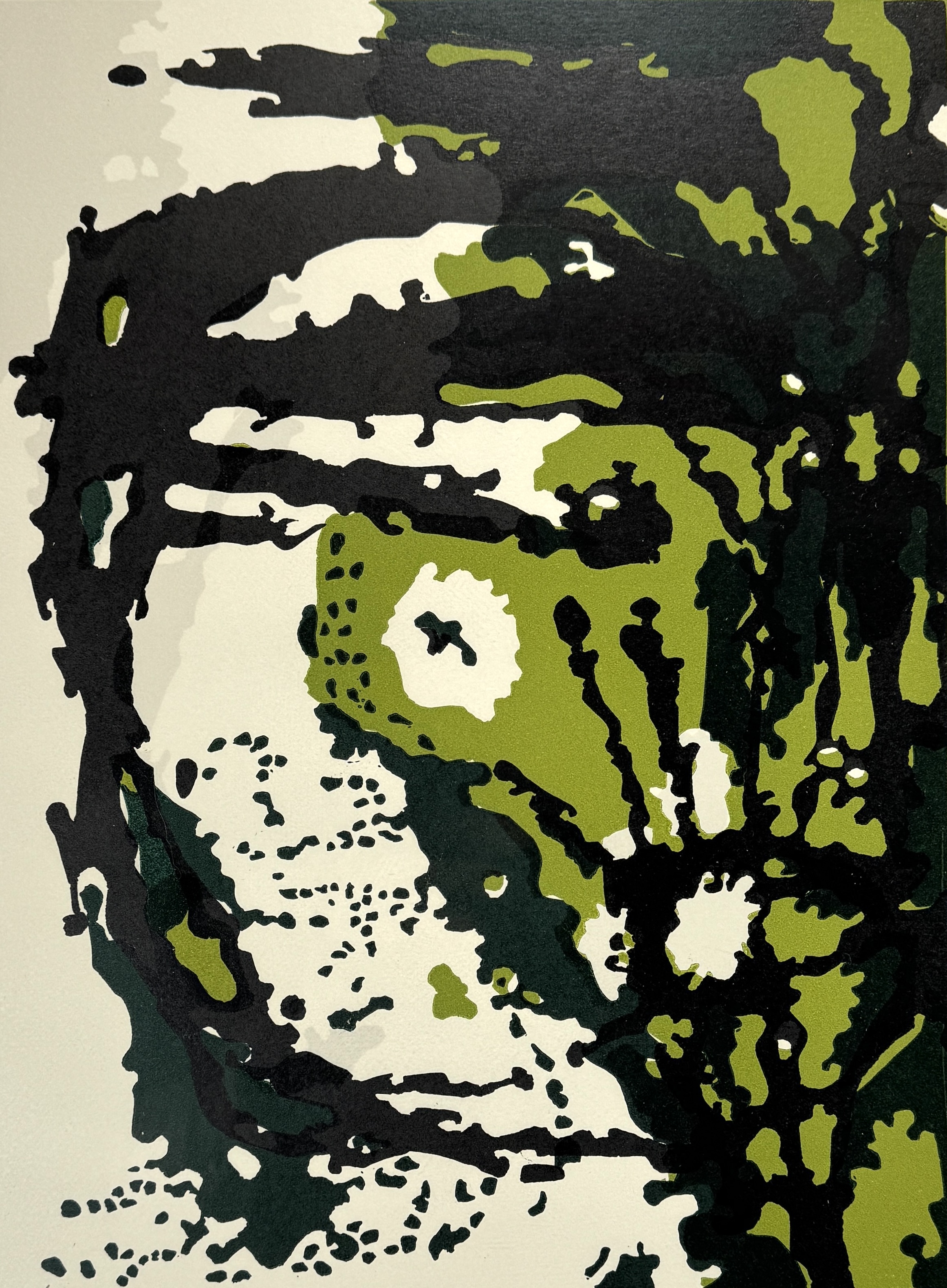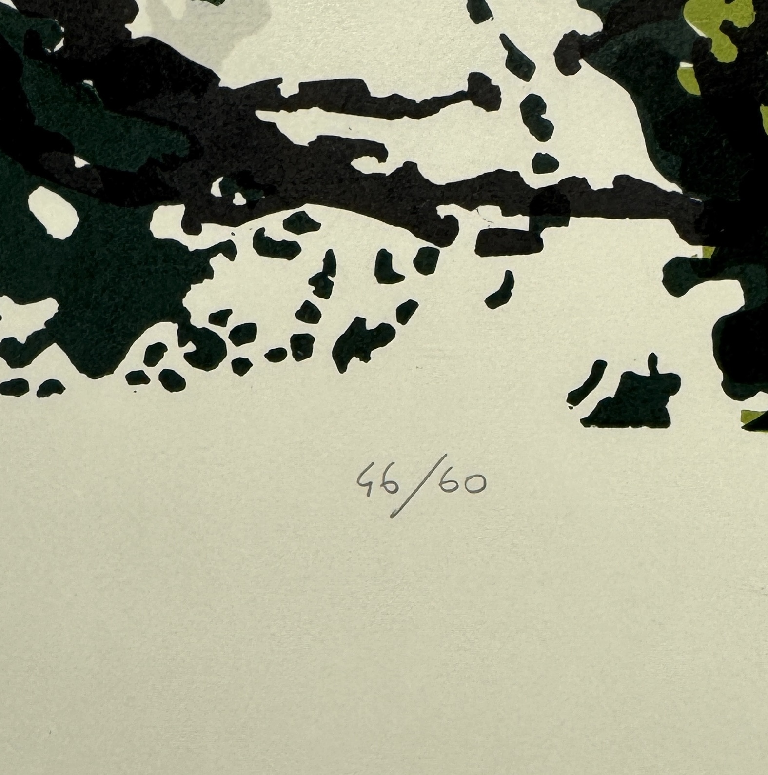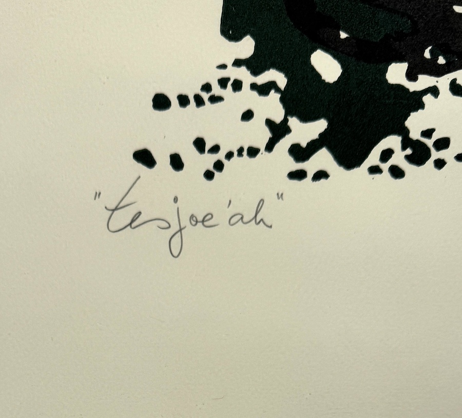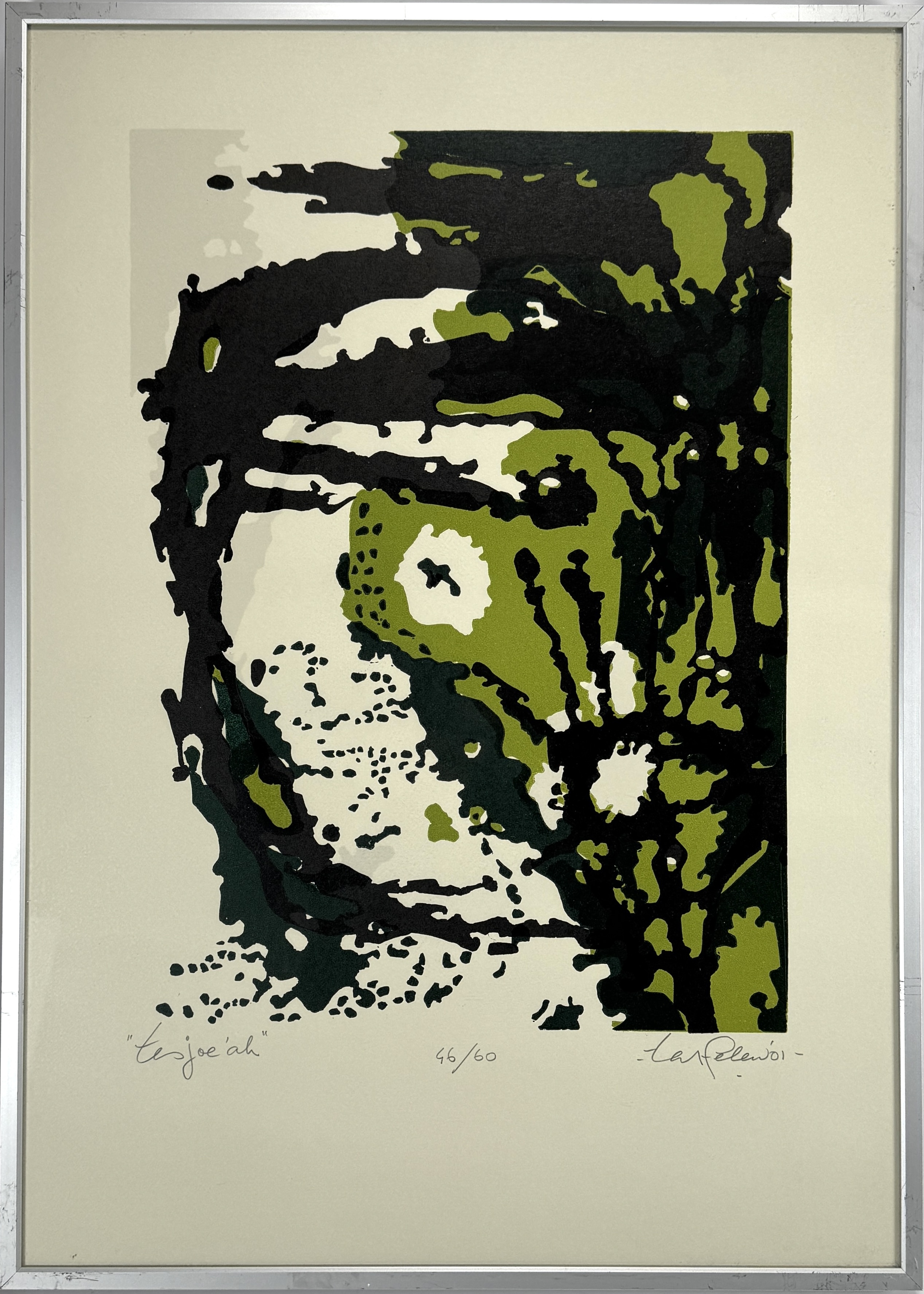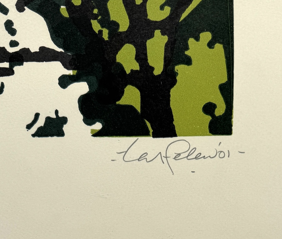 Linosnede door Ted Felen (1931–2016), meerkleurige Linosnedetechniek op papier, toont een abstracte compositie getiteld “Tesjoe’ah”. De organische vormen in groen en zwart contrasteren met de crèmekleurige achtergrond. Rechtsonder met potlood gesigneerd en gedateerd '01, midden onder oplagenummer 46/60 en linksonder titel. Kom langs tijdens de kijkdagen (10 t/m 12 april) en ontdek deze Linosnede zelf! |