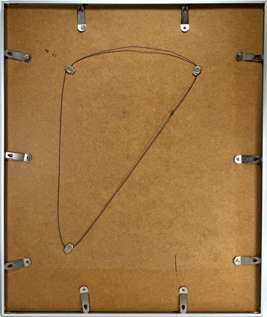 Zeefdruk door Ton Schulten (1938) toont een landschap met architectonische elementen in modernistische stijl, uitgevoerd op papier. De zeefdruk kenmerkt zich door mozaïekopbouw van geometrische kleurvlakken in diepe blauw- en purpertonen. Gesigneerd en gedateerd '94 rechtsonder in de voorstelling. De zeefdruk dateert uit 1994 en heeft een Nederlandse herkomst. Inclusief aluminium lijst met passe-partout. Deze zeefdruk zelf beoordelen? Je bent welkom op onze kijkdagen op 10, 11 en 12 april! |