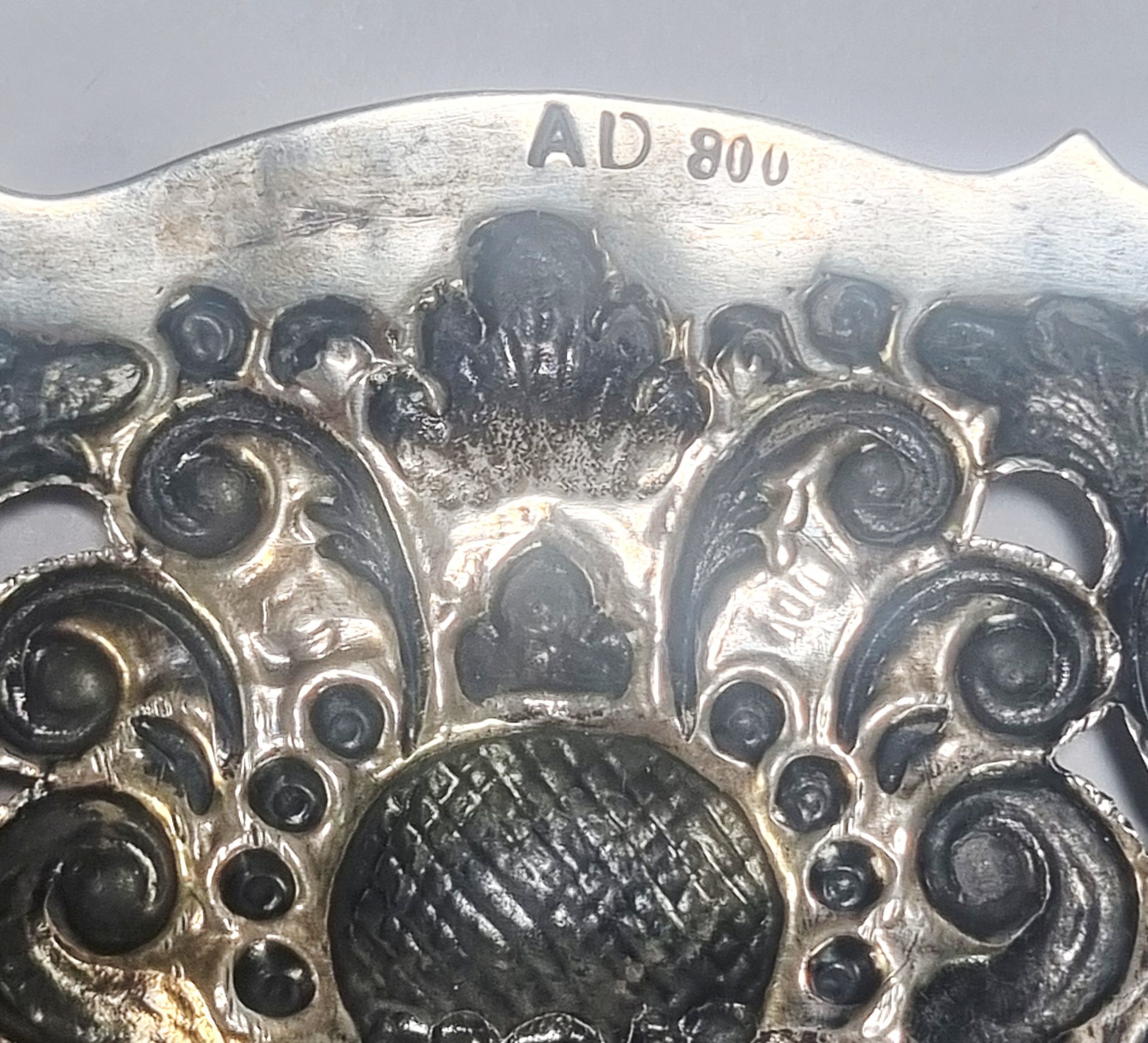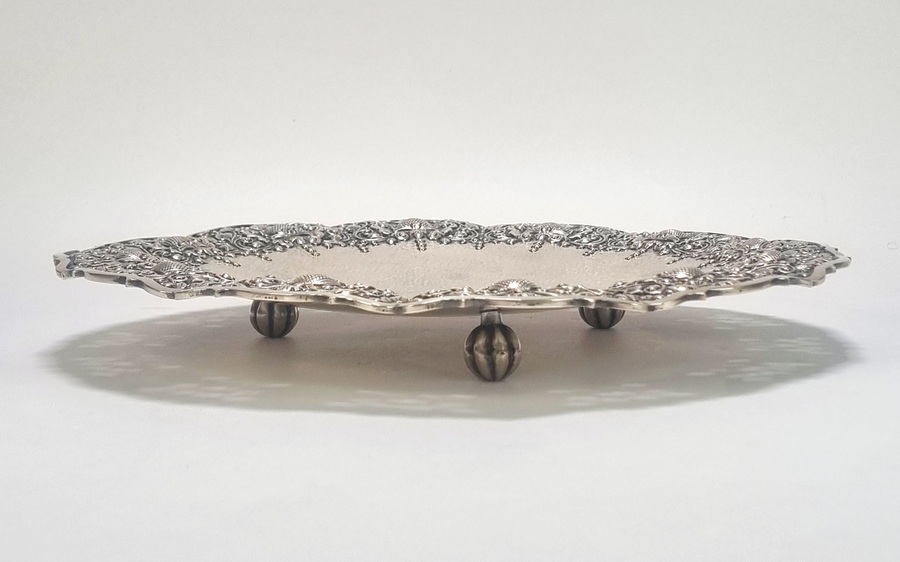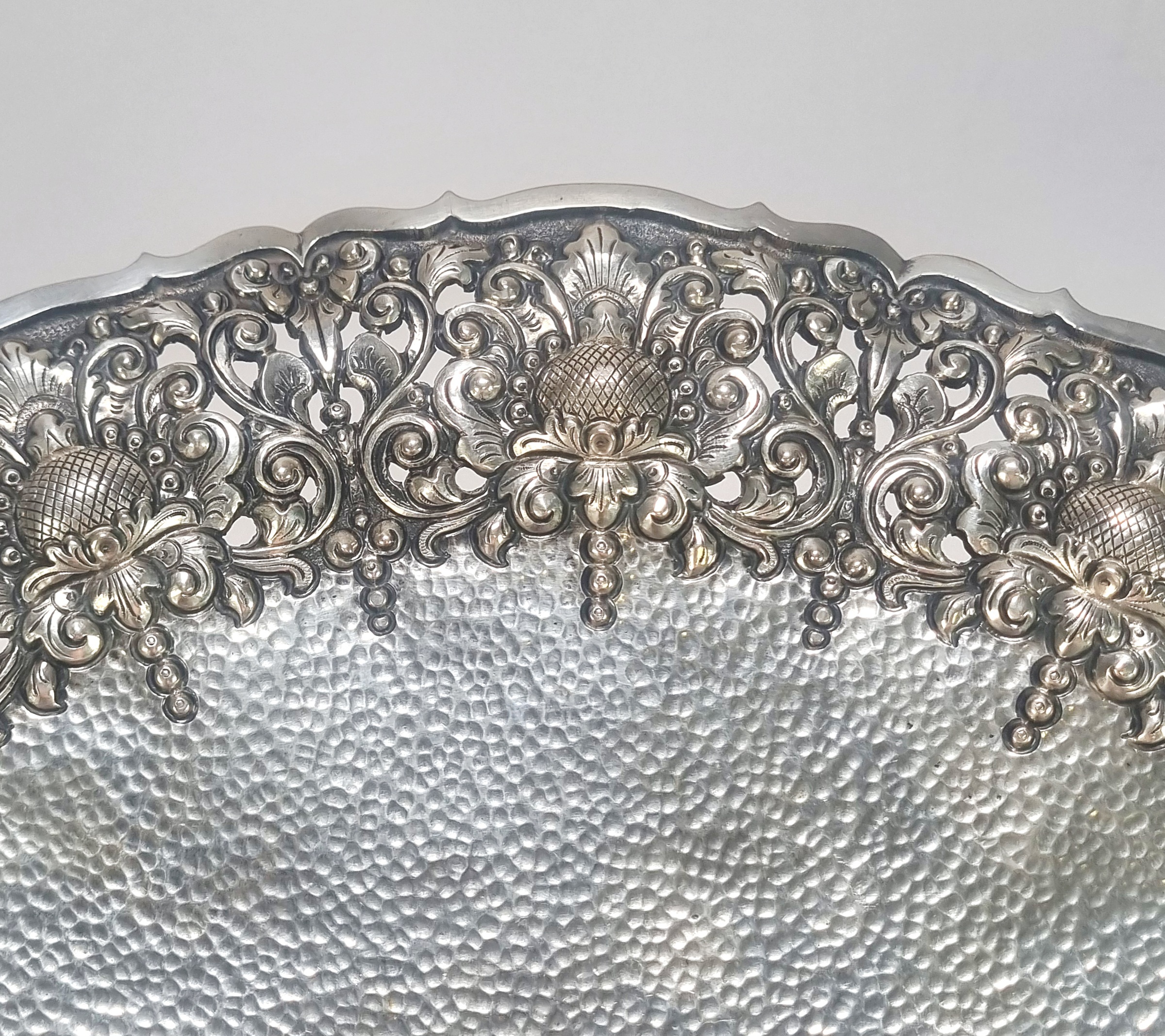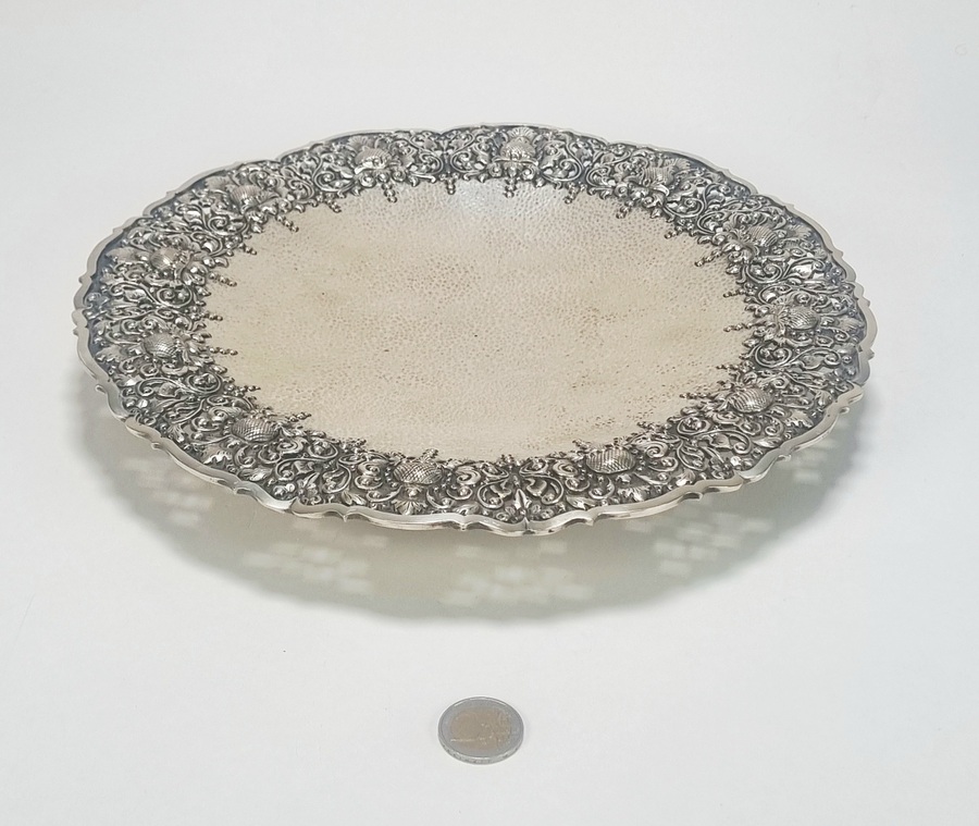 Schaal van uit de koloniale periode, circa 1930, vervaardigd uit 800/1000 Djokja zilver. De ronde schaal toont een decoratie van tropische vruchten en florale motieven langs de geschulpte rand. Het centrum is voorzien van een fijn gehamerd fond. De onderzijde is gemerkt met het meesterteken AD en het gehalte 800. De schaal heeft een herkomst in Java, Nederlands-Indië. Wil je direct deelnemen? Plaats vanaf 3 april alvast een schriftelijk bod via onze website! |