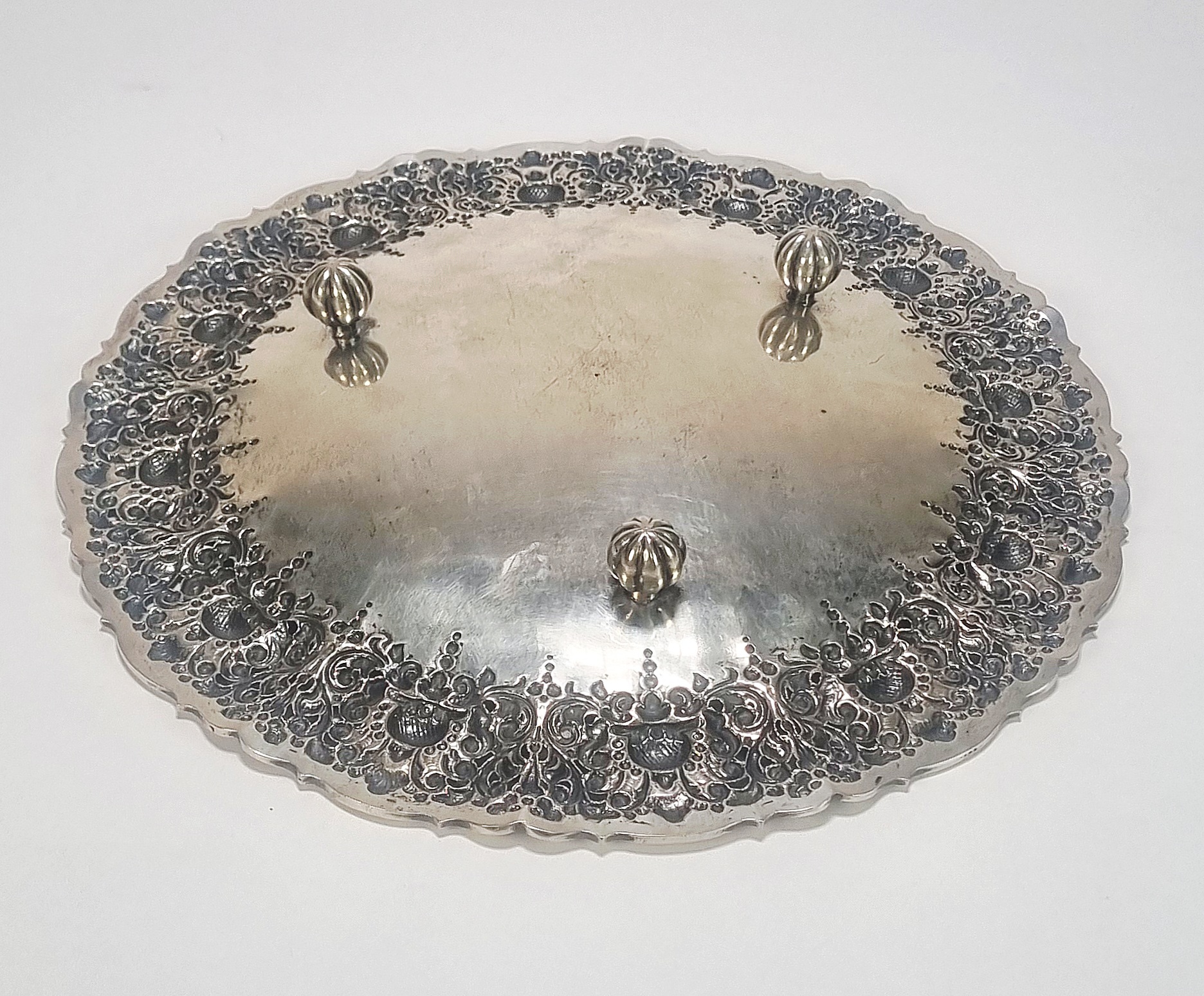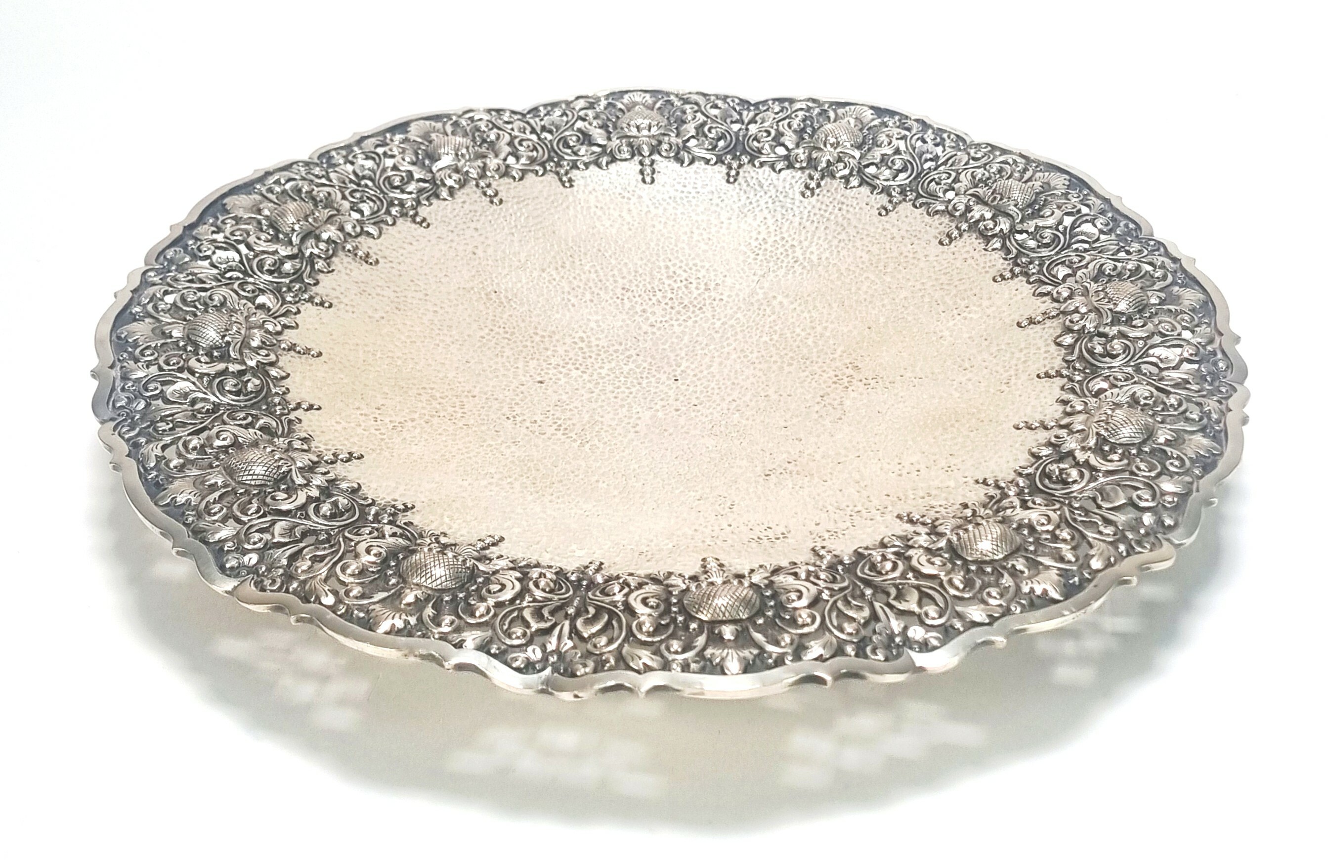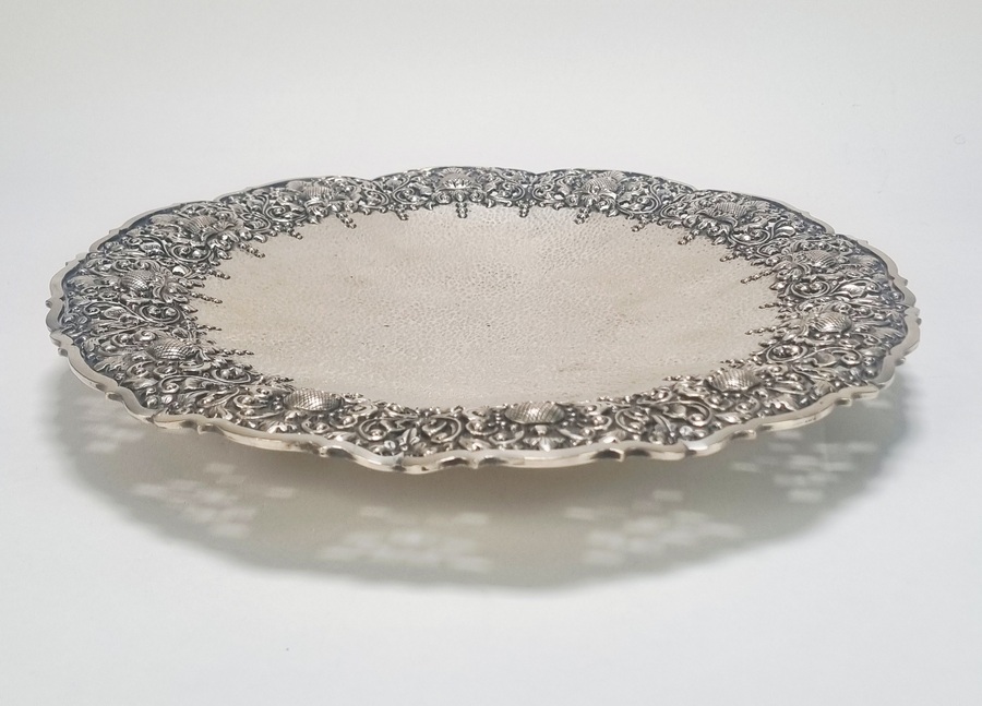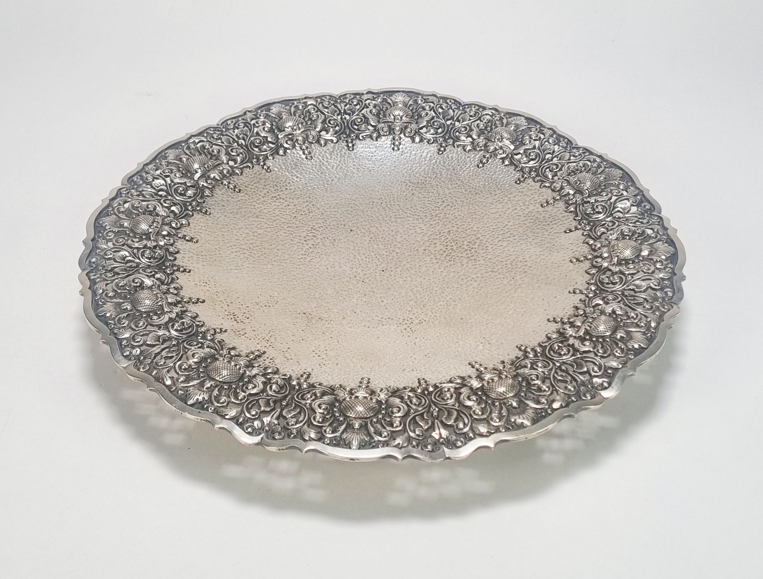 Schaal van uit de koloniale periode, circa 1930, vervaardigd uit 800/1000 Djokja zilver. De ronde schaal toont een decoratie van tropische vruchten en florale motieven langs de geschulpte rand. Het centrum is voorzien van een fijn gehamerd fond. De onderzijde is gemerkt met het meesterteken AD en het gehalte 800. De schaal heeft een herkomst in Java, Nederlands-Indië. Wil je direct deelnemen? Plaats vanaf 3 april alvast een schriftelijk bod via onze website! |