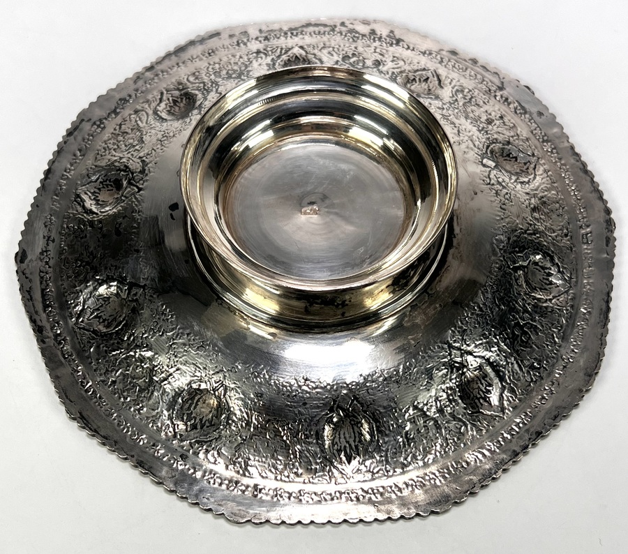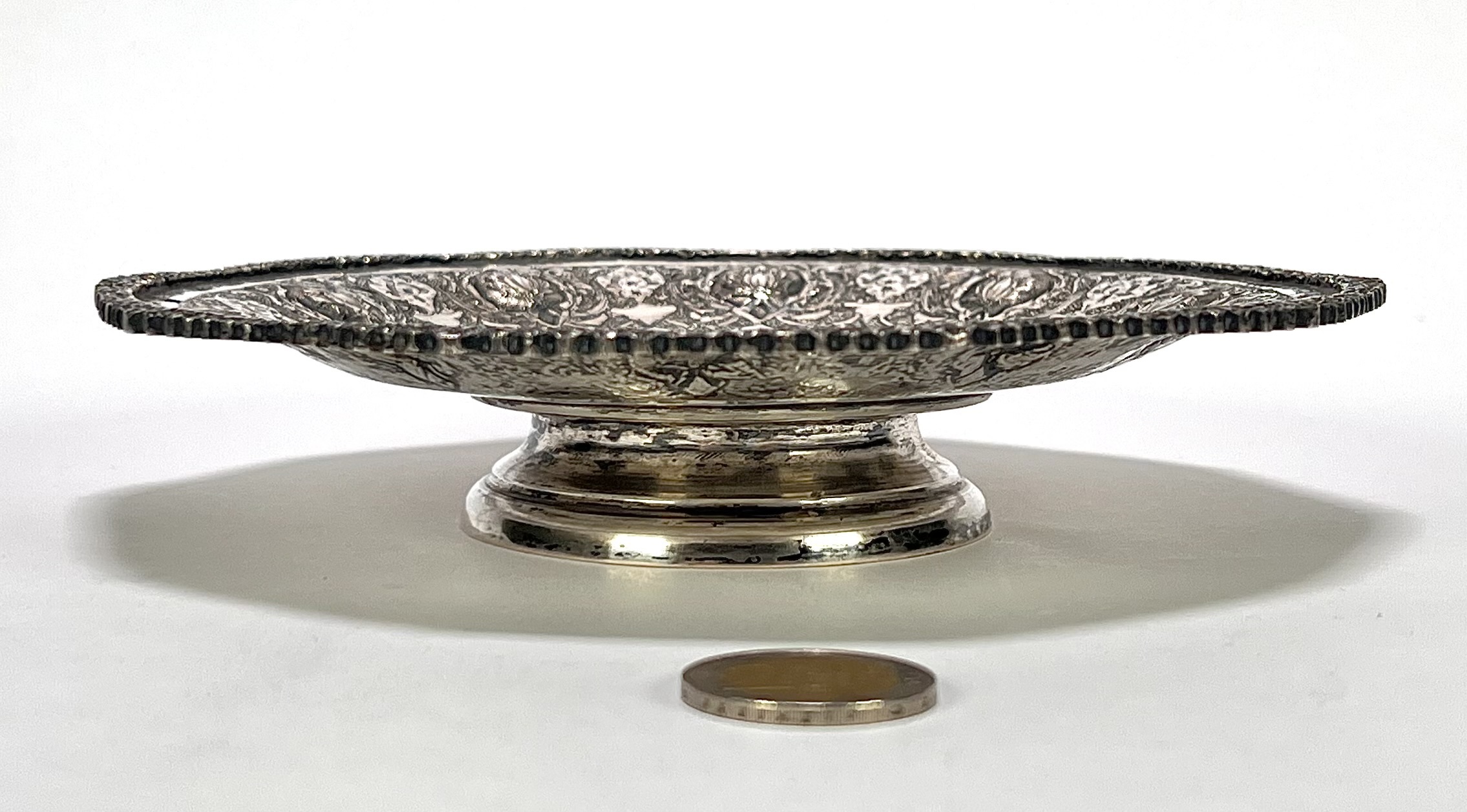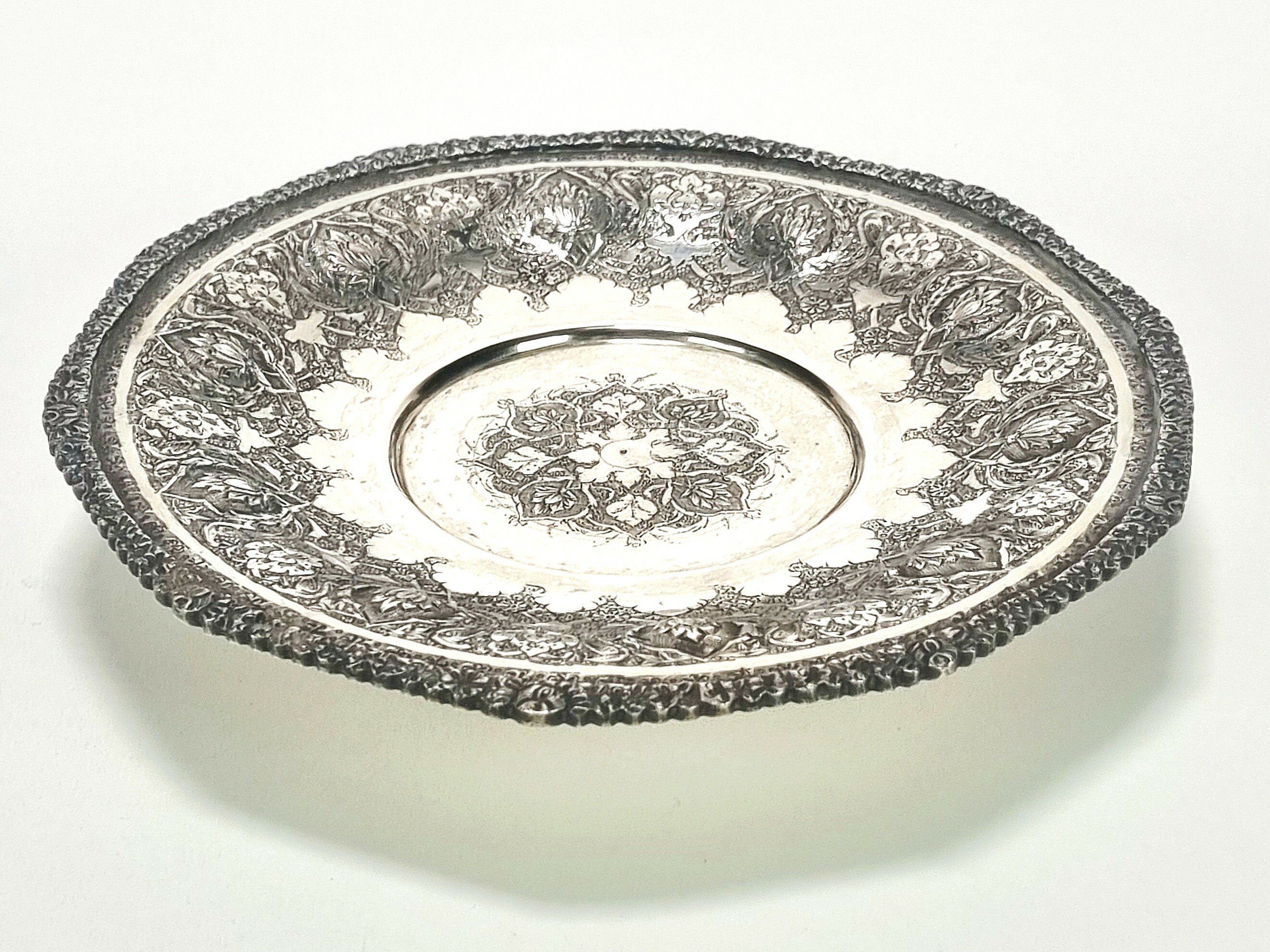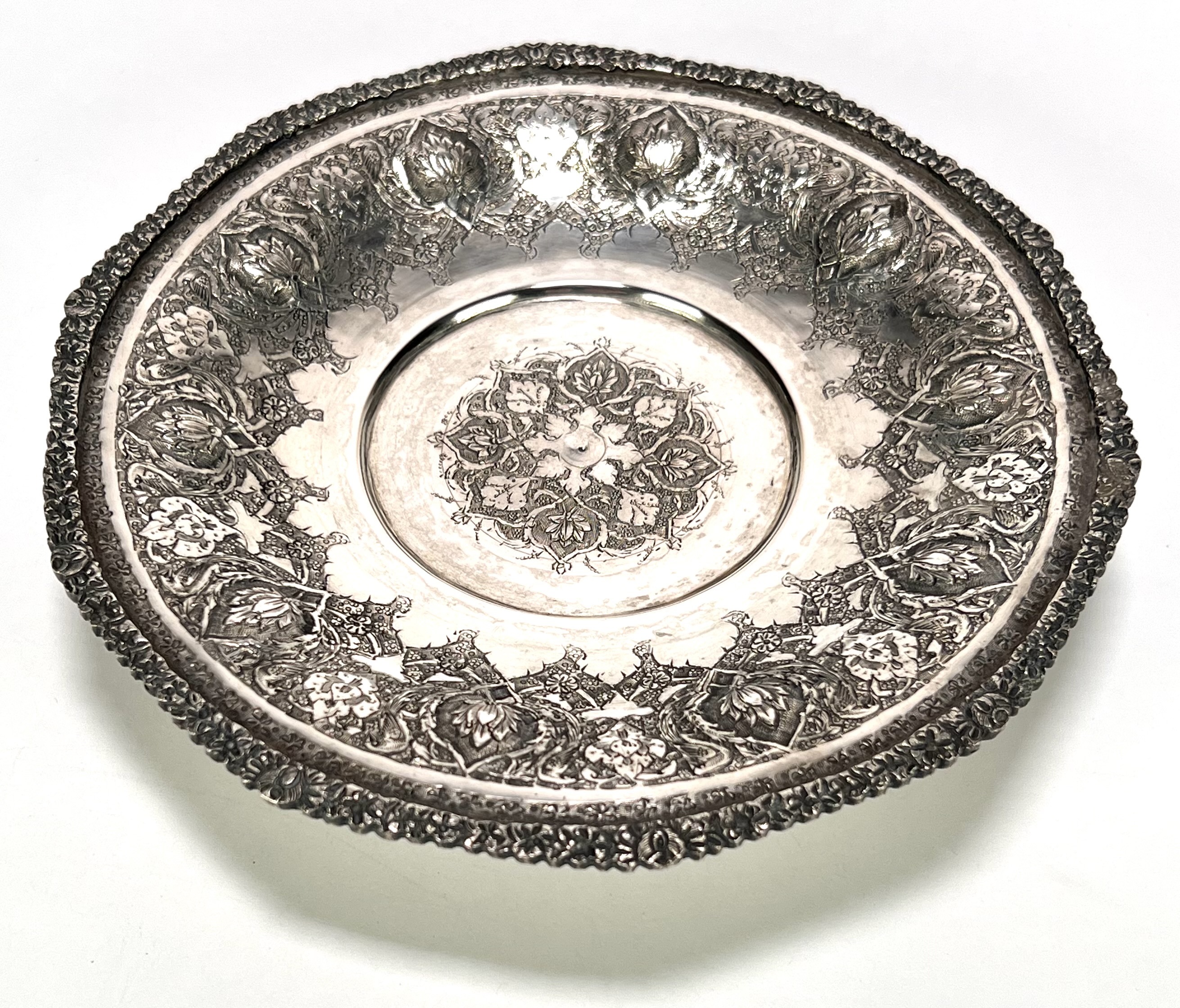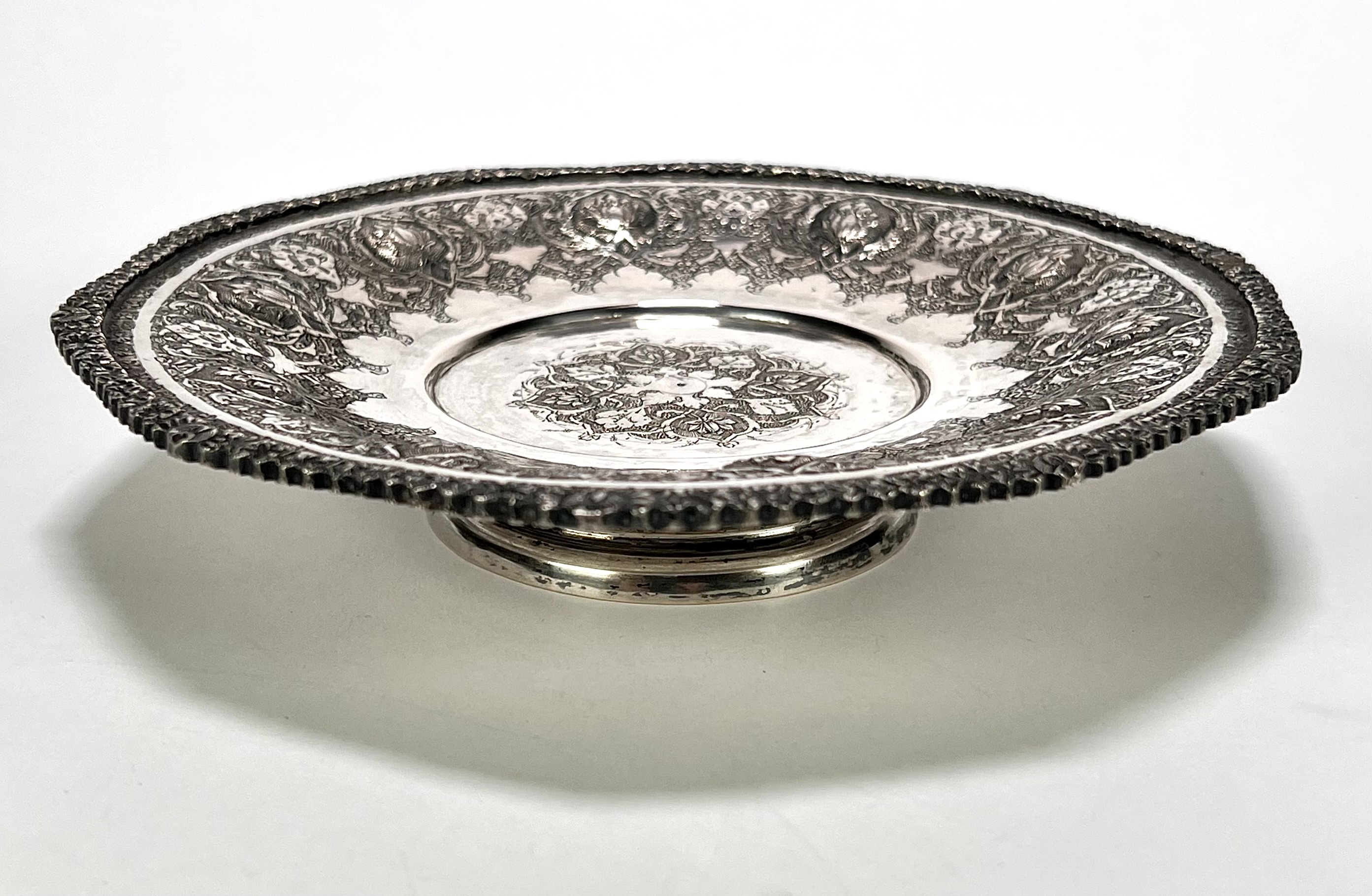 Zilveren schaal op voet met Ghalam-zani decor - Iran, midden 20e eeuw