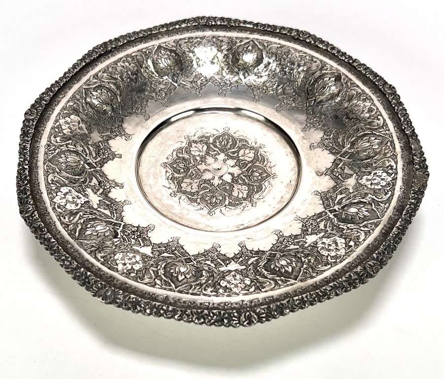 | Kavelnummer en naam | 1323. Zilveren schaal op voet met Ghalam-zani decor - Iran, midden 20e eeuw | |