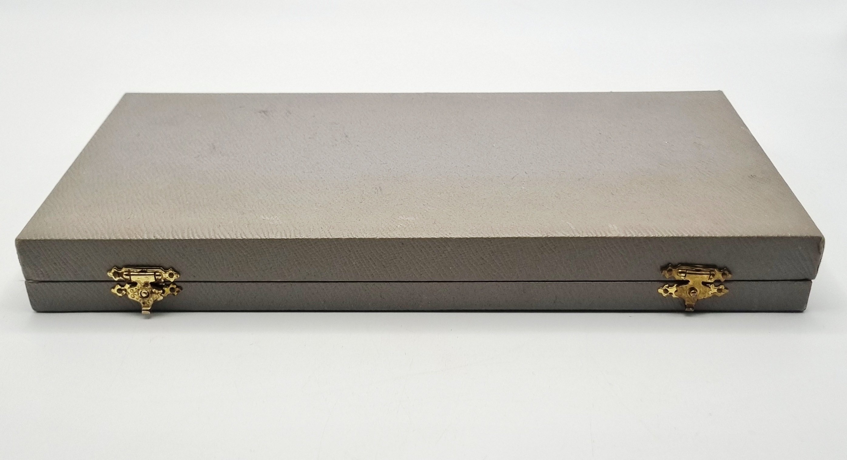 Bestek van Koninklijke Van Kempen & Begeer, omstreeks 1960, vervaardigd uit zilver (835/1000). De 12-delige set theelepels toont getordeerde stelen en gestileerde bekroningen. Gemerkt met het Nederlandse zwaardje en het meesterteken van de zilverfabriek. De set is gepresenteerd in de cassette van Juwelier Repko te Groningen. Herkomst Nederland. Wil je direct deelnemen? Plaats vanaf 3 april alvast een schriftelijk bod via onze website! |