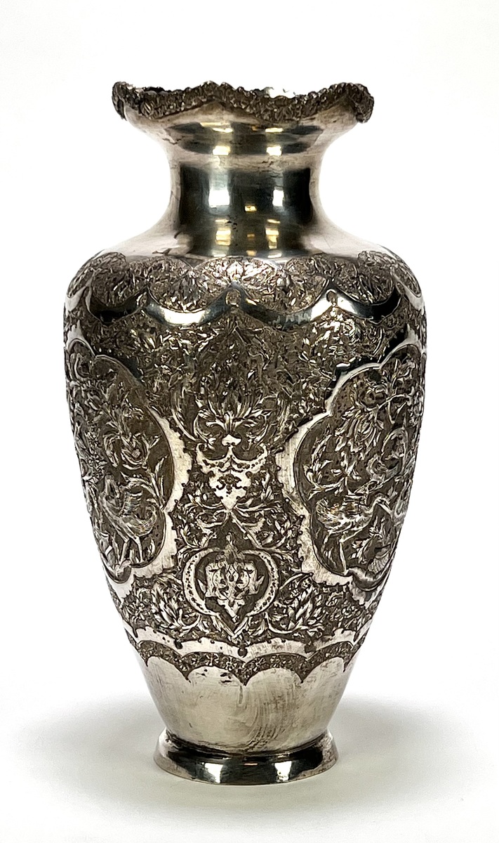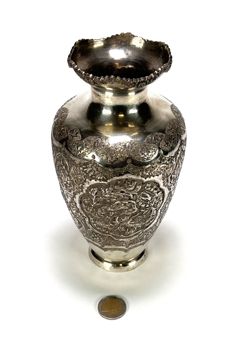 | Kavelnummer en naam | 1053. Zilveren vaas met Gol-o-Morgh decor - Isfahan traditie, Perzië, midden 20e eeuw | |