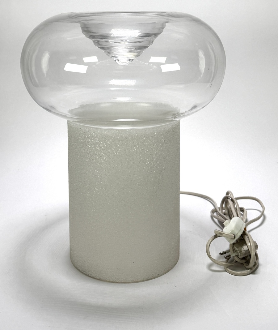 Tafellamp door Olle Alberius voor Orrefors, vervaardigd in helder en gematteerd kristalglas. De lamp toont een cilindrische basis in matglas met een kap in helder glas met een diepe centrale trechtervorm. De lamp dateert uit ca. 1975 en heeft een herkomst in Zweden.