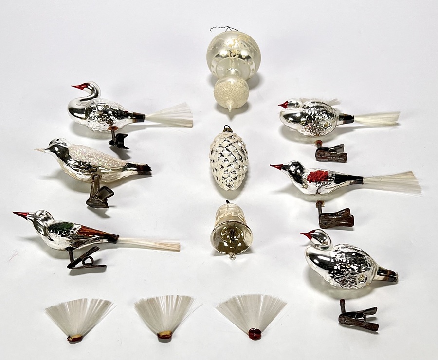 Kerstversiering uit het midden van de 20e eeuw vervaardigd uit mondgeblazen glas met verzilverde binnenzijde en handbeschilderde decors. De verzameling bevat diverse glazen vogels met knijpermonturen en bijbehorende losse staarten van textielvezels, aangevuld met figuratieve ornamenten zoals een klokje, een dennenappel en kerstbal. Datering omstreeks 1940–1960 en een Duitse herkomst, waarschijnlijk vervaardigd in de regio Lauscha.