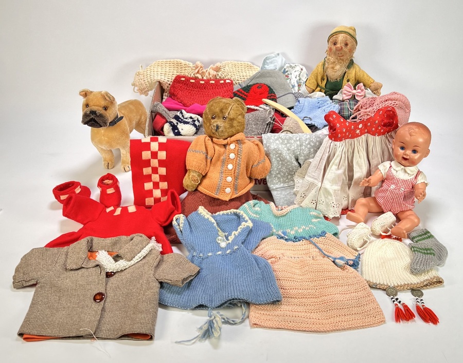 Diverse poppenkleding, knuffels en een pop, vervaardigd uit textiel, composiet en pluche met verschillende technieken. De verzameling bevat onder meer gebreide truitjes, jurken en meerdere speelgoedfiguren waaronder een hond en beertje. Datering tweede helft 20e eeuw en een Europese herkomst.