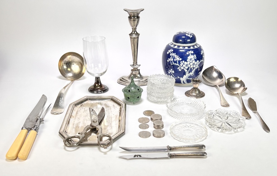 Verzameling van diverse verzilverde tafelaccessoires en curiosa, vervaardigd uit messing, geslepen glas en porselein met diverse technieken. Bestaand uit onder meer een balustervormige kandelaar, een blauw-wit porseleinen gemberpot met floraal decor en verschillende kristallen onderzetters. De verzameling dateert uit de 20e eeuw en heeft een Europese herkomst.