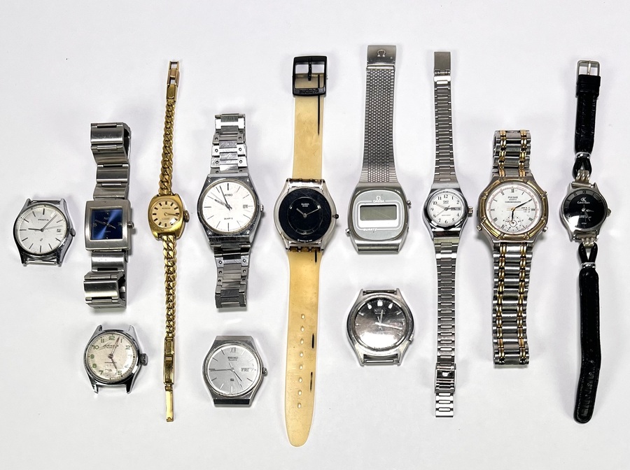 Verzameling van diverse dames -en herenpolshorloges en horlogekasten, vervaardigd uit metaal en kunststof met zowel quartz als mechanische uurwerken. De kavel bevat uiteenlopende modellen, waaronder exemplaren met stalen schakelbanden en lederen riemen in verschillende kleurstellingen. Daterend uit de late 20e eeuw en een Europese herkomst.