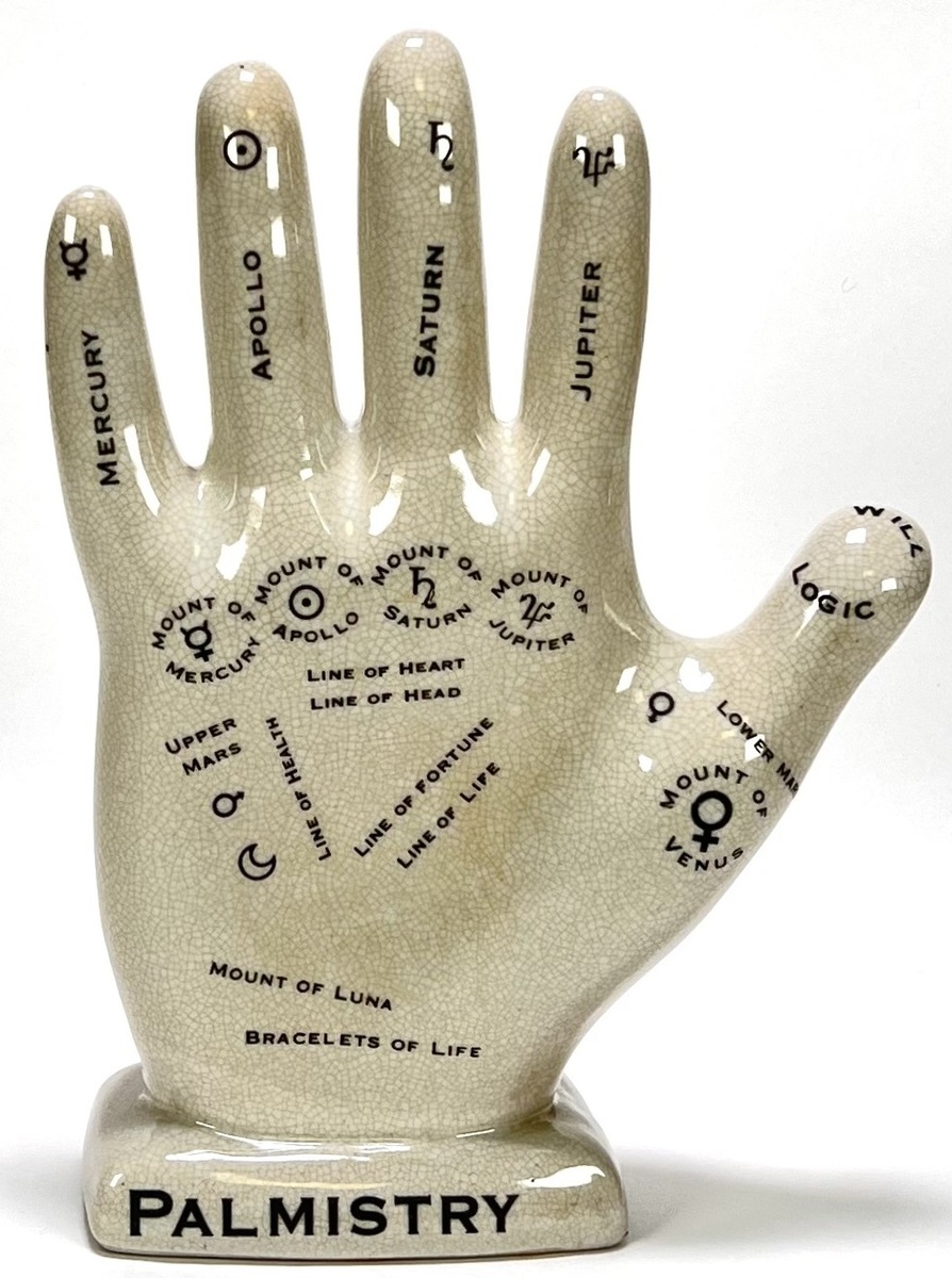 Beeld vervaardigd uit geglazuurd aardewerk met zwarte transferdruk op een crèmekleurige ondergrond. Het model in de vorm van een rechterhand toont diverse chiromantische lijnen en astrologische symbolen, waaronder de planeten op de vingertoppen. De vormgeving is ontleend aan historische handlijnkunde modellen. Datering eind 20e eeuw en een Britse herkomst.