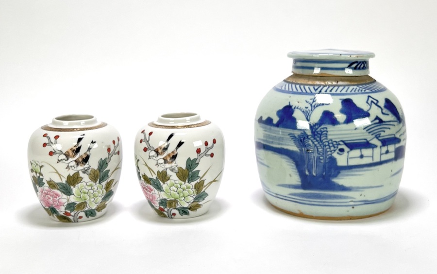 Porseleinen gemberpotten bestaande uit een grote Chinese gemberpot en een paar kleine Japanse Kutani gemberpotten. De grotere gemberpot toont een rivierlandschap in onderglazuur blauw, de kleinere gemberpotten zijn gedecoreerd met vogels en bloemen. Daterend late negentiende en de twintigste eeuw.