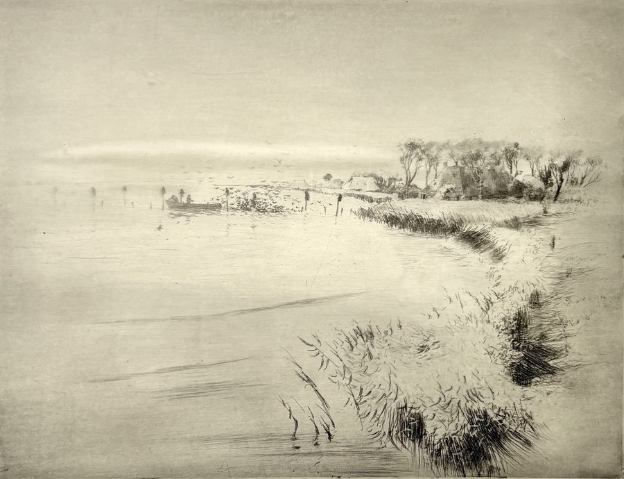 Ets door Abe Gerlsma (1919–2012), uitgevoerd in zwart-wit op papier, toont het Friese meer De Fluessen met een vissersboot en boerderij. Met potlood gesigneerd en getiteld. De ets dateert uit circa 1981 en heeft een Nederlandse herkomst.
