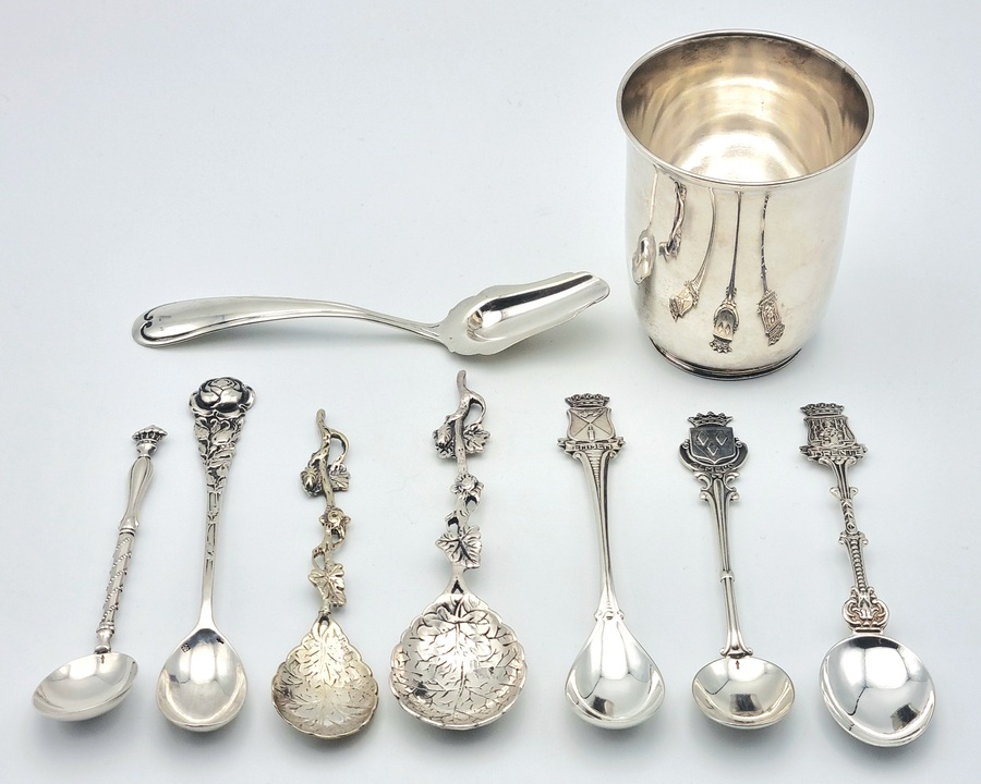 Zilveren lepels en lepelvaasje van verschillende makers, vervaardigd uit 835/1000 zilver. De verzameling omvat acht uiteenlopende lepels met gedreven floraal decor en figuratieve bekroningen, aangevuld met een conisch lepelvaasje. Gemerkt met diverse Nederlandse zilvermerken, datering 20e eeuw.