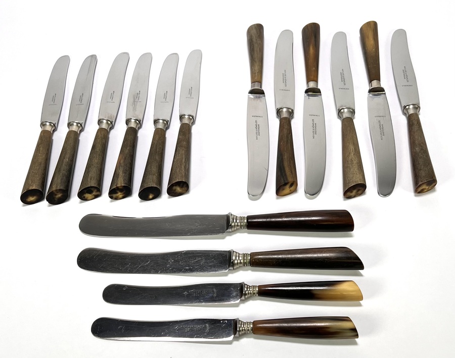 Bestek van Richard Abraham Herder, vervaardigd uit gesmeed staal met heften van gepolijst hoorn. De set omvat zes grote en zes kleine messen, aangevuld met vier botermessen in twee formaten. Elk exemplaar toont de karakteristieke natuurlijke kleurnuances van het hoorn. De lemmeten zijn voorzien van de fabrieksstempel uit Solingen. Het bestek dateert uit het begin van de 20e eeuw en heeft een Duitse herkomst.