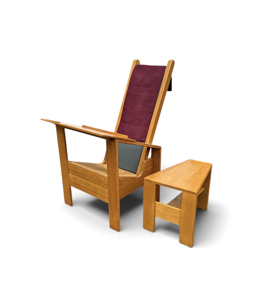 Fauteuil en bijzettafel door Wim Mulder voor Meubelatelier Allerhande in eigentijdse ambachtelijke stijl, vervaardigd uit massief eikenhout. De set omvat een Sedes 6000 fauteuil met een kussen en twee verschillende kussenhoezen, een bijpassende trapeziumvormige bijzettafel en een houten lessenaar op de armleuning. De meubels dateren uit de vroege 21e eeuw en hebben een Nederlandse herkomst.